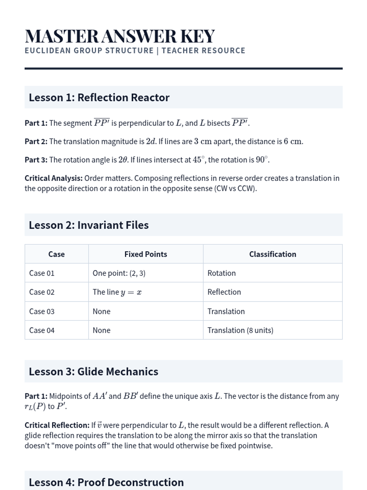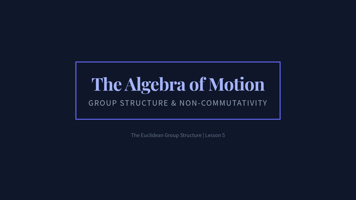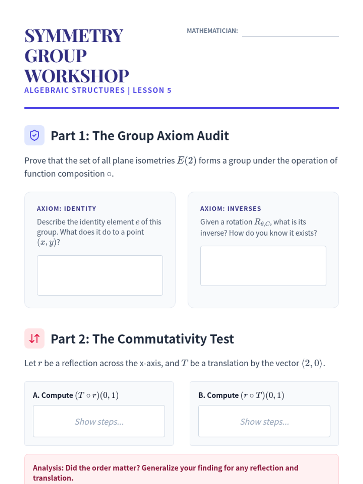 This advanced geometry sequence explores the algebraic structure of the Euclidean Group, focusing on reflections as generators and the classification of all plane isometries. Students will move from geometric constructions to formal group theory, culminating in the Three Reflections Theorem and non-commutative properties.