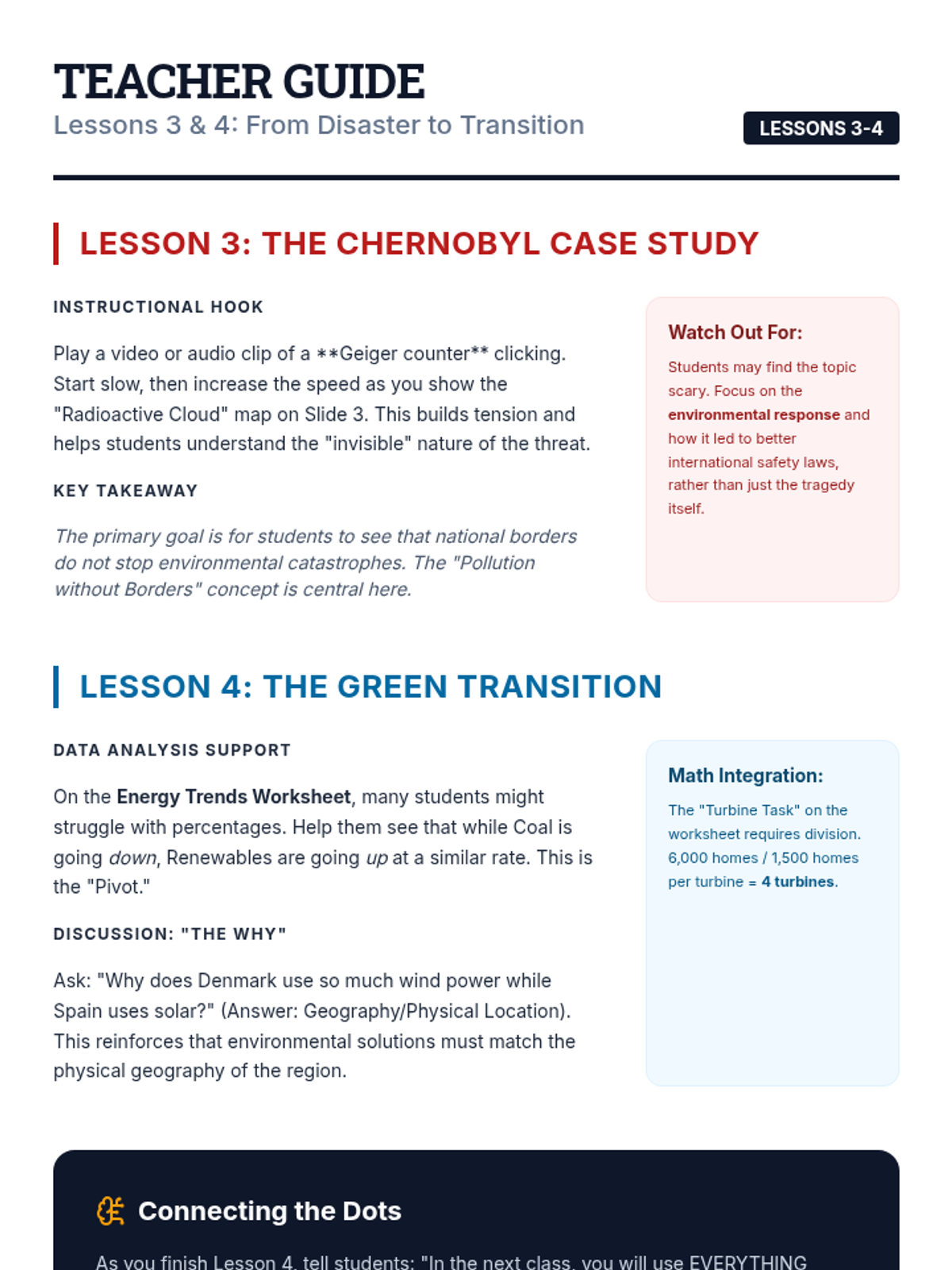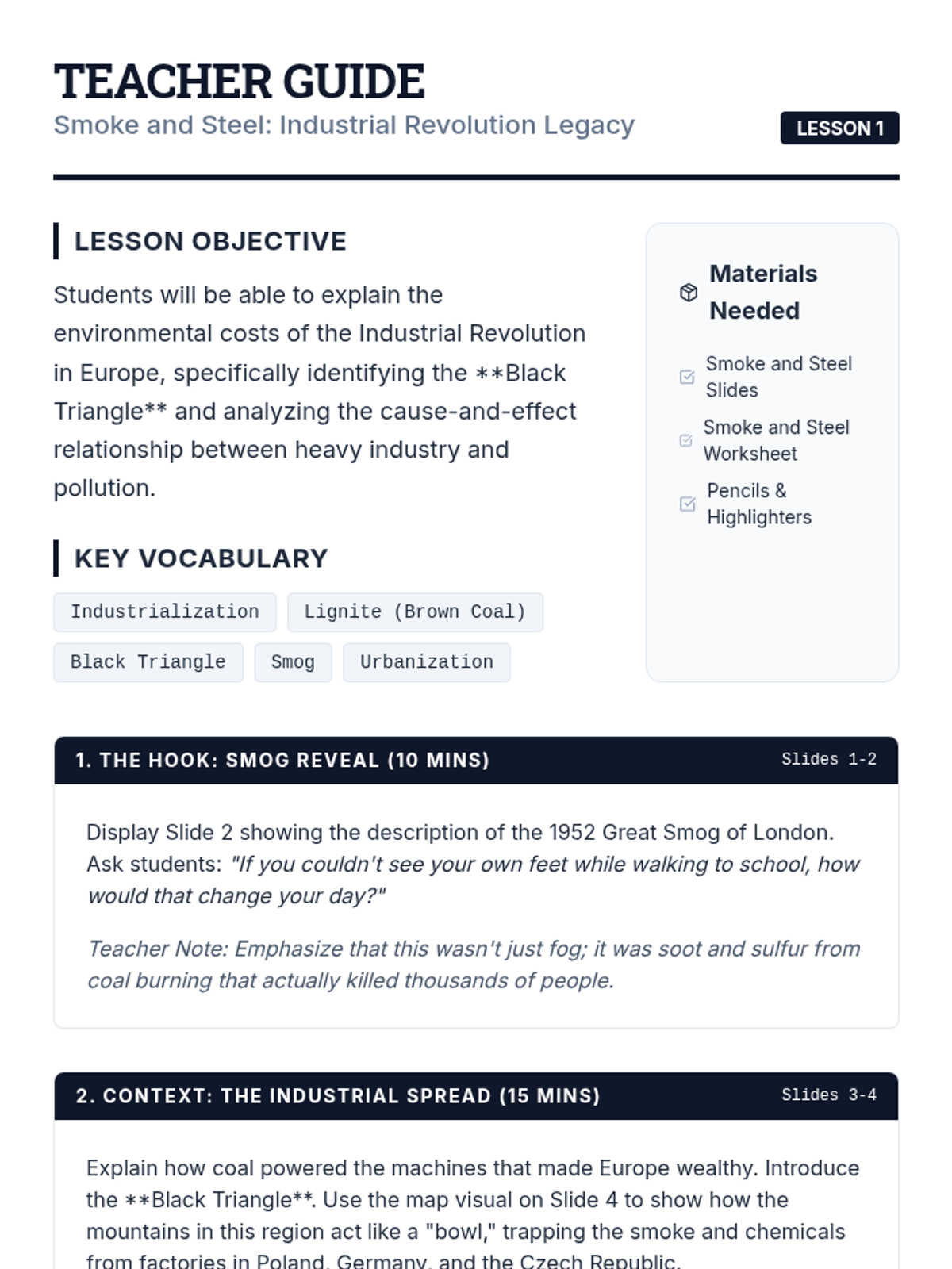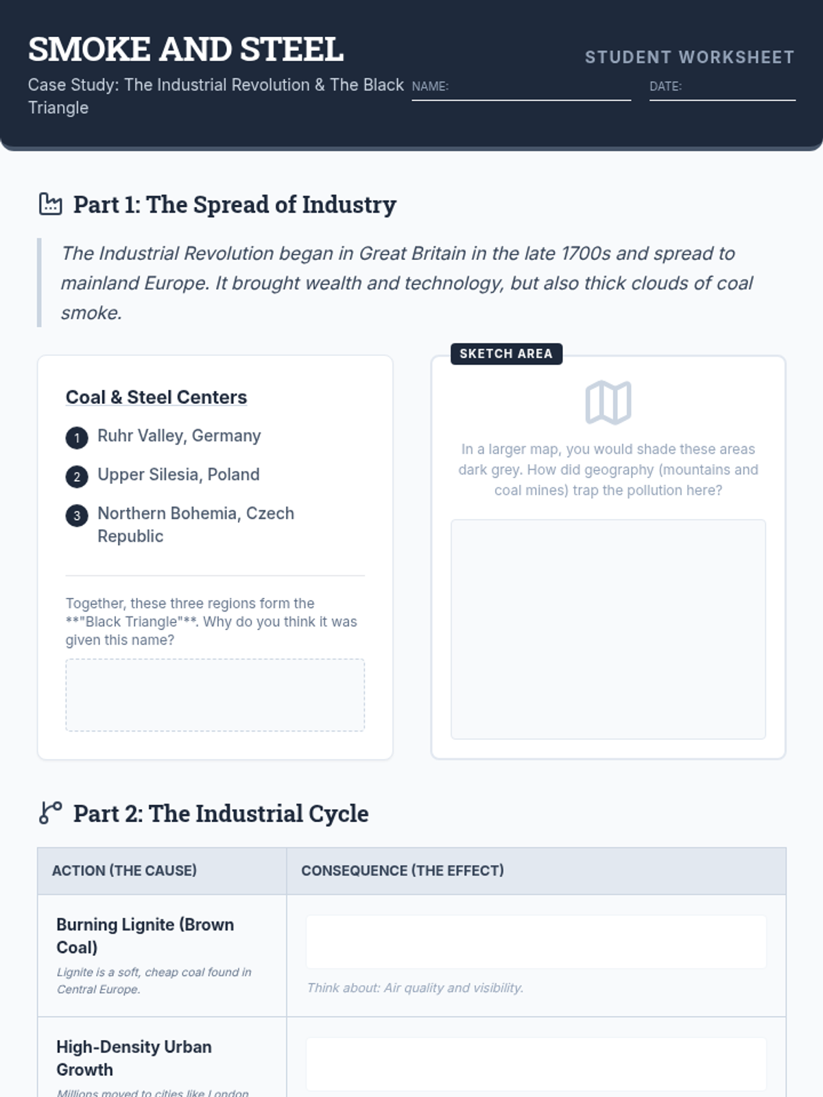 This sequence explores the environmental impact of Europe's industrialization, from historical coal-heavy zones like the Black Triangle to the modern shift toward renewable energy. Students analyze transboundary pollution through case studies on acid rain and the Chernobyl disaster, concluding with a debate on the European Green Deal.