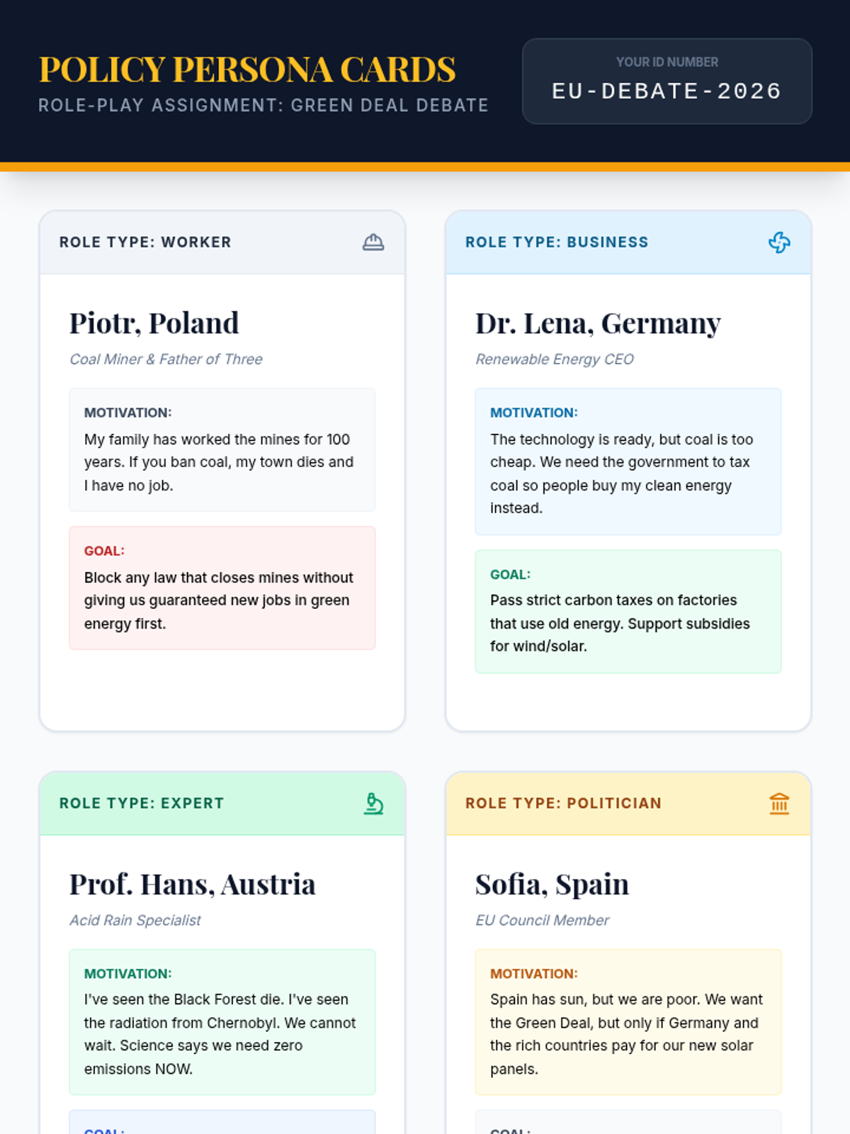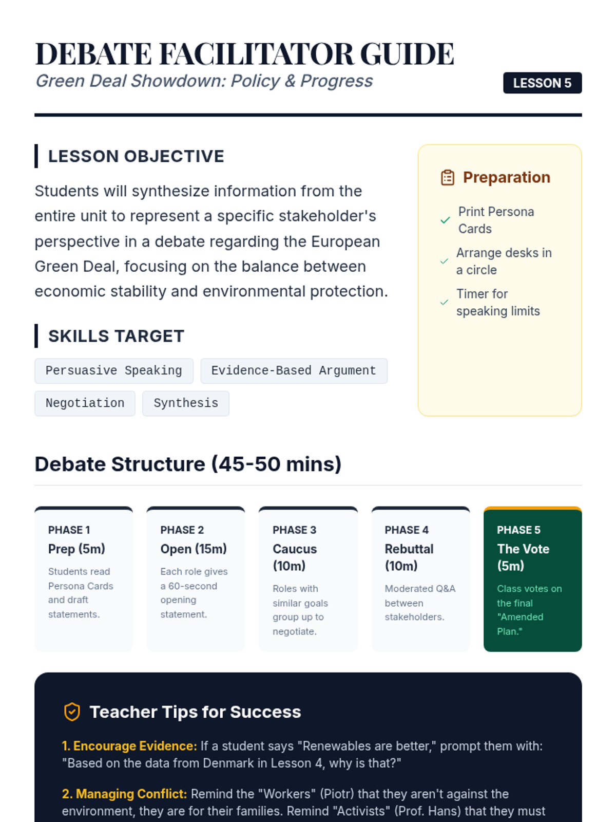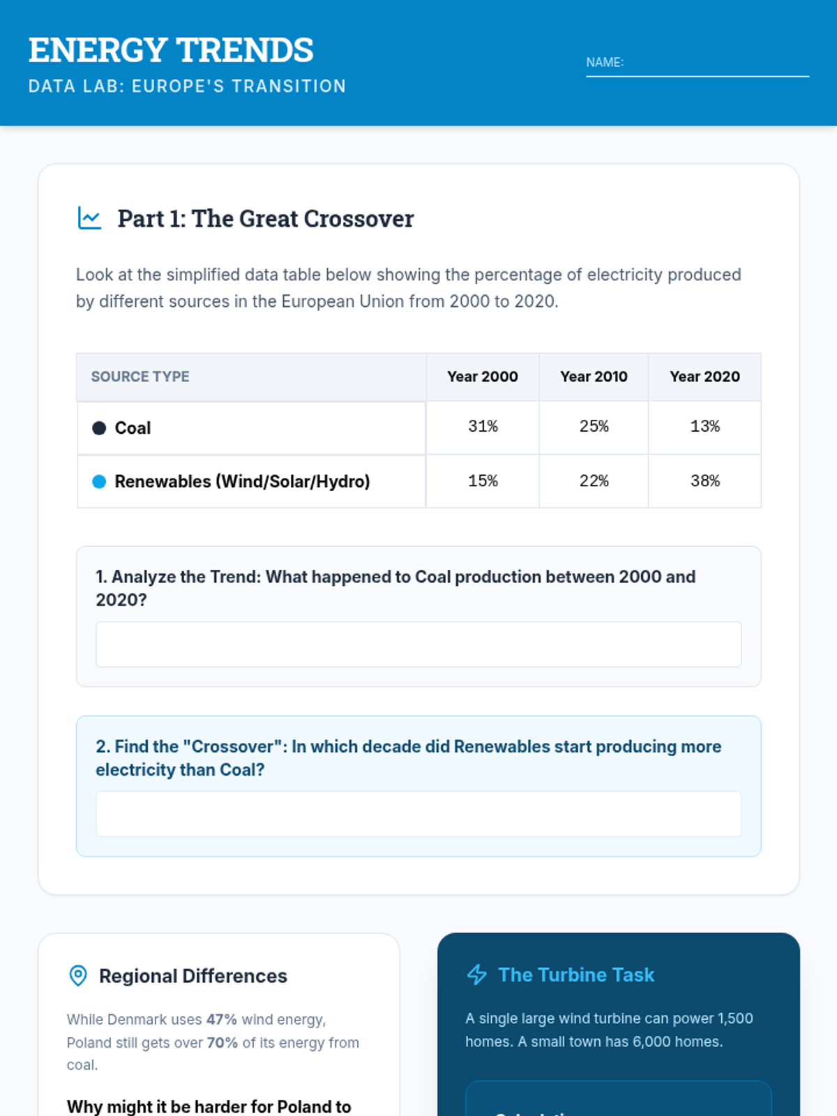 This sequence explores the environmental impact of Europe's industrialization, from historical coal-heavy zones like the Black Triangle to the modern shift toward renewable energy. Students analyze transboundary pollution through case studies on acid rain and the Chernobyl disaster, concluding with a debate on the European Green Deal.