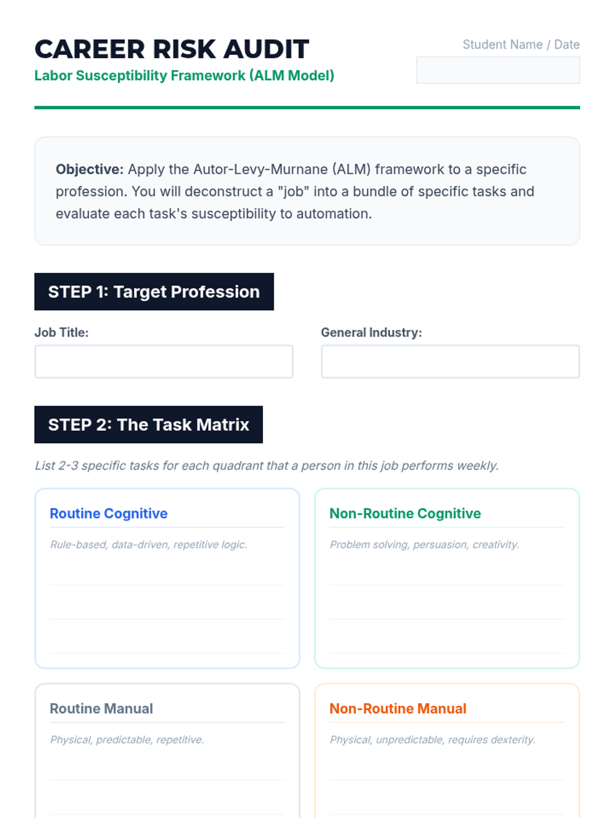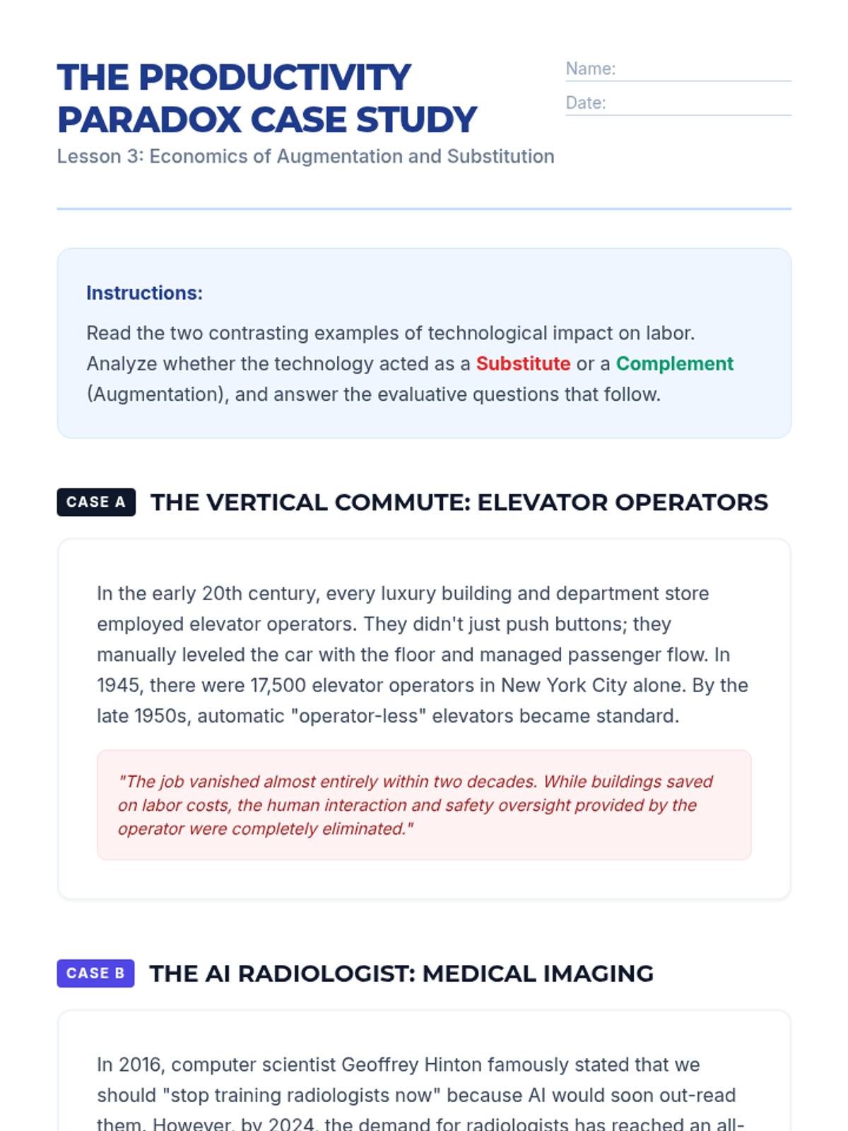 This sequence investigates the impact of automation, robotics, and artificial intelligence on workforce demand and skill requirements. Students perform sophisticated task-level analyses, distinguishing between substitution and complementarity while developing strategic workforce plans for a disrupted future.