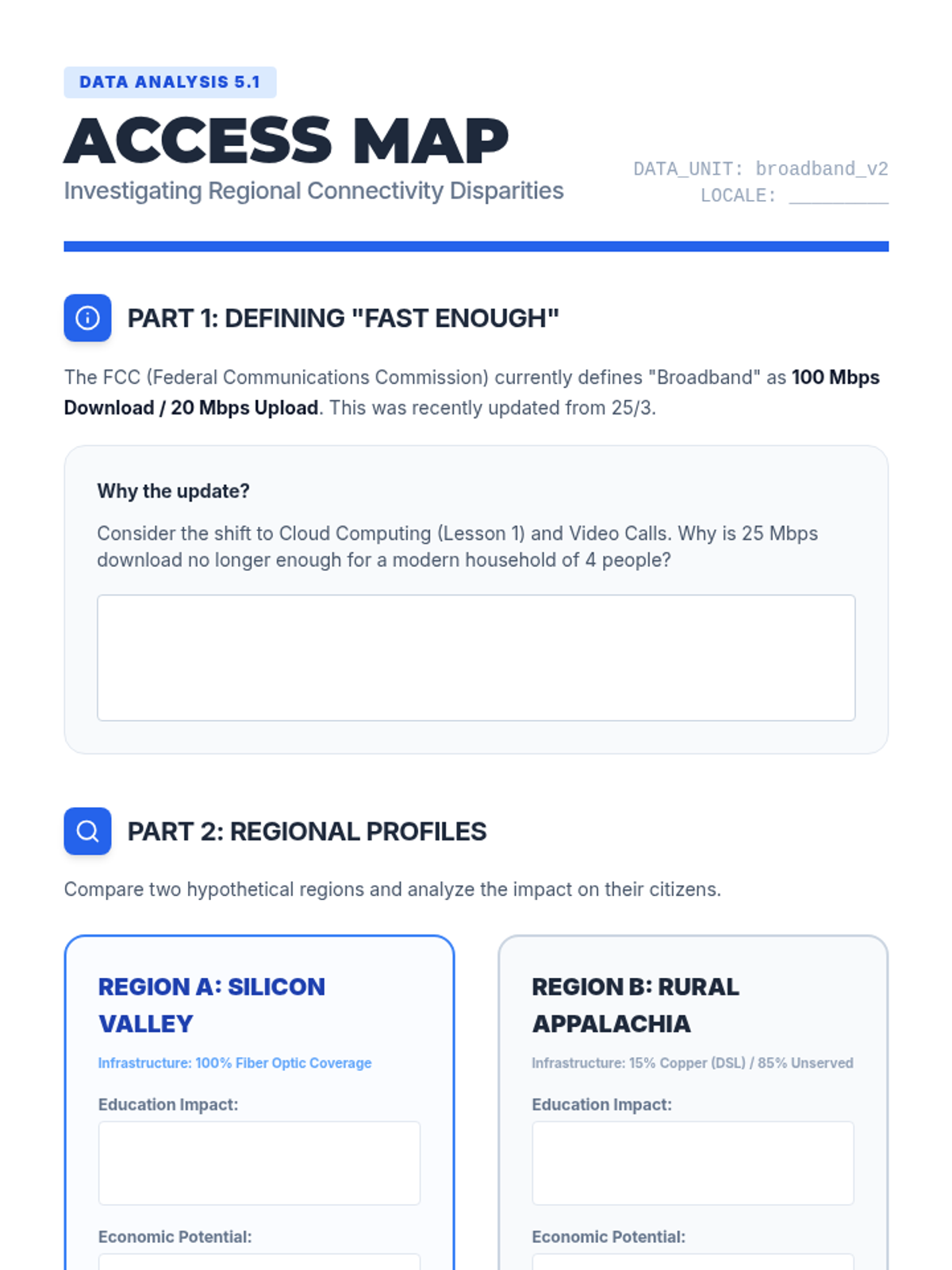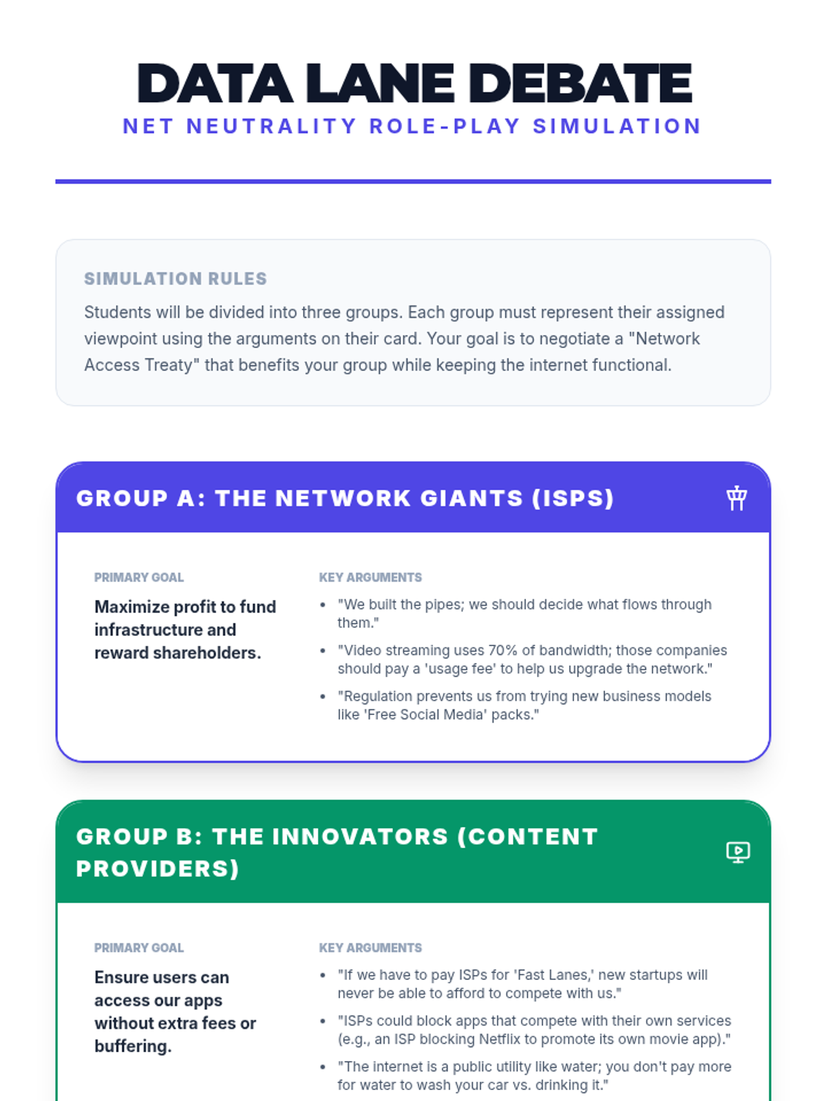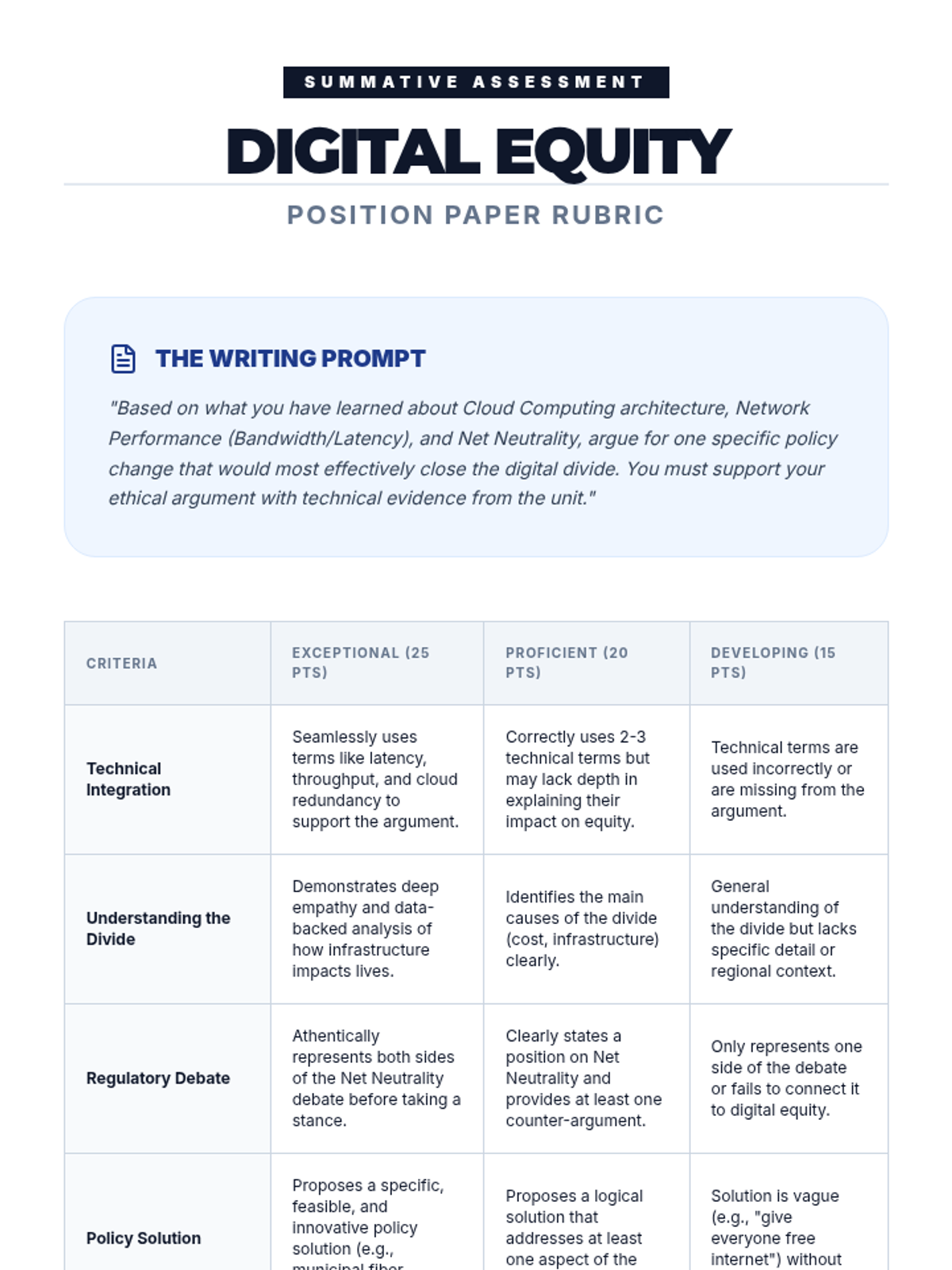 This sequence explores the technical and ethical dimensions of modern networking, from the shift to cloud computing and IoT to the critical societal issues of net neutrality and the digital divide. Students analyze network performance, design secure smart devices, and debate the future of internet equity.