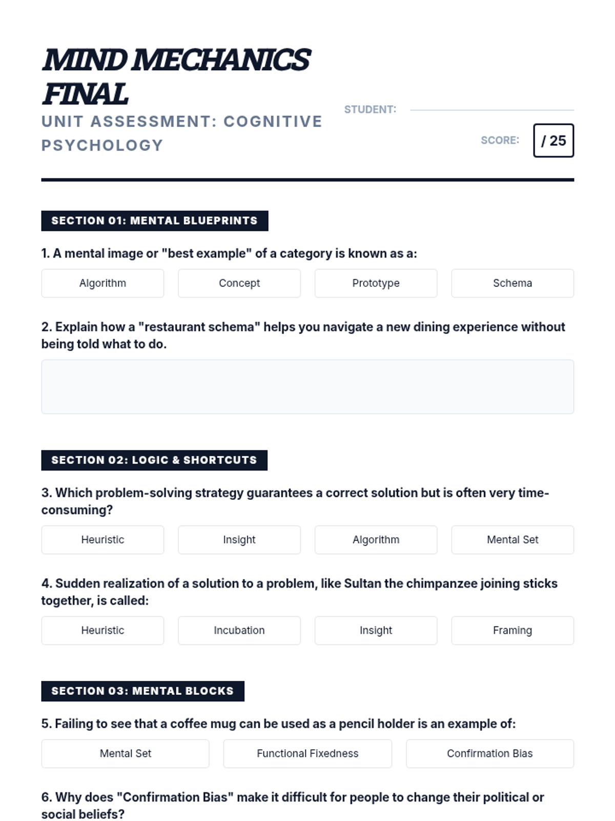 A deep dive into higher-order cognitive processes, exploring how the human brain organizes information, solves problems, and falls into systematic traps of irrationality. Students will learn to recognize mental shortcuts, overcome problem-solving obstacles, and analyze the power of framing.