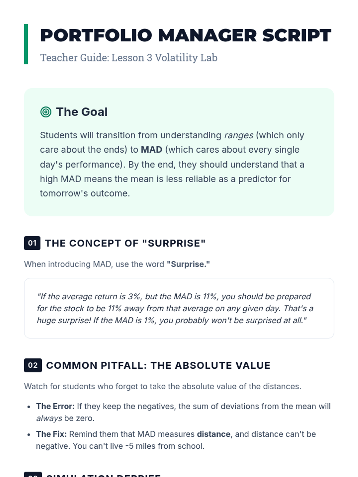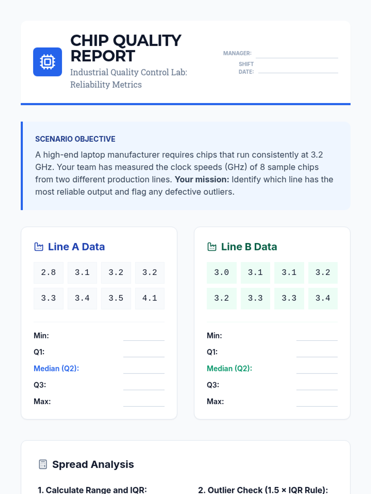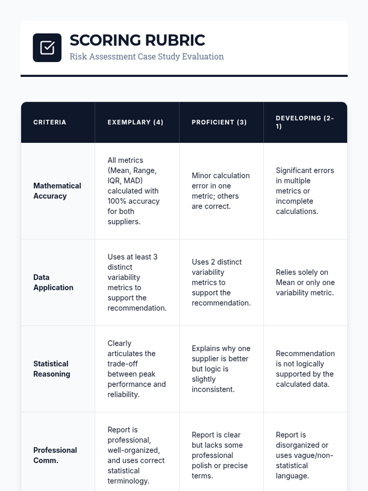 A high school statistics sequence focused on quantifying risk and consistency through measures of variability. Students move from basic spread concepts to complex financial and industrial case studies, culminating in a data-driven risk assessment report.