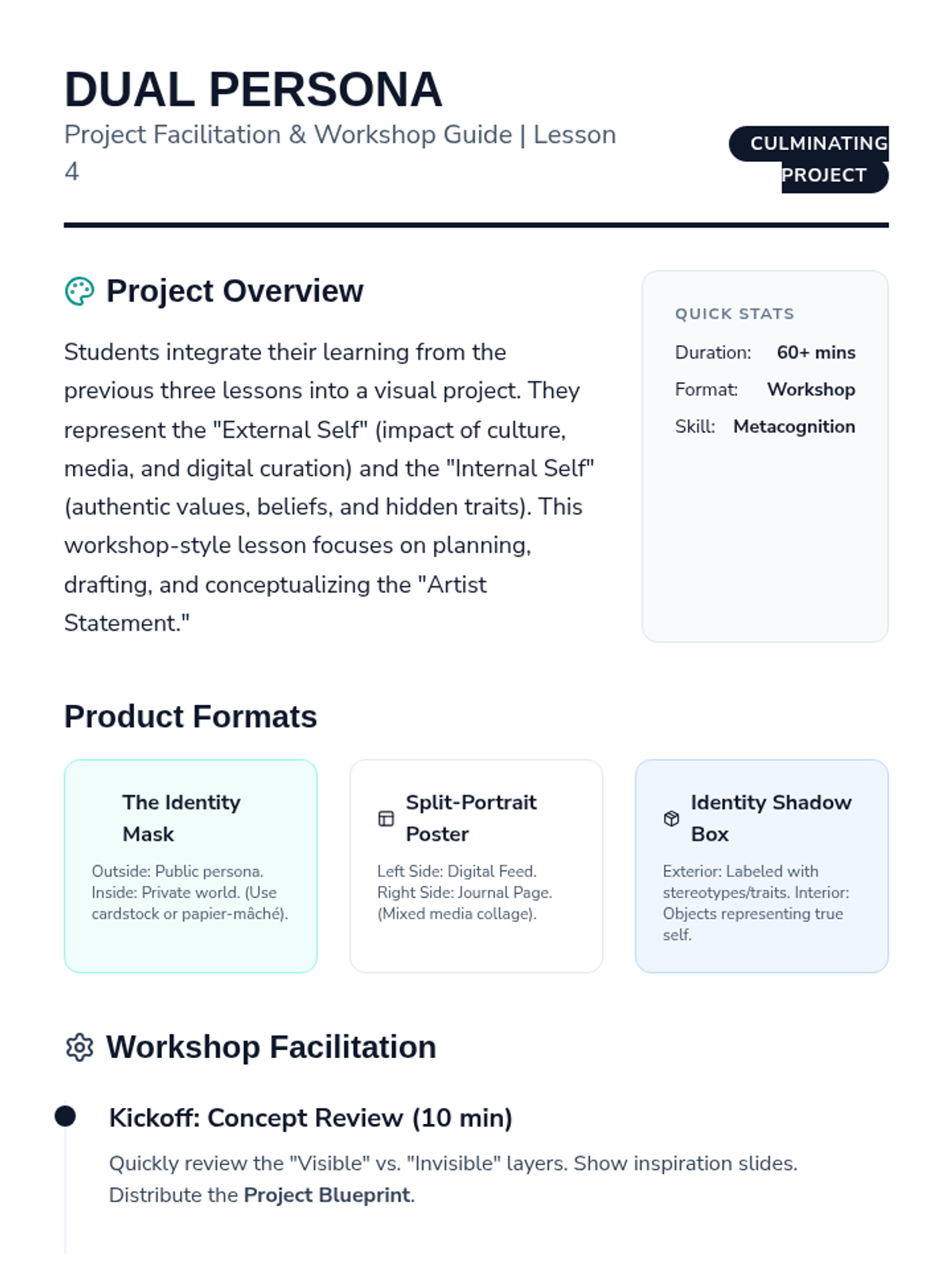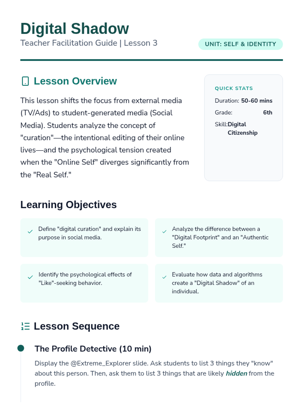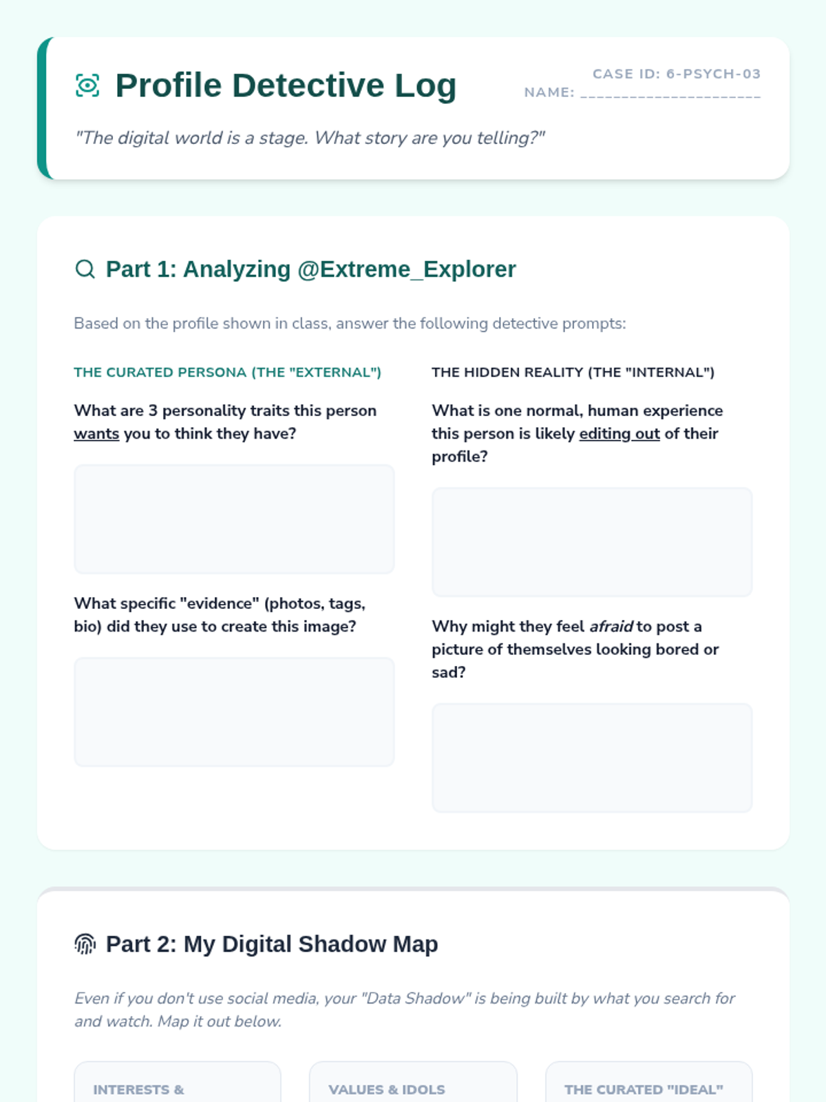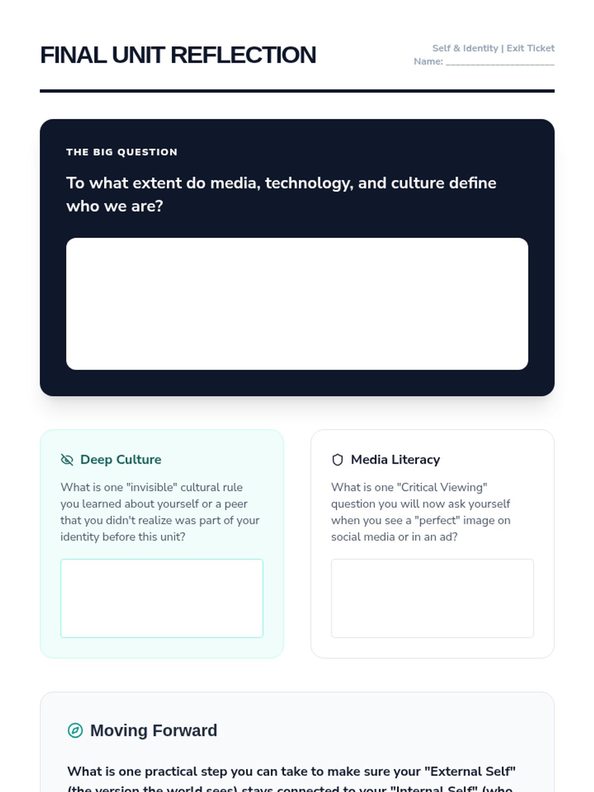 A project-based unit exploring how culture, media, and technology influence 6th graders' self-perception. Students analyze stereotypes, digital curation, and the 'Cultural Iceberg' before creating a 'Dual Identity' project.