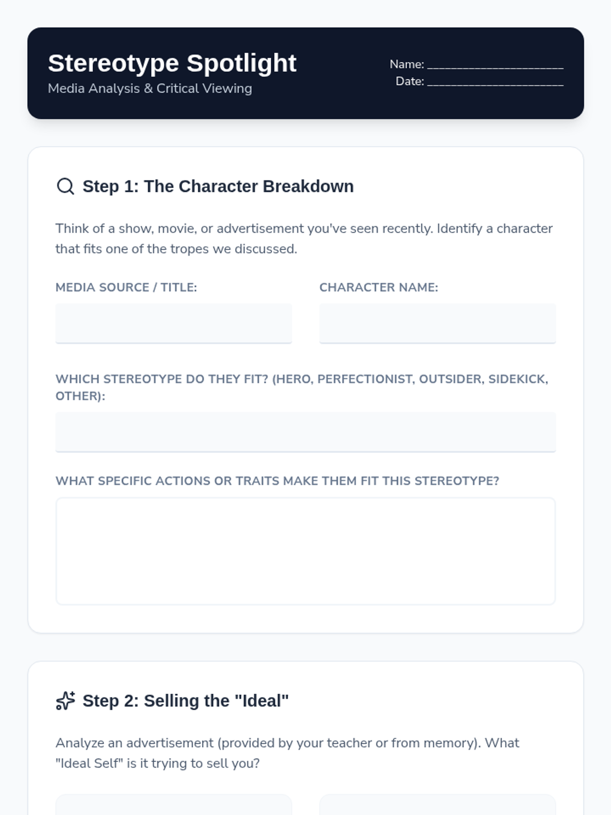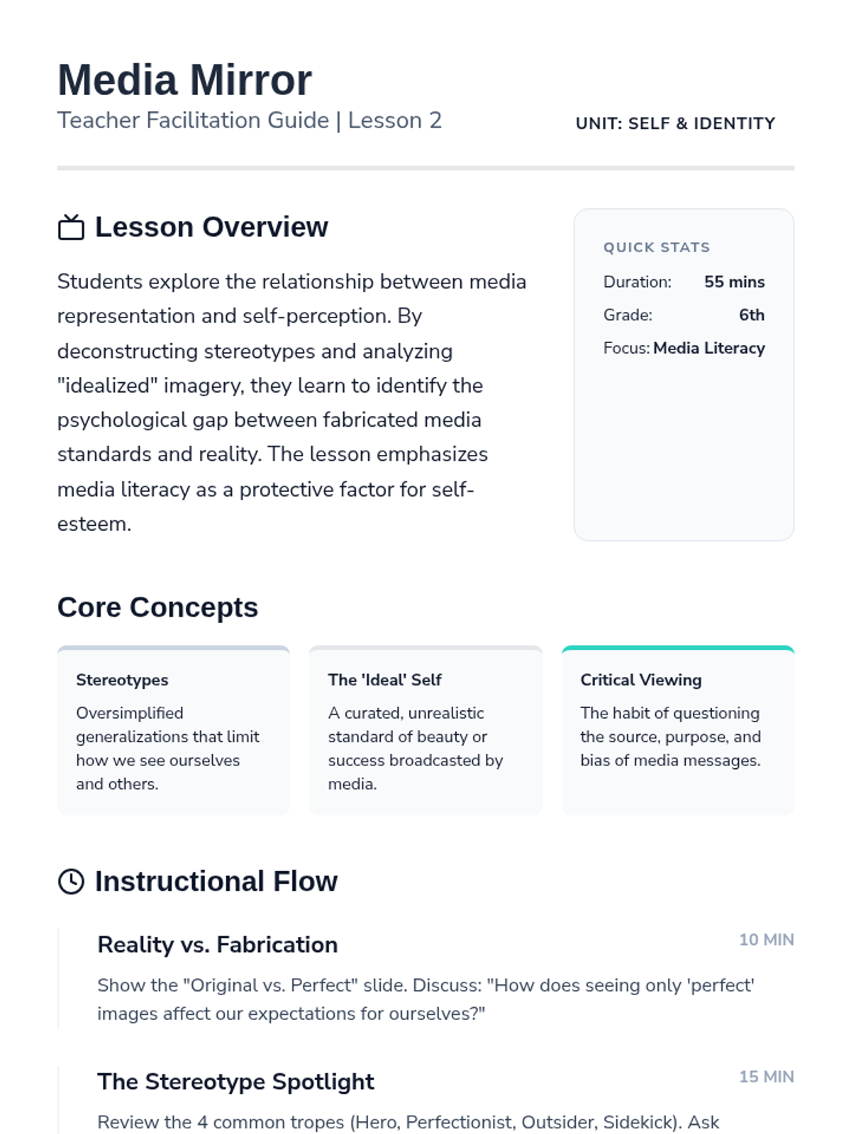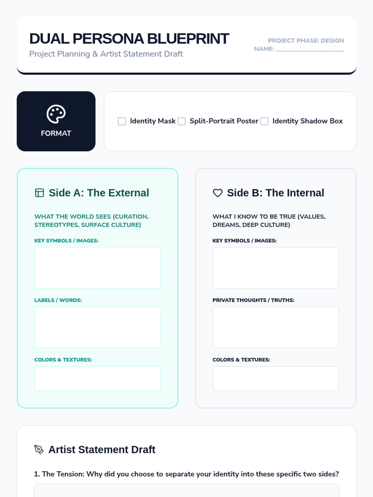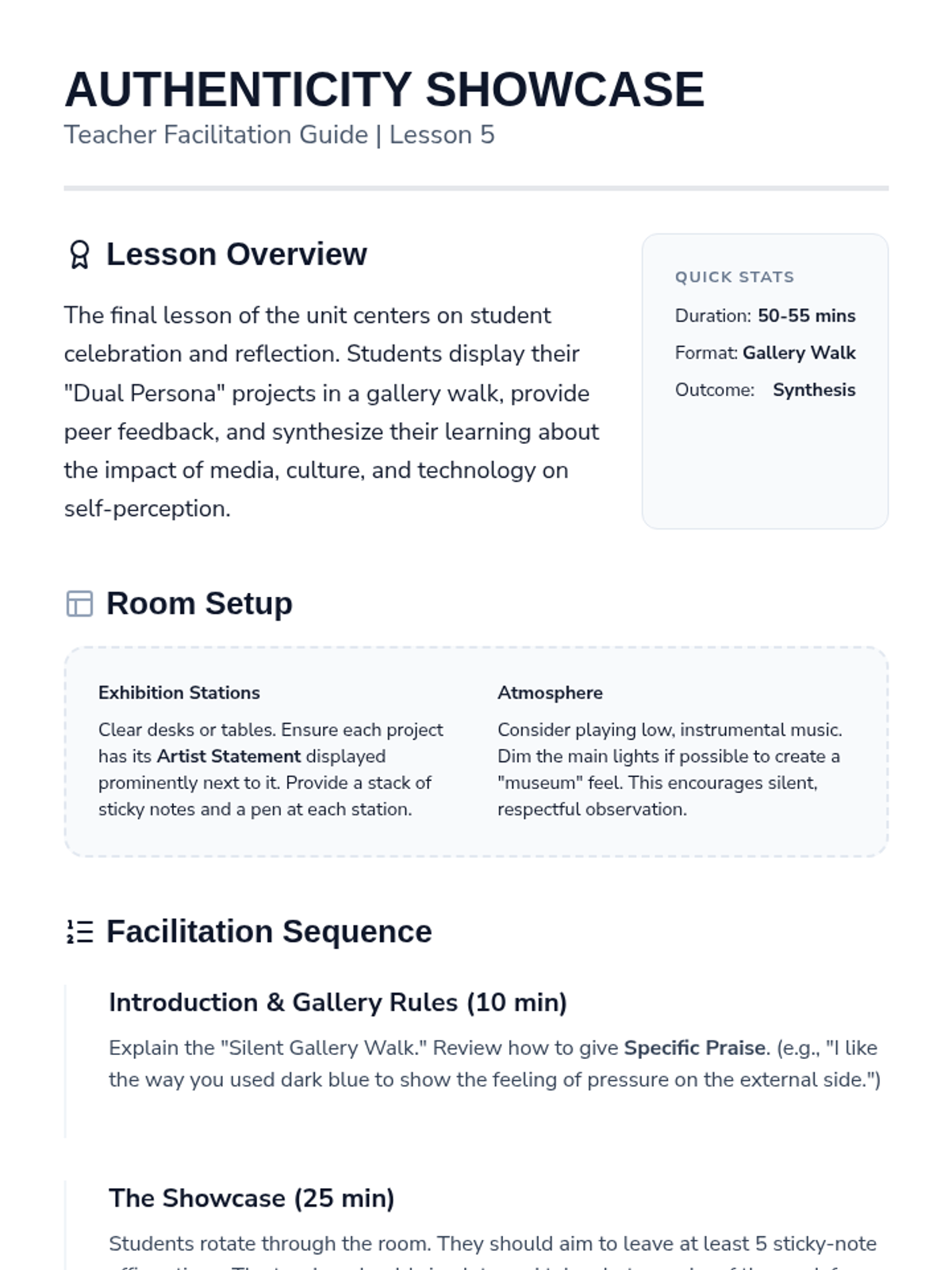 A project-based unit exploring how culture, media, and technology influence 6th graders' self-perception. Students analyze stereotypes, digital curation, and the 'Cultural Iceberg' before creating a 'Dual Identity' project.