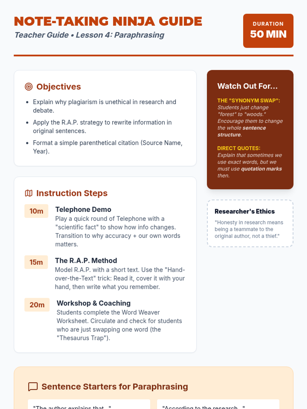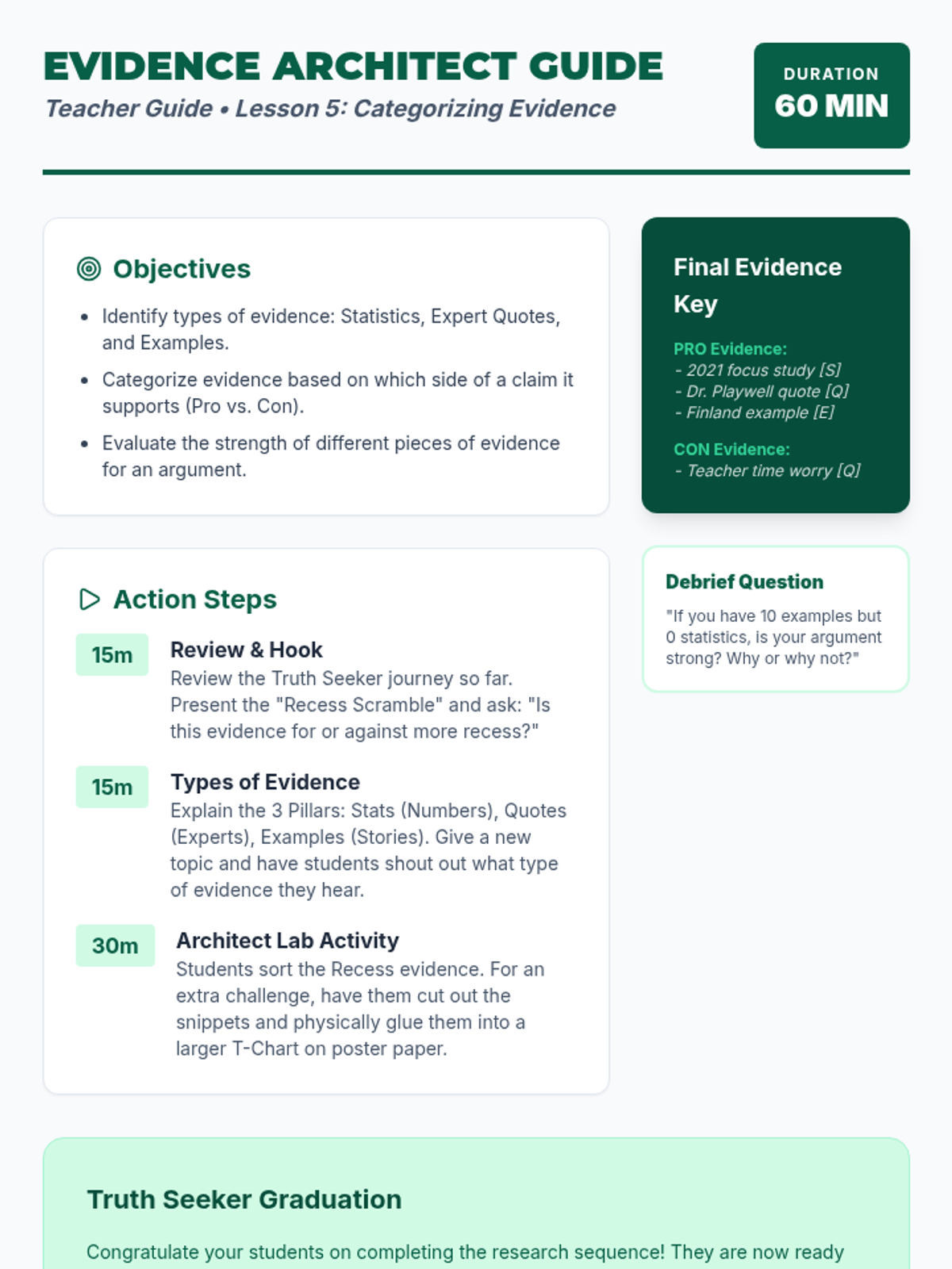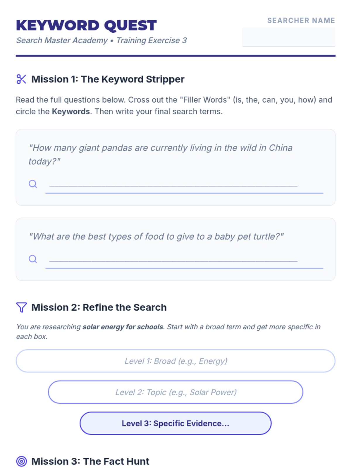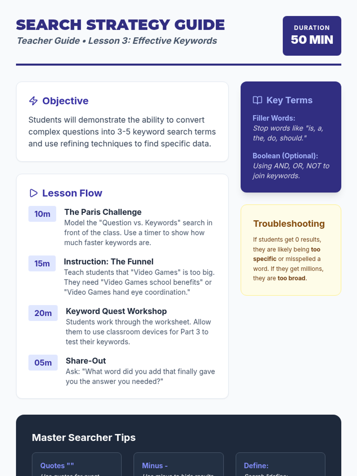 This 4th-grade sequence teaches students how to navigate the digital world as 'Information Detectives.' They learn to differentiate facts from opinions, evaluate website credibility, conduct efficient keyword searches, and ethically paraphrase evidence for use in debates.