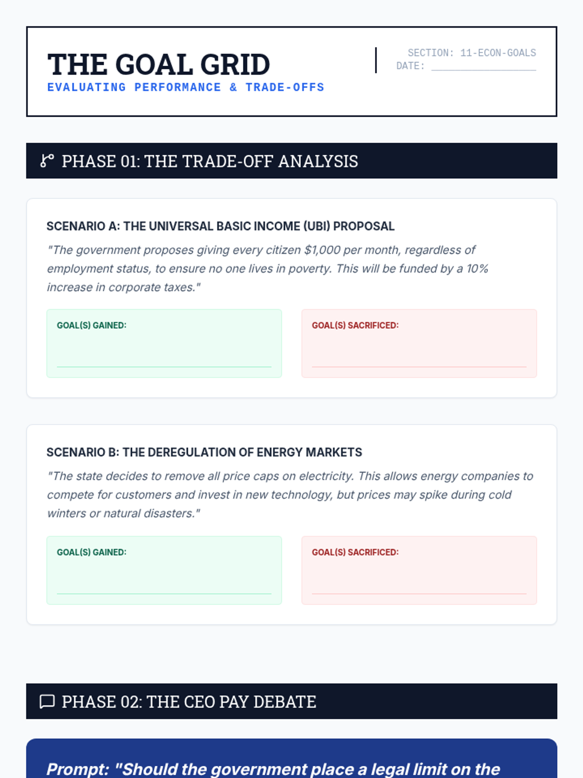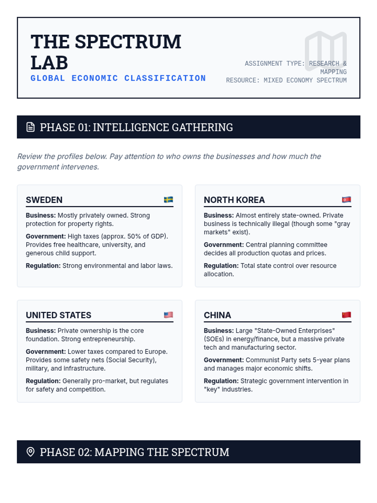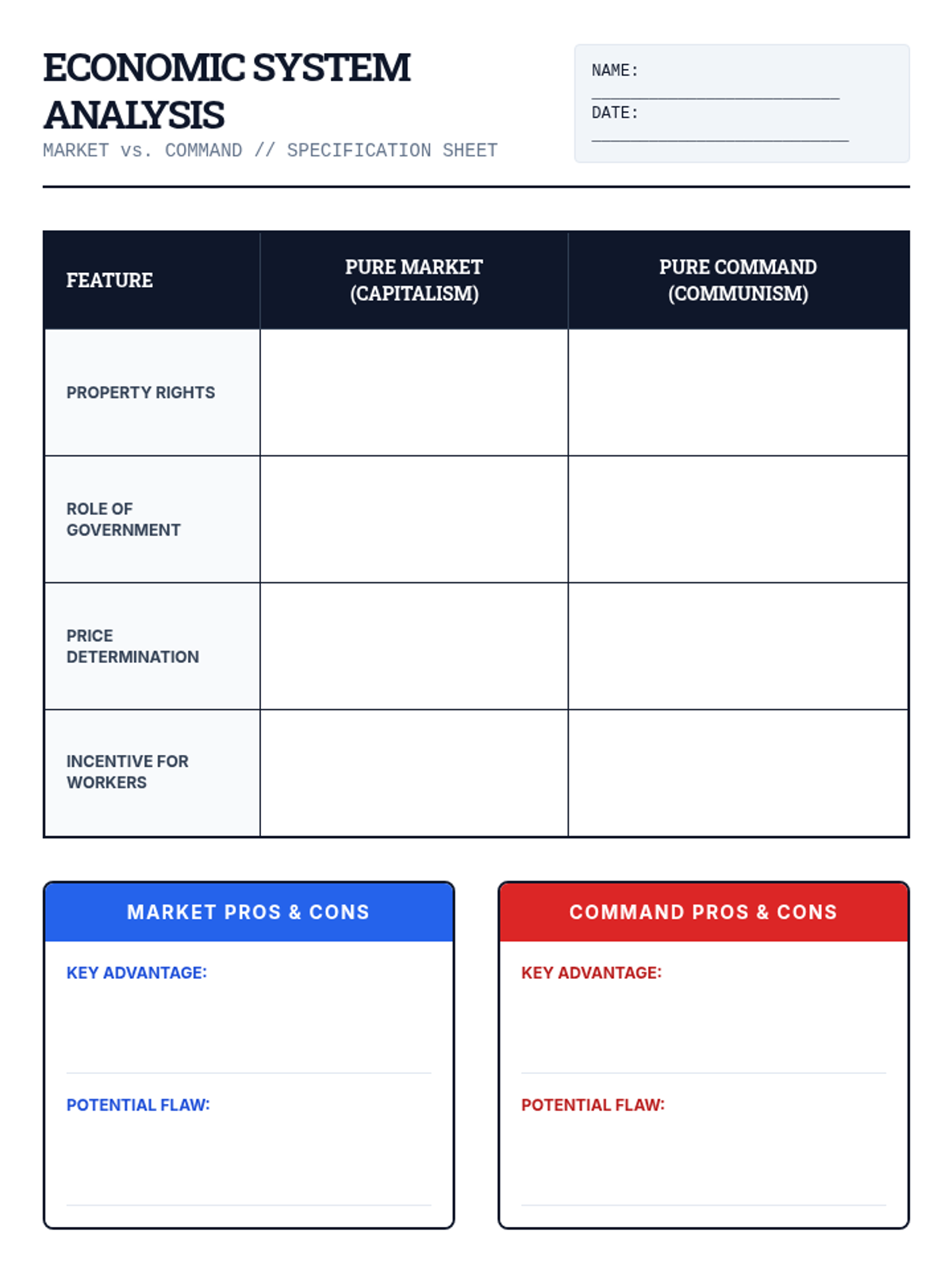 This sequence explores how societies organize the production and distribution of resources. Students move from abstract concepts like the three basic economic questions to evaluating the efficiency, equity, and stability of command, market, and mixed economies, concluding with an analysis of how institutions drive economic development.