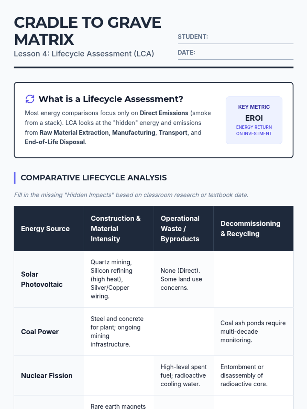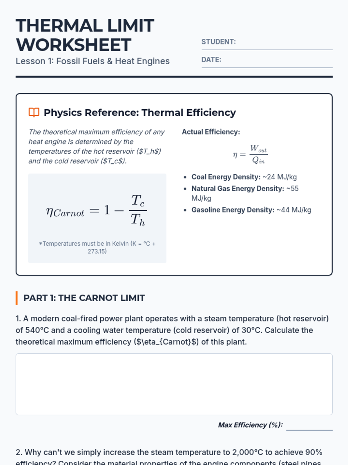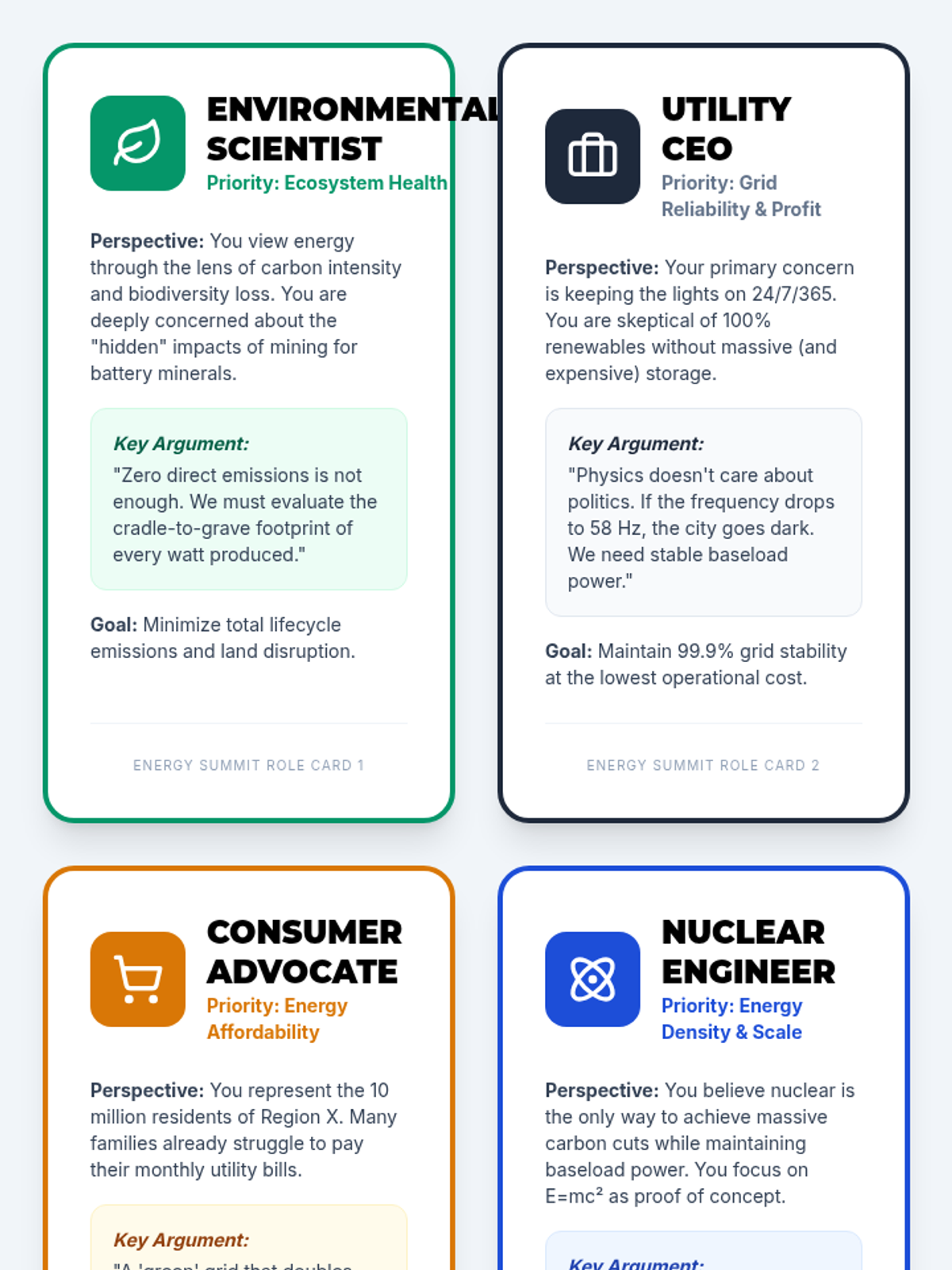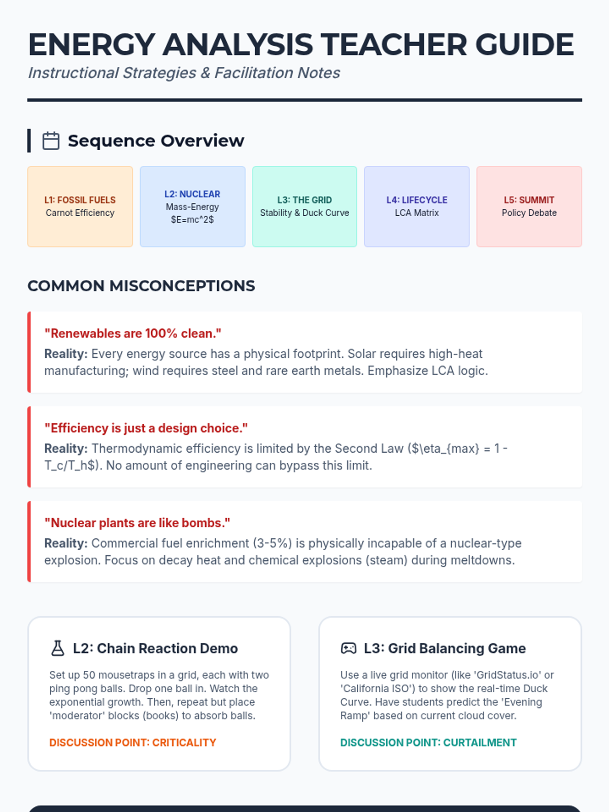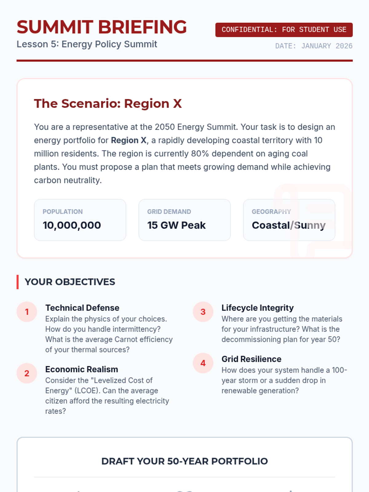 A 10th-grade physics unit evaluating the physical, environmental, and economic impacts of global energy production. Students explore thermodynamics, nuclear physics, and grid systems through case studies and data analysis, culminating in a policy summit.