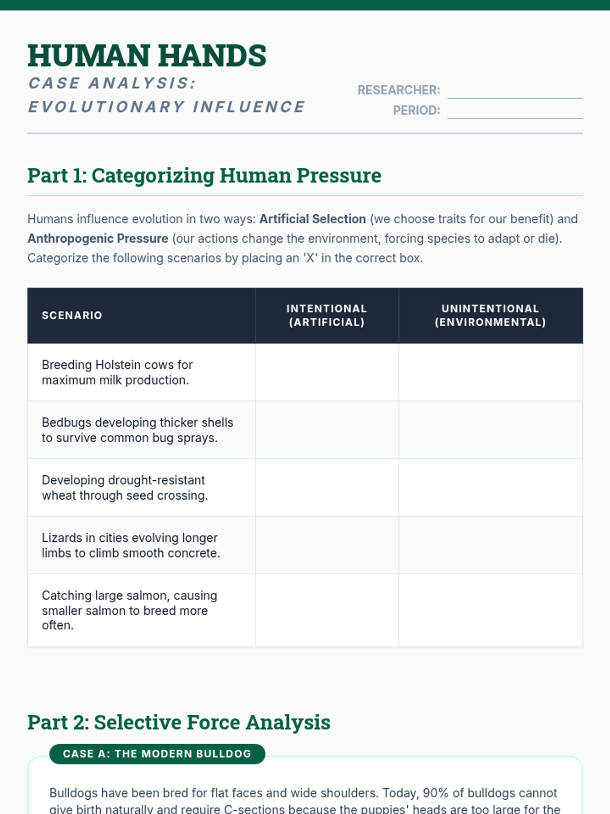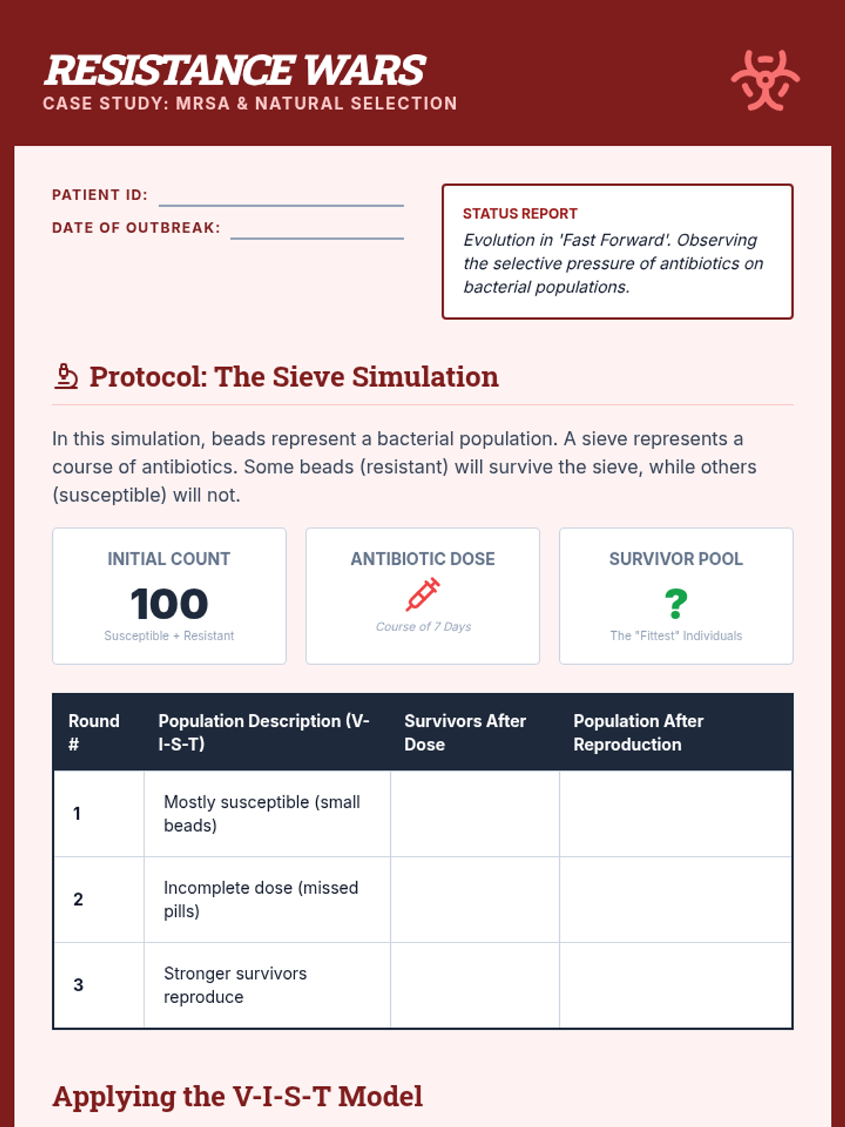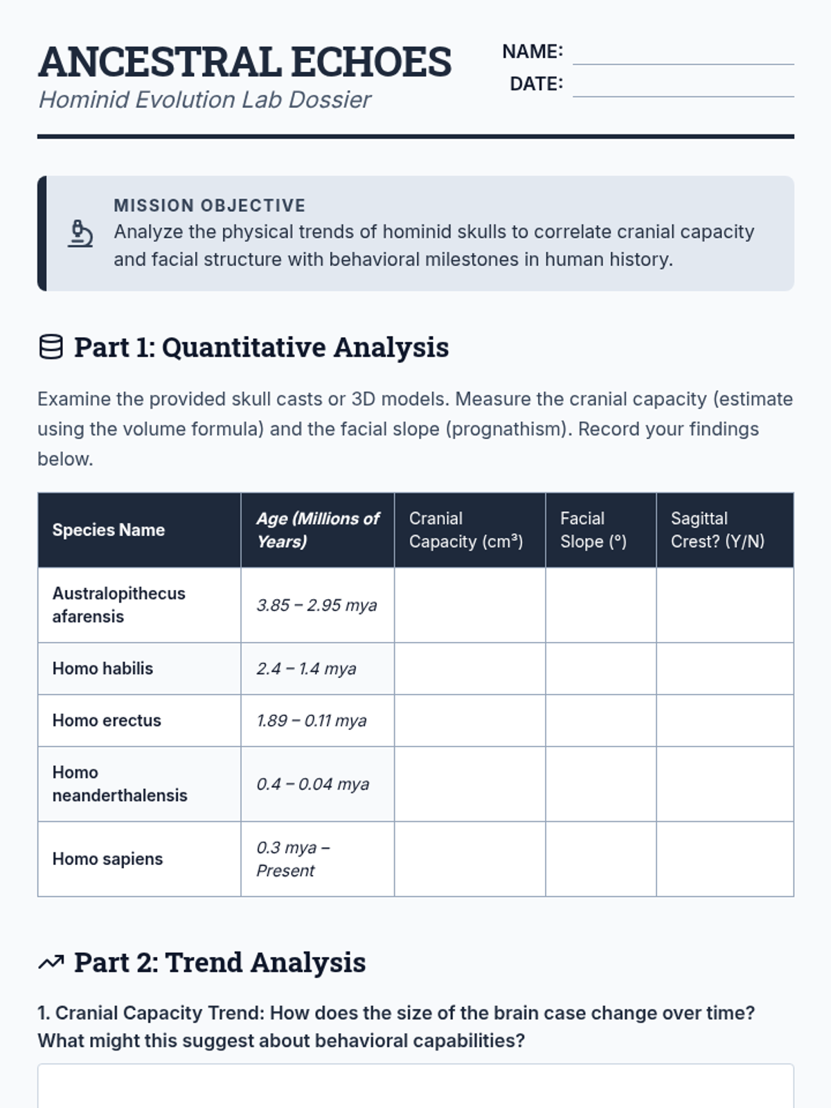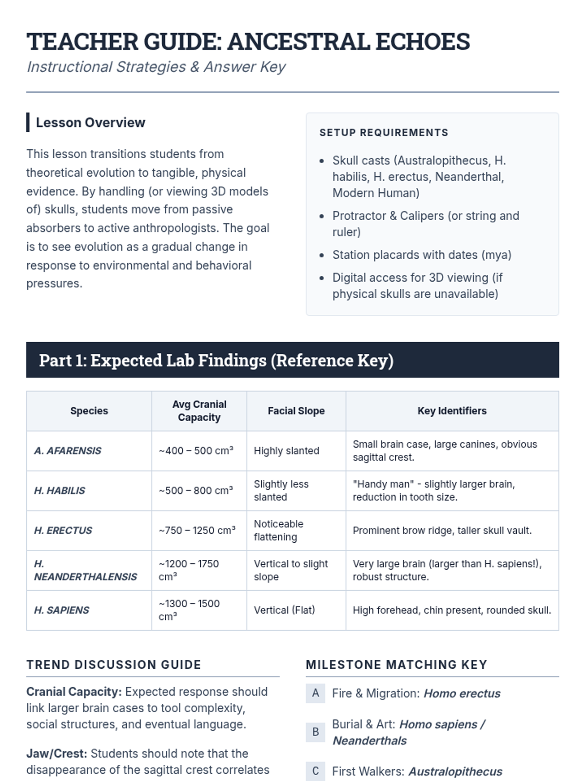 A 10th-grade biology sequence exploring evolution through the lens of human history and modern health. Students analyze hominid skull trends, simulate antibiotic resistance, and debate the ethics of human-driven evolution.