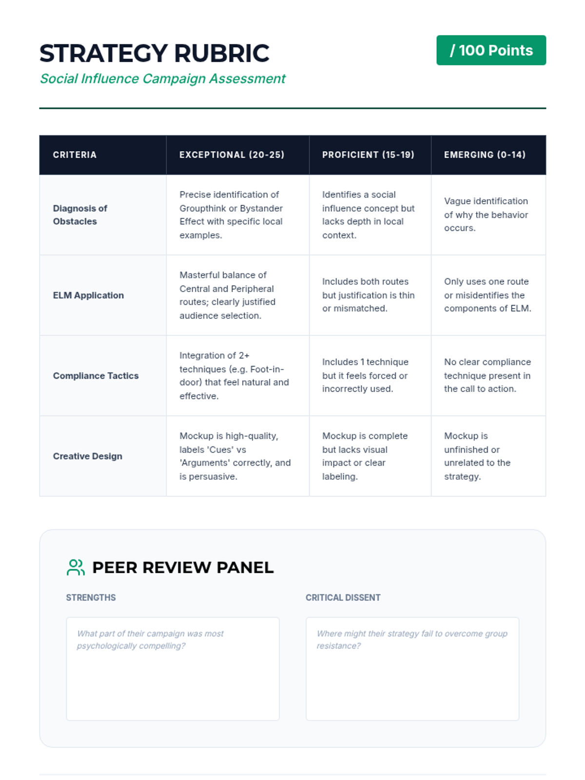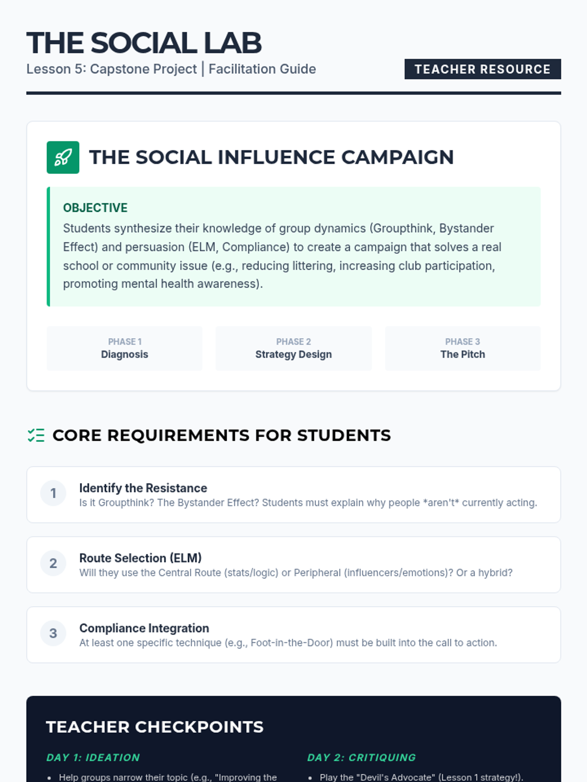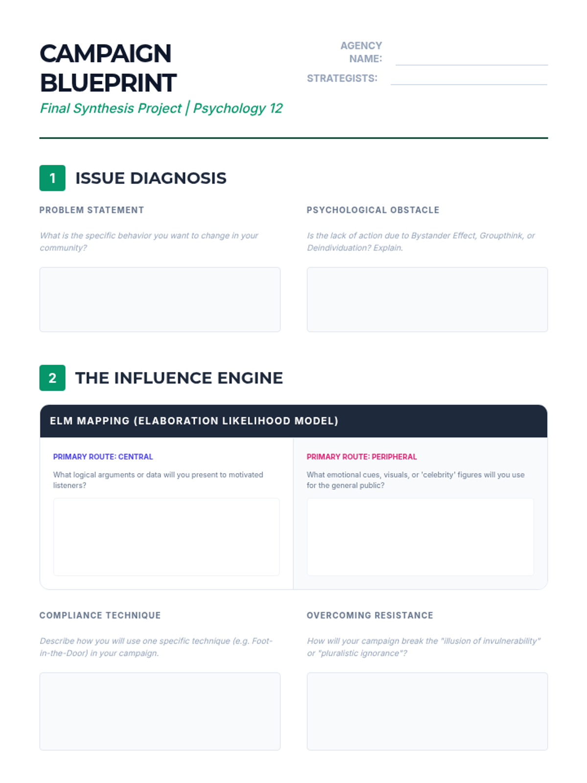 This 12th-grade Psychology sequence explores the powerful forces of social influence, ranging from the internal dynamics of groups to the external pressures of professional persuasion. Students analyze groupthink, the bystander effect, the Elaboration Likelihood Model, and compliance techniques, culminating in a real-world social influence campaign project.