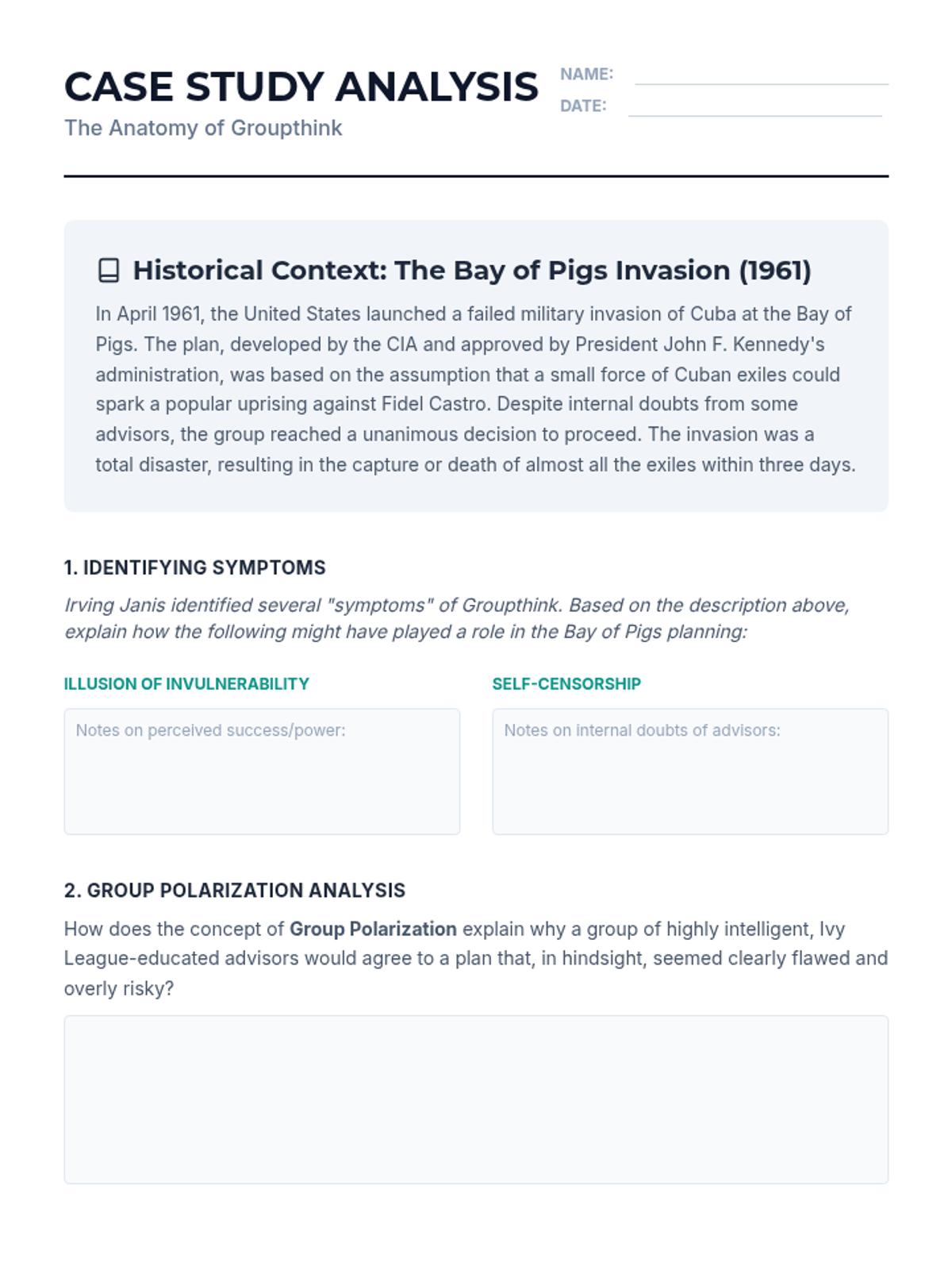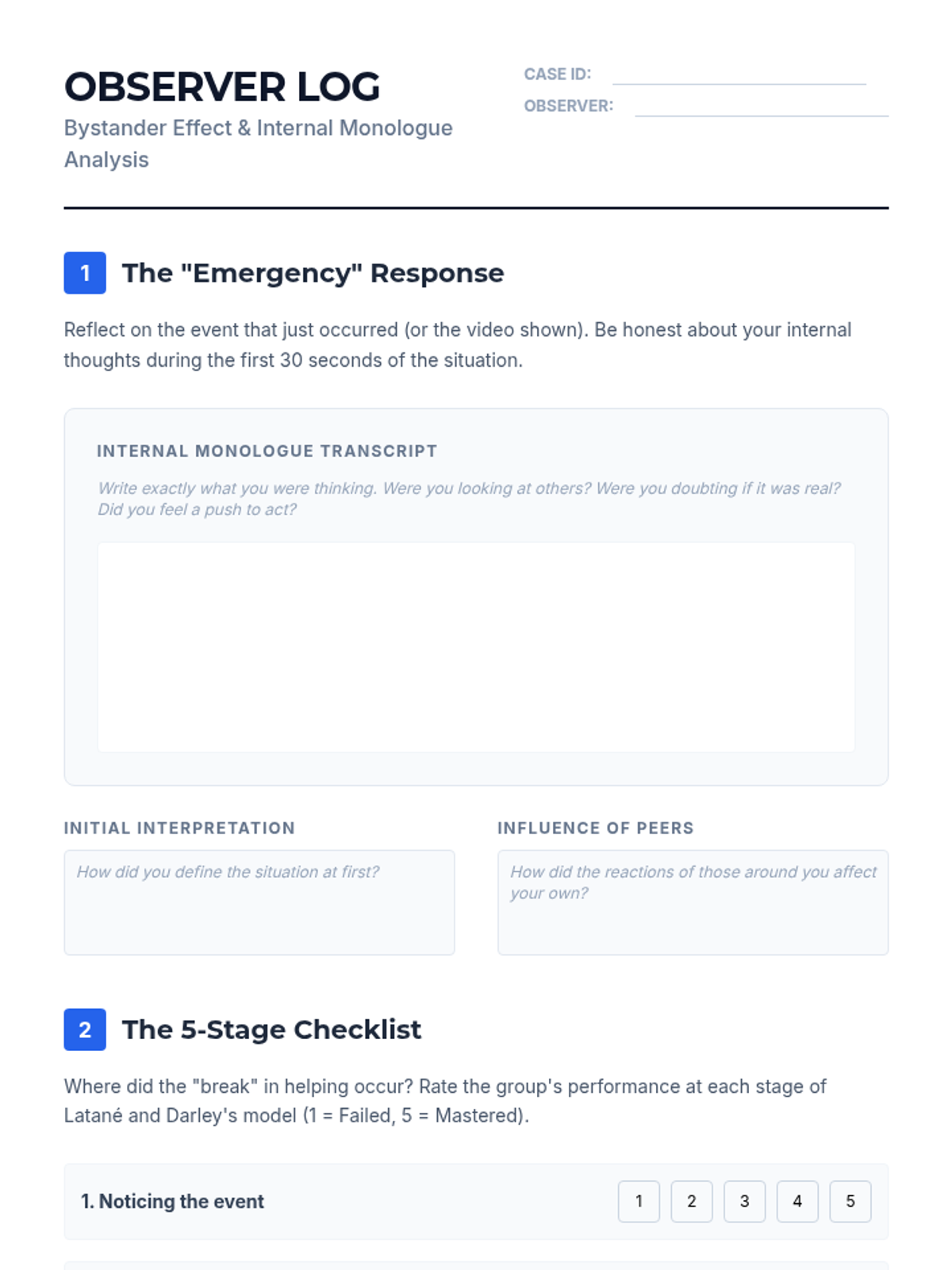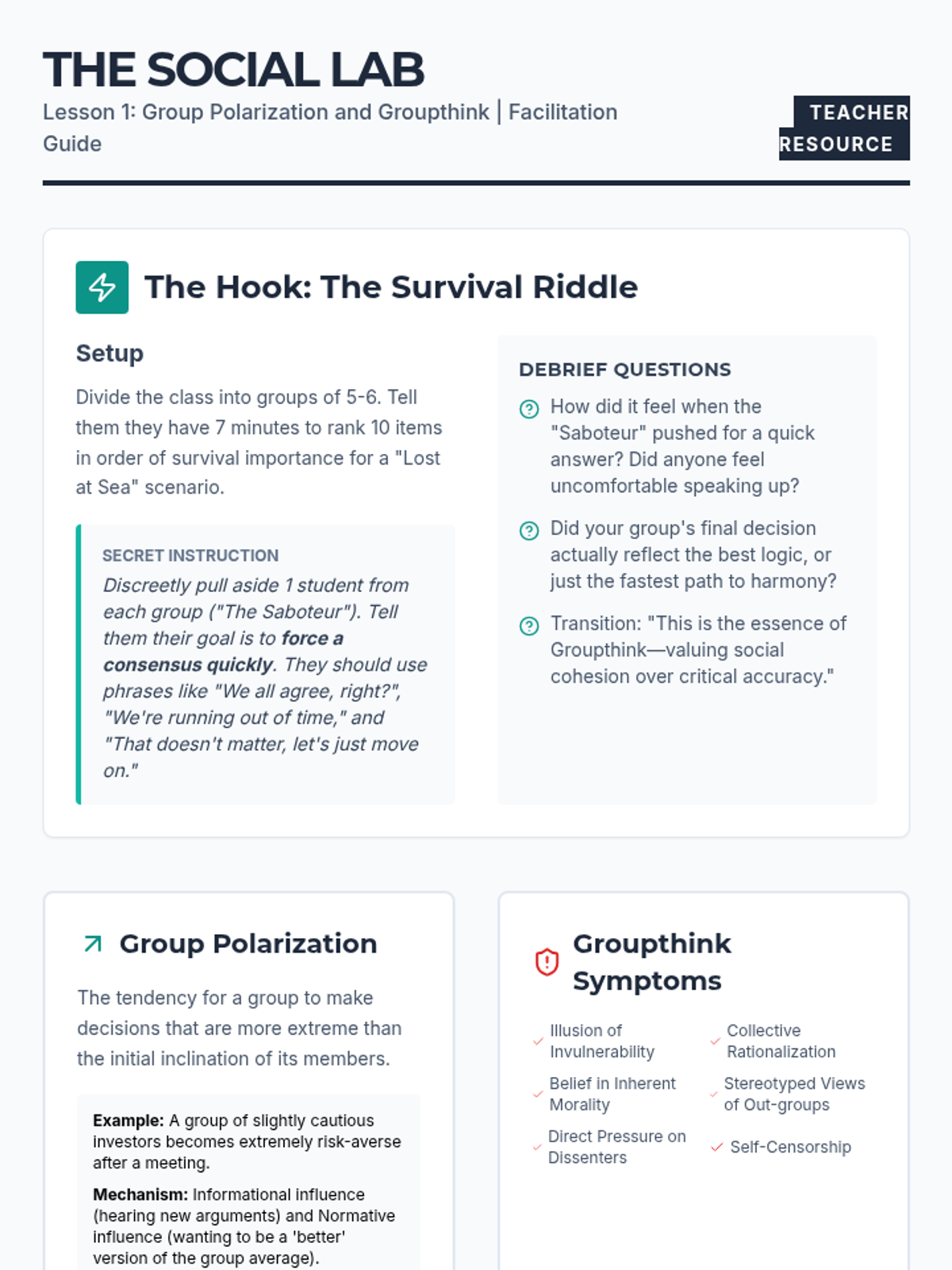 This 12th-grade Psychology sequence explores the powerful forces of social influence, ranging from the internal dynamics of groups to the external pressures of professional persuasion. Students analyze groupthink, the bystander effect, the Elaboration Likelihood Model, and compliance techniques, culminating in a real-world social influence campaign project.