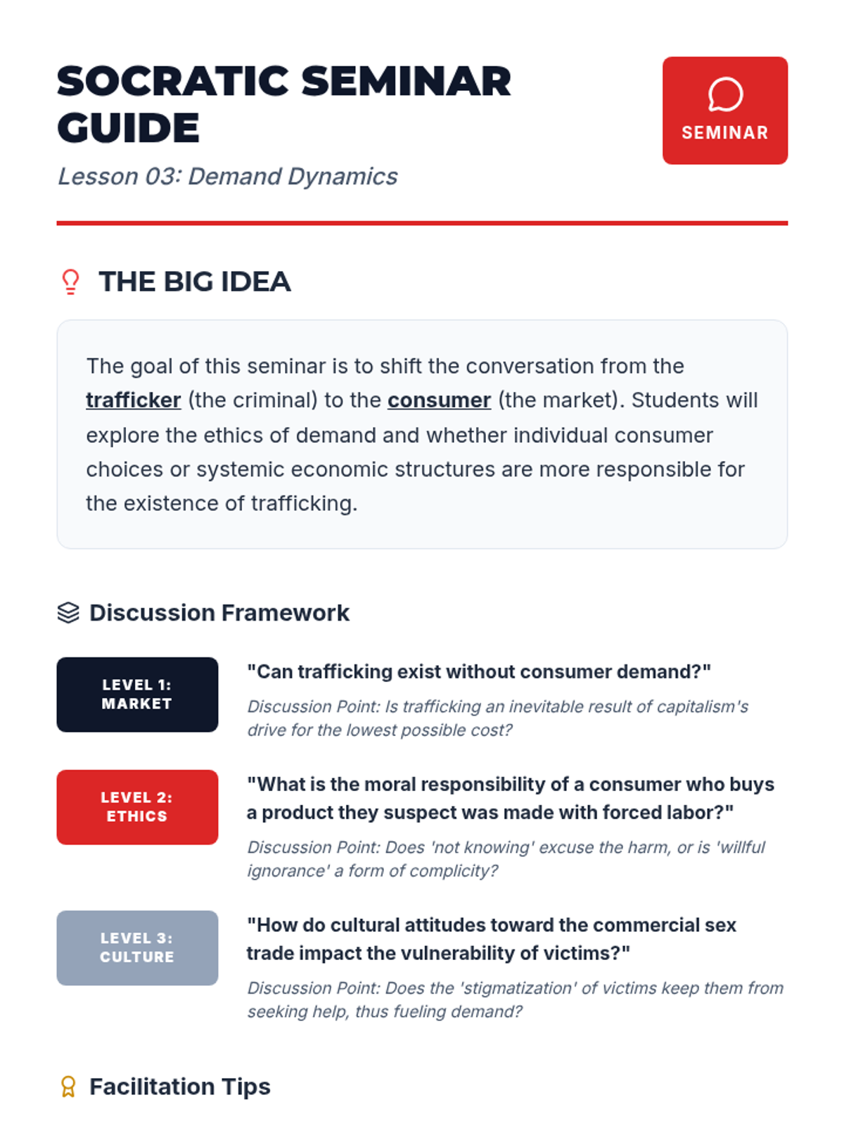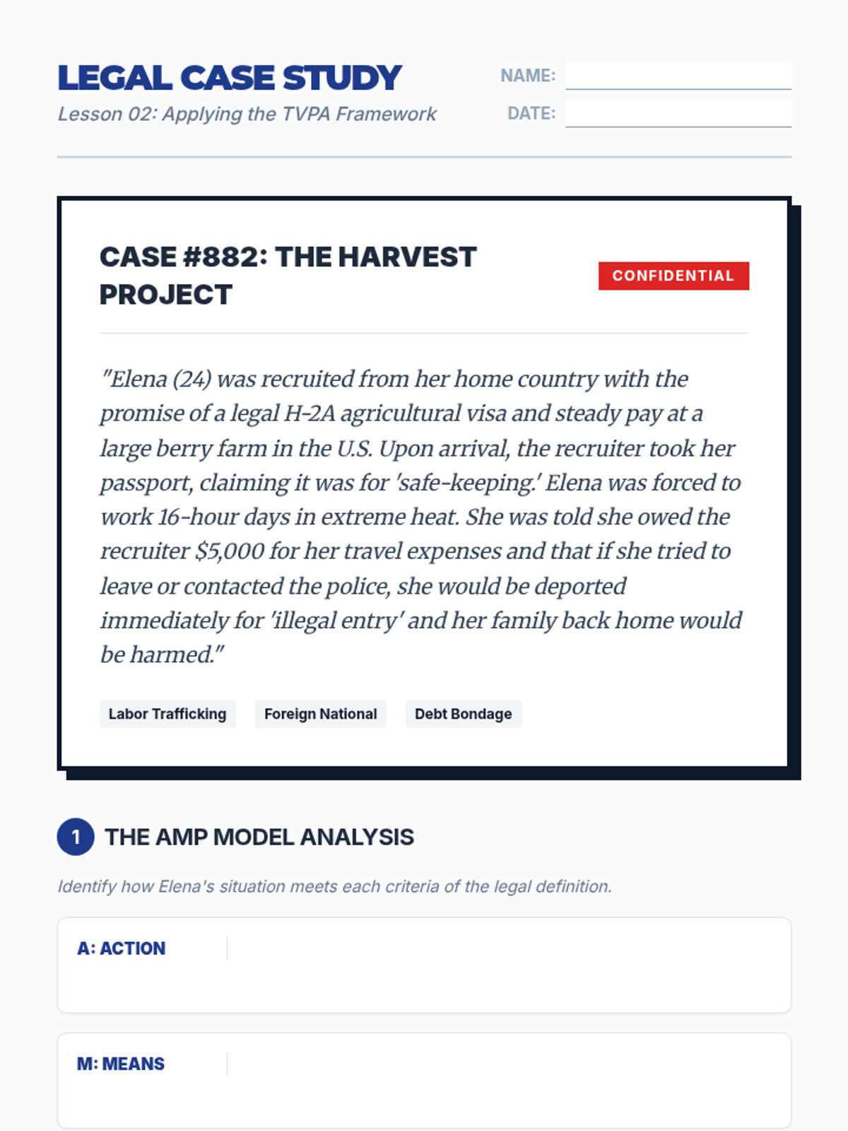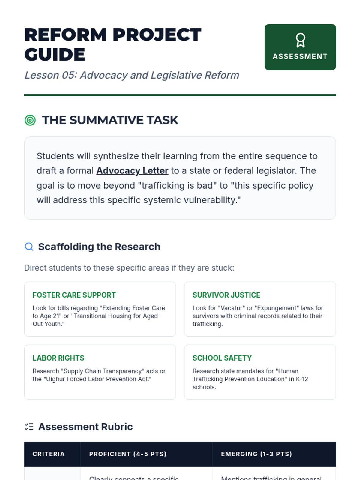 This sequence analyzes the systemic factors that contribute to human trafficking and the legal frameworks designed to combat it. Students explore how systemic inequalities like homelessness, the foster care system, and systemic racism increase trafficking risk and evaluate the effectiveness of policies like the TVPA.