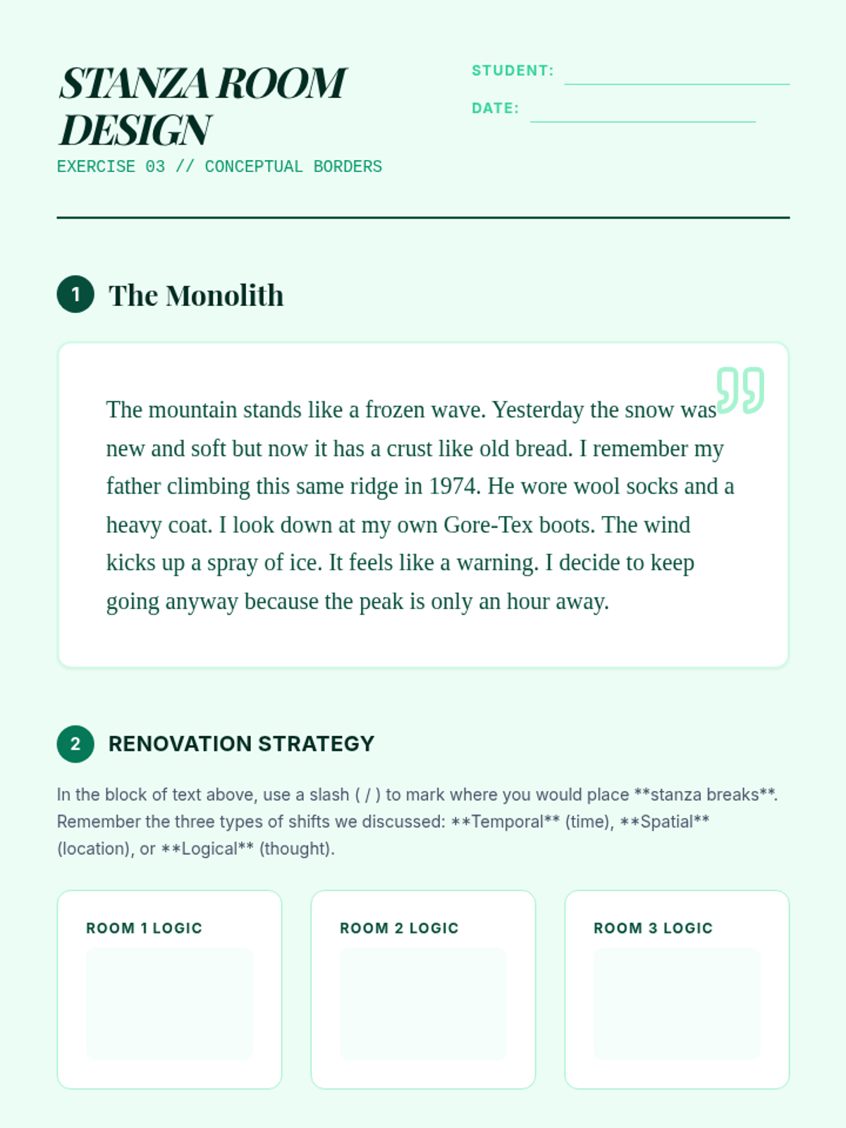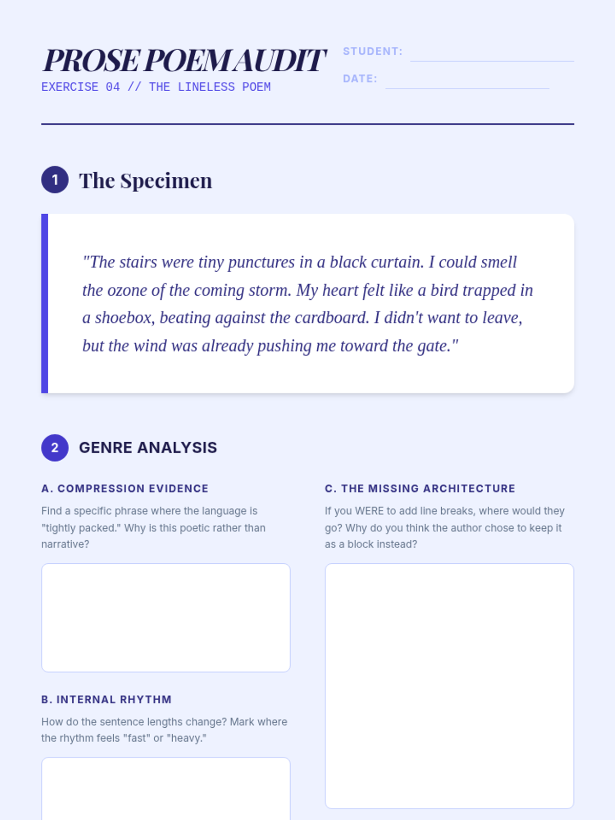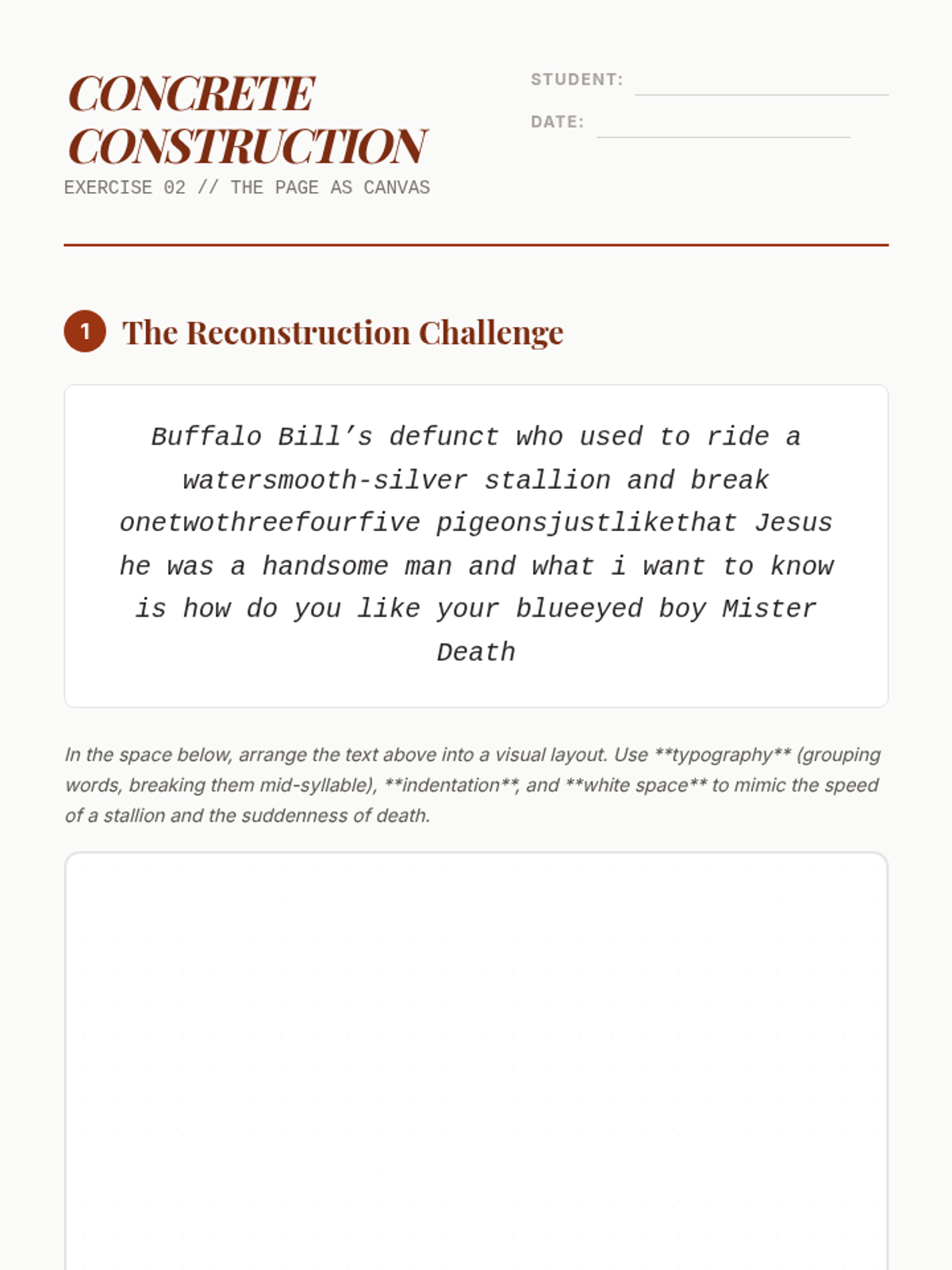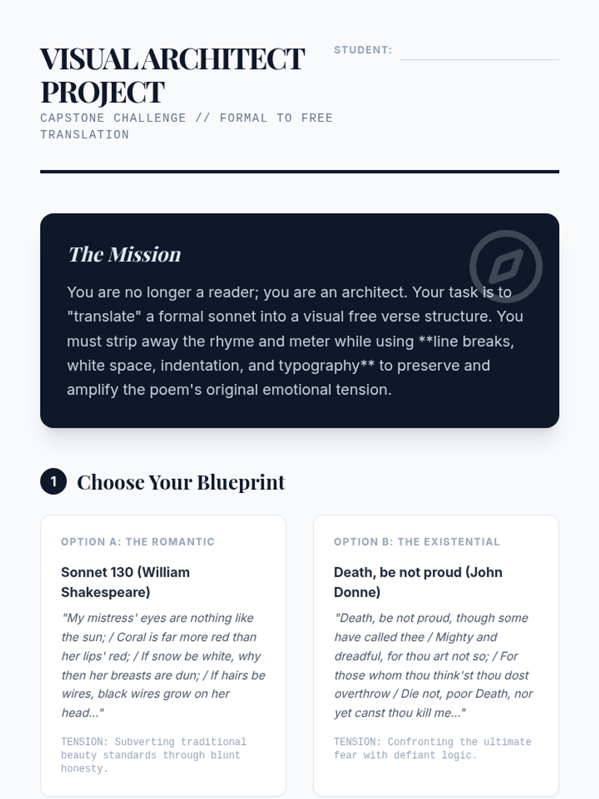 A 12th Grade ELA sequence exploring the visual architecture of free verse poetry. Students investigate how line breaks, white space, and stanzaic structure replace traditional meter and rhyme to create meaning.