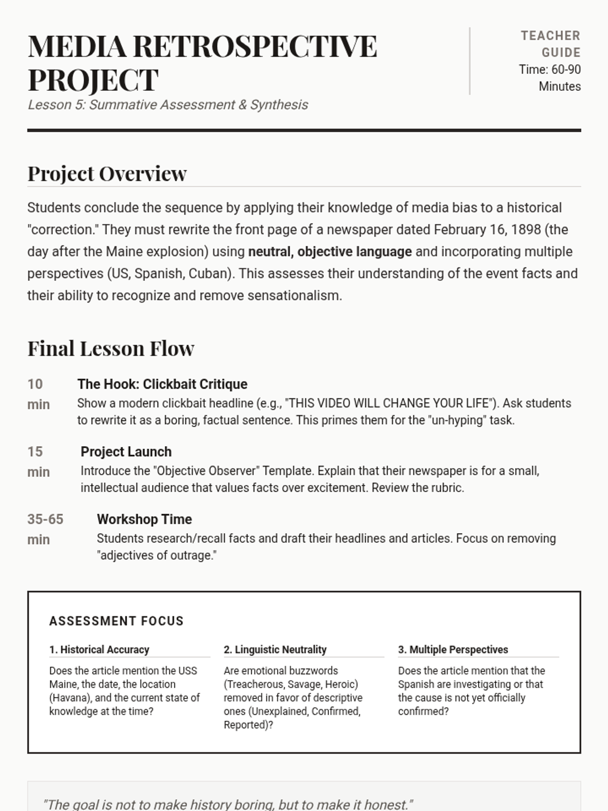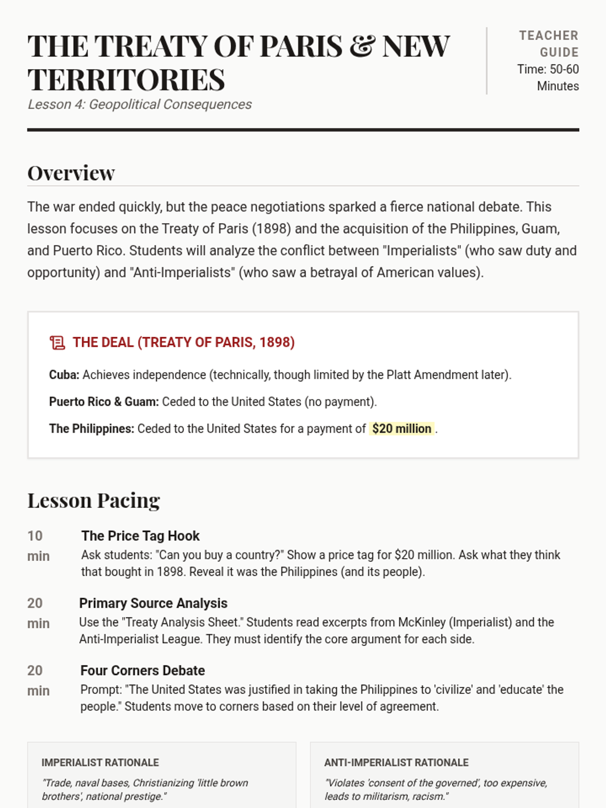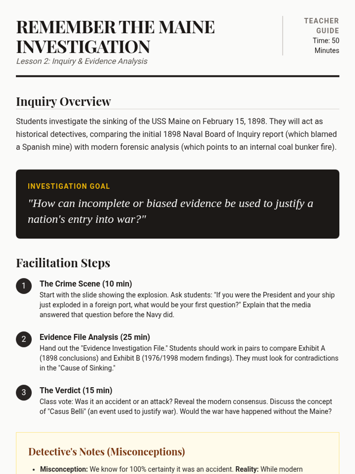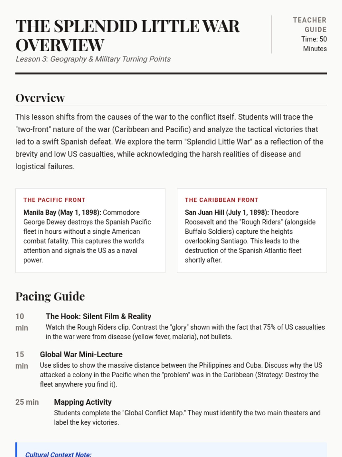 This sequence examines the Spanish-American War through the lens of media influence and immediate geopolitical consequences. Students explore the role of Yellow Journalism in precipitating the conflict and analyze the war as a turning point for the US as a global superpower.