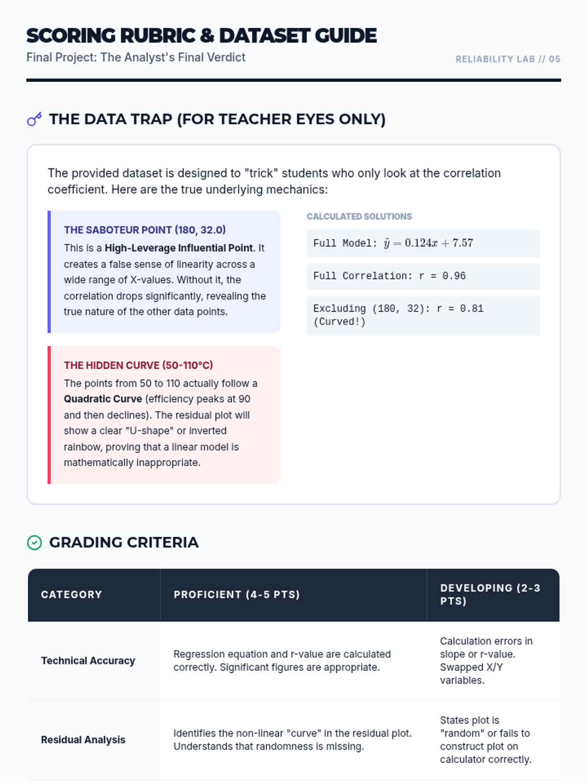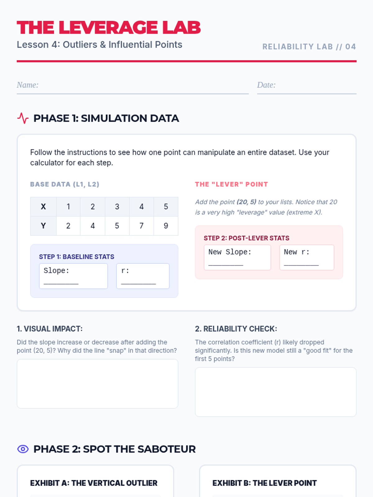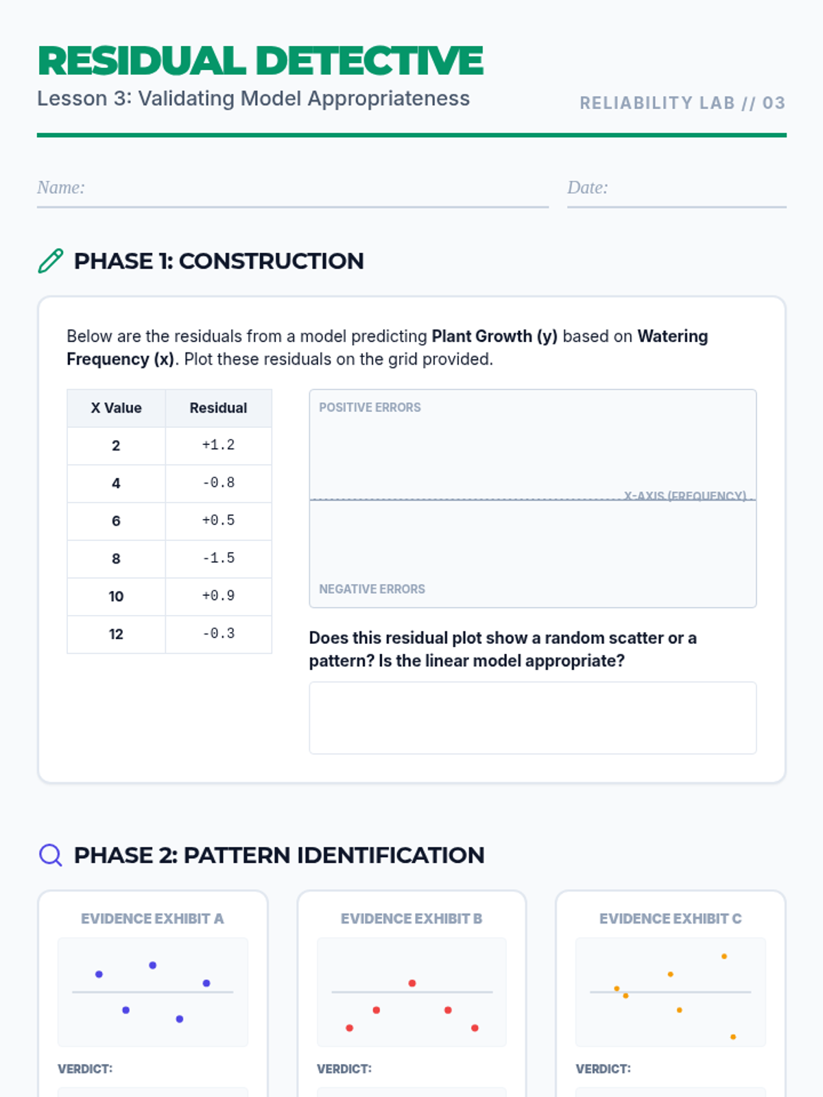 This 11th-grade statistics sequence focuses on evaluating the reliability of linear models. Students progress from generating least squares regression lines to performing advanced residual analysis, identifying non-linear patterns, and assessing the impact of influential outliers through a forensic data analysis lens.
