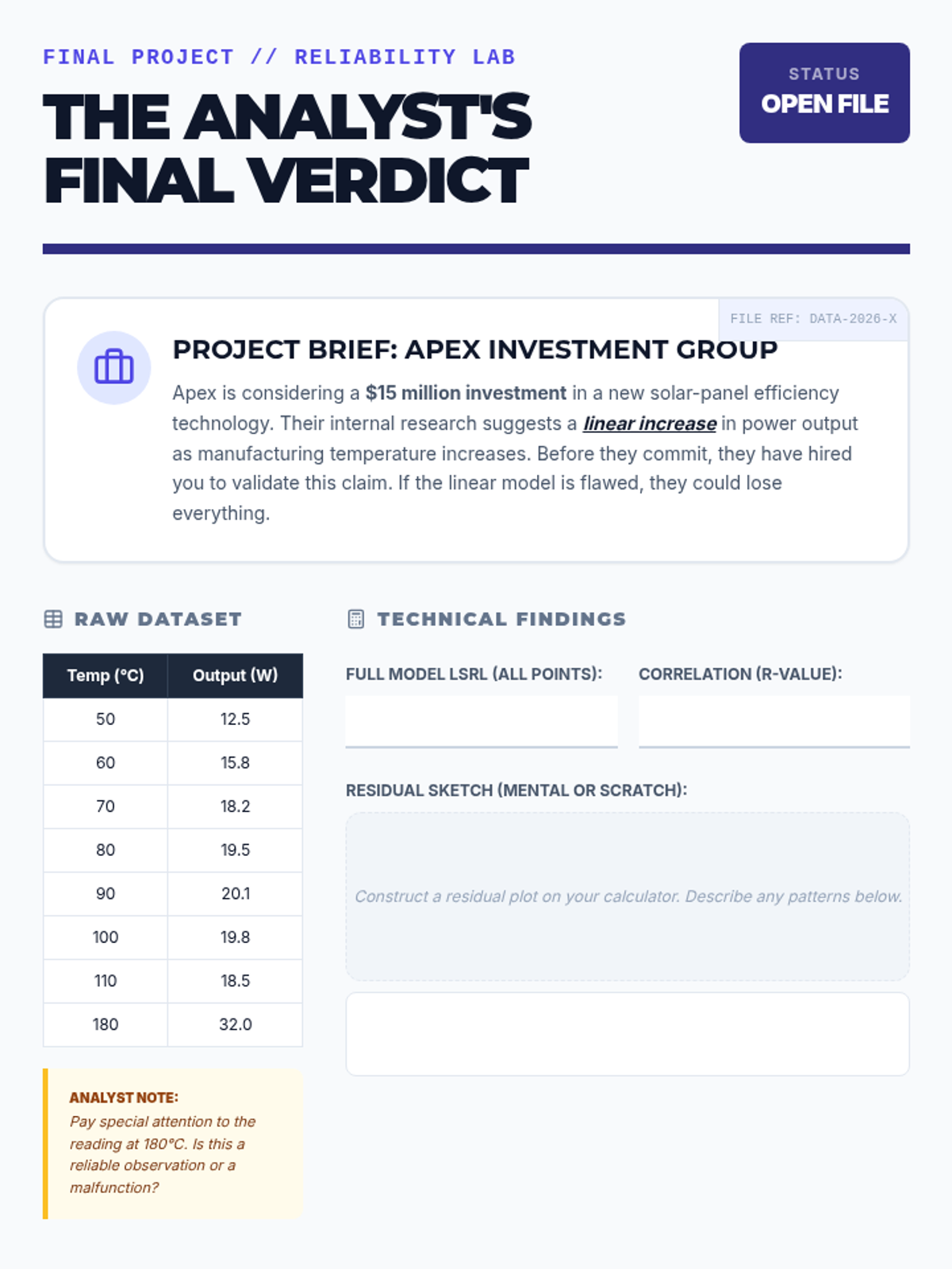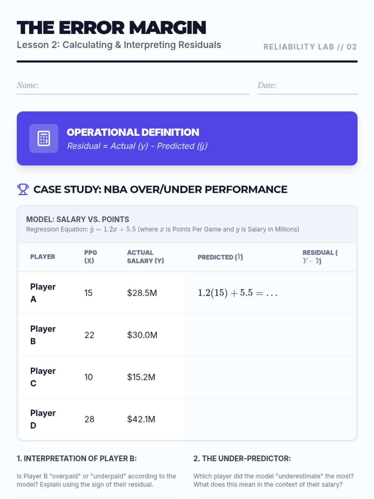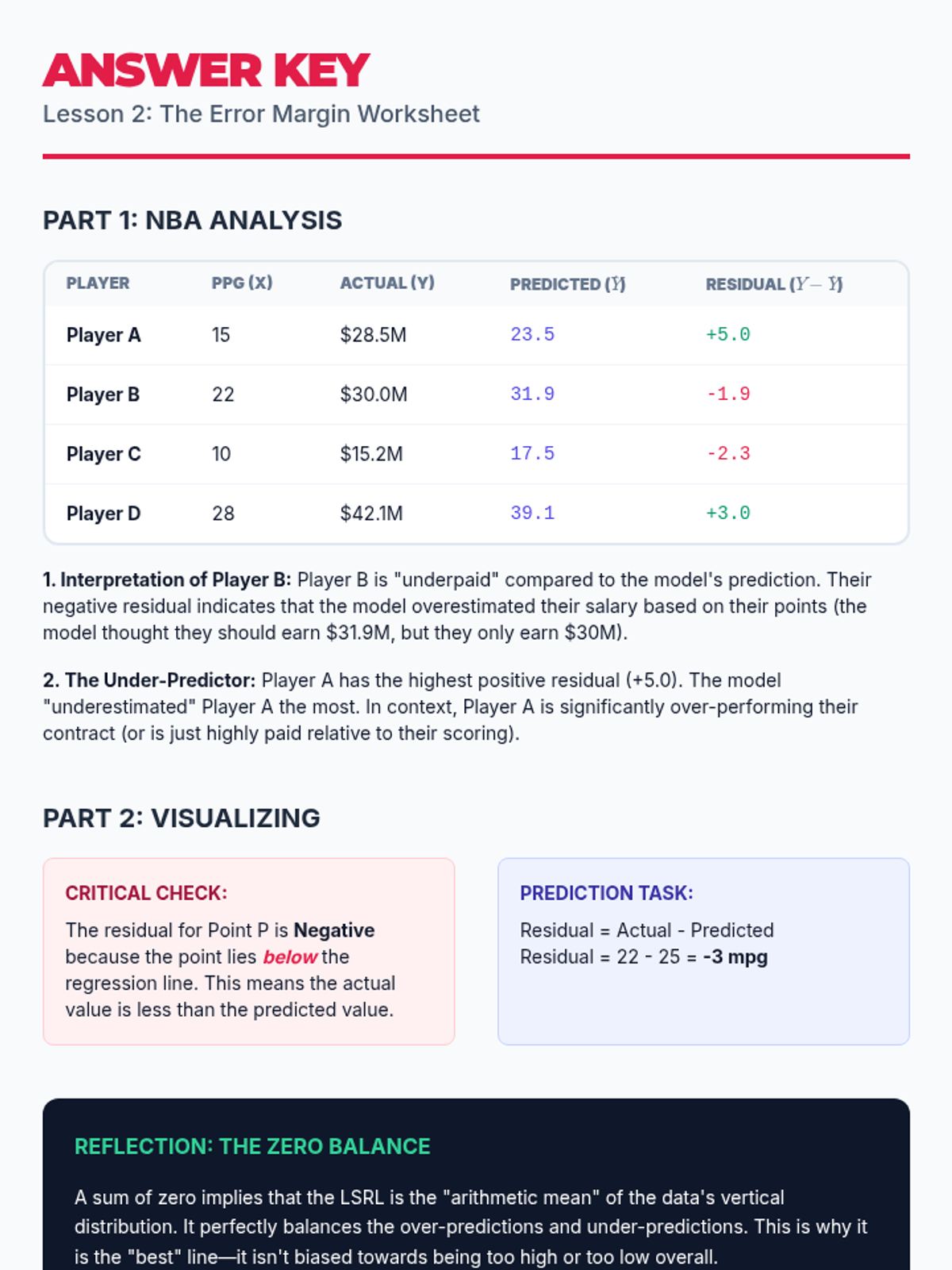 This 11th-grade statistics sequence focuses on evaluating the reliability of linear models. Students progress from generating least squares regression lines to performing advanced residual analysis, identifying non-linear patterns, and assessing the impact of influential outliers through a forensic data analysis lens.