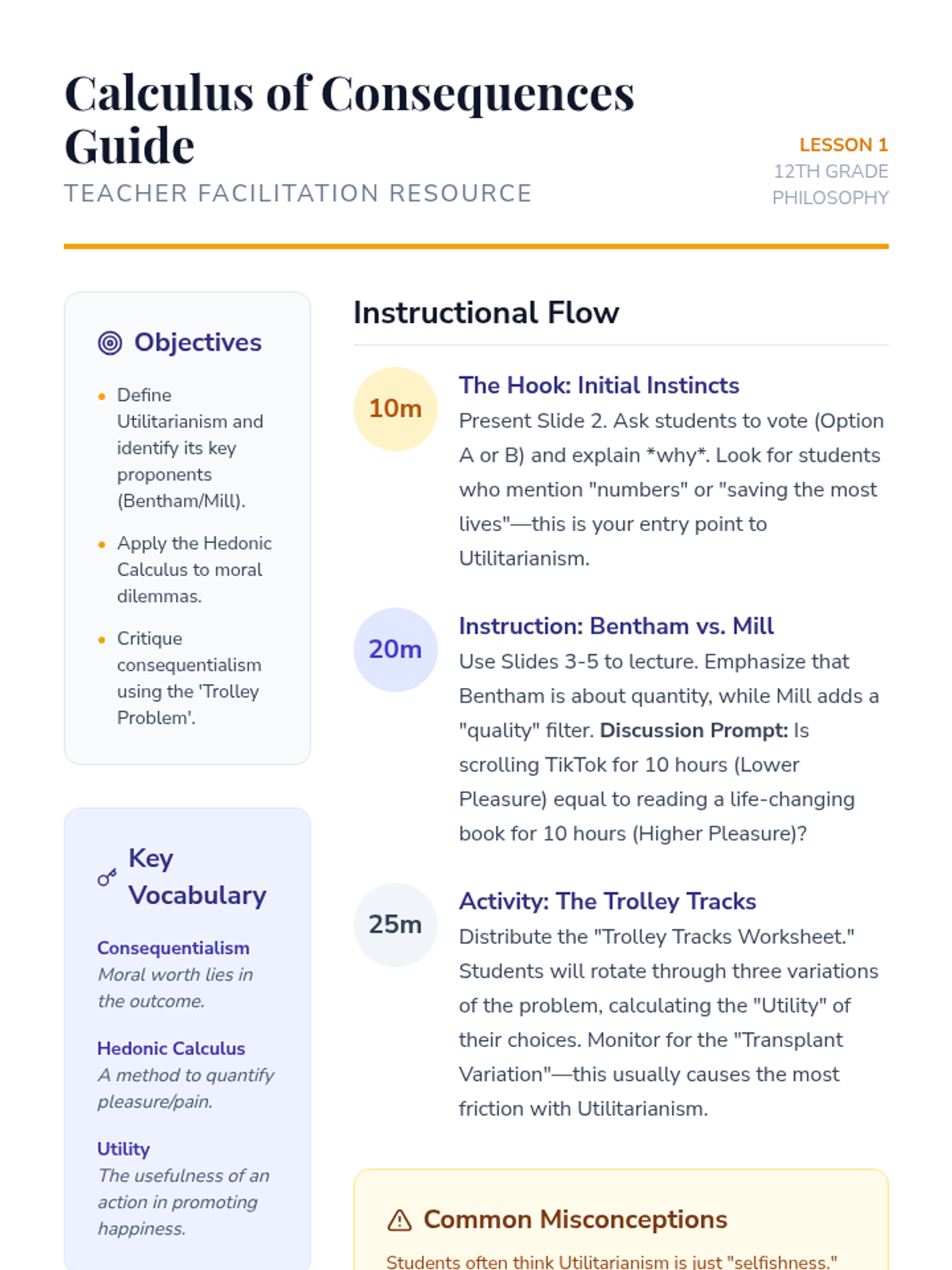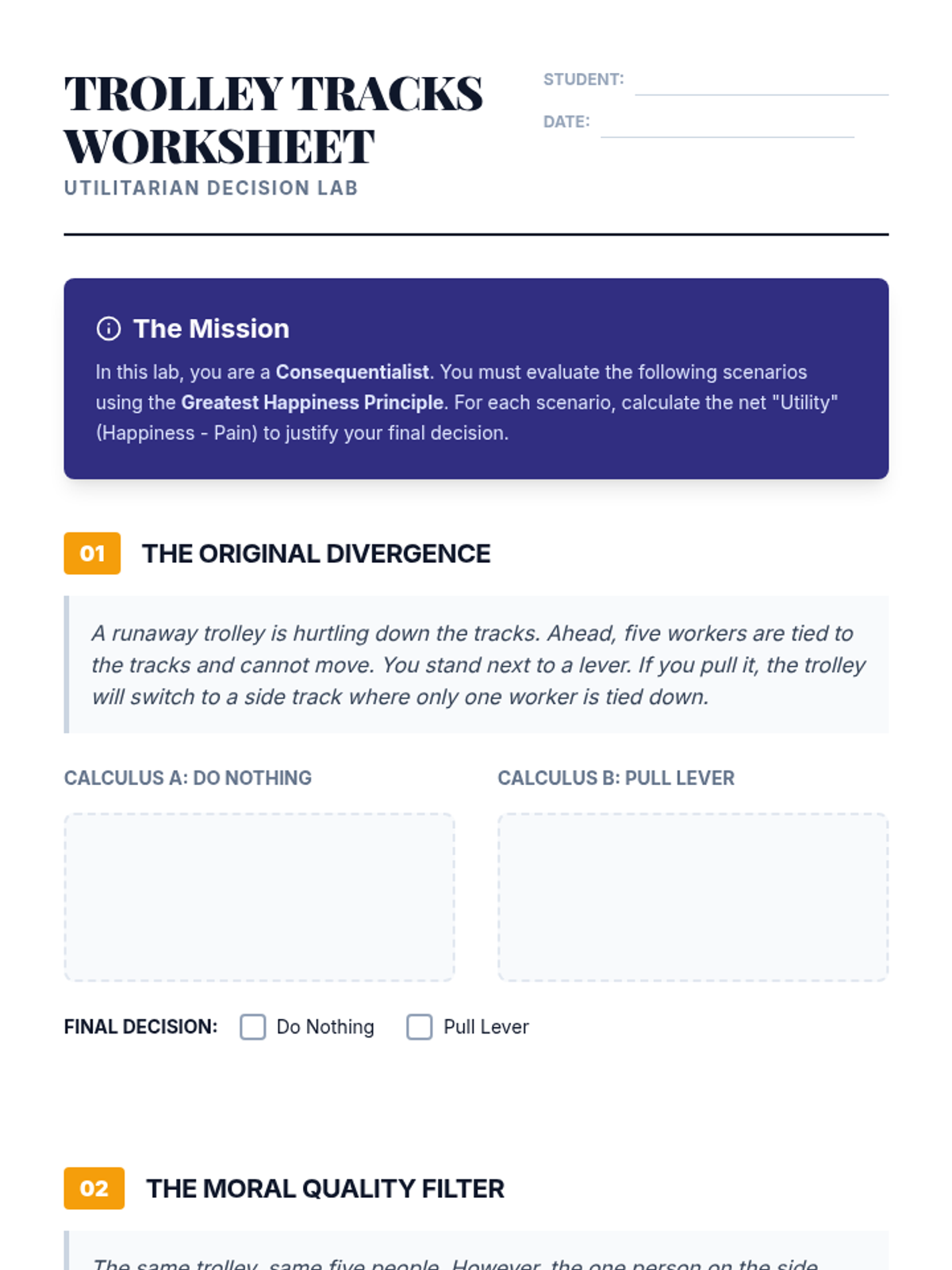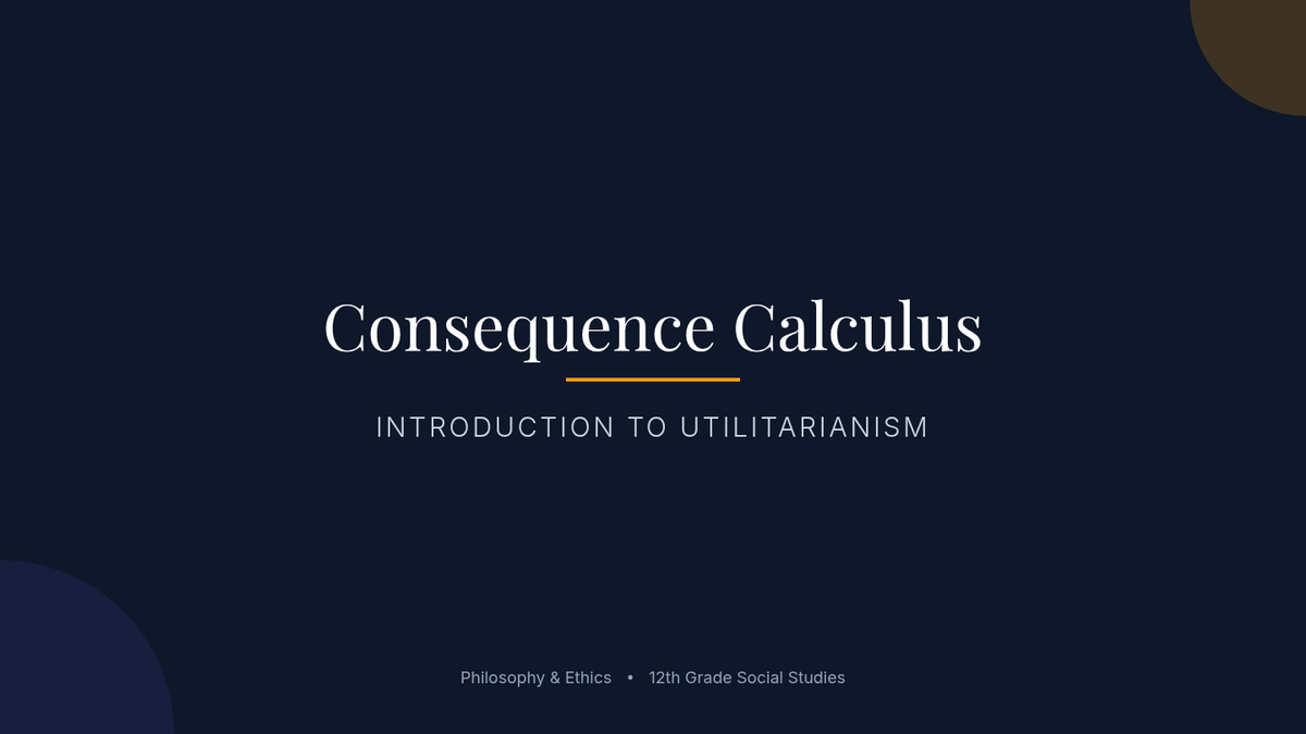 A comprehensive 12th-grade philosophy sequence that explores Utilitarianism, Deontology, and Virtue Ethics through simulations and contemporary dilemmas. Students will analyze how different ethical frameworks impact decision-making in personal, legal, and technological contexts.