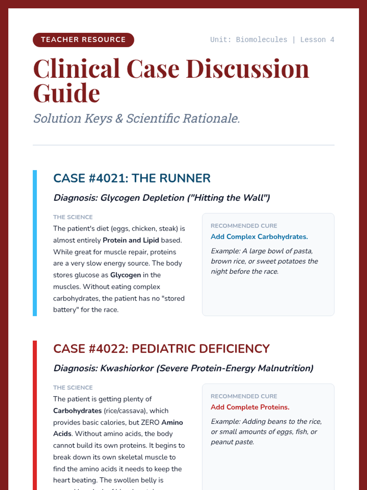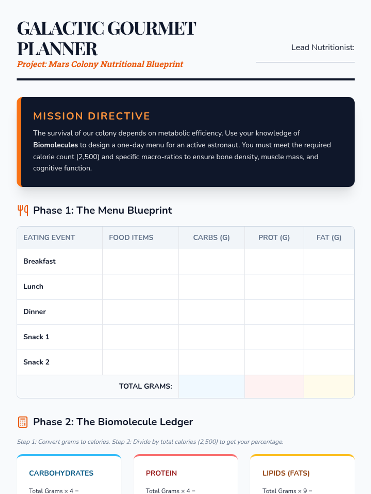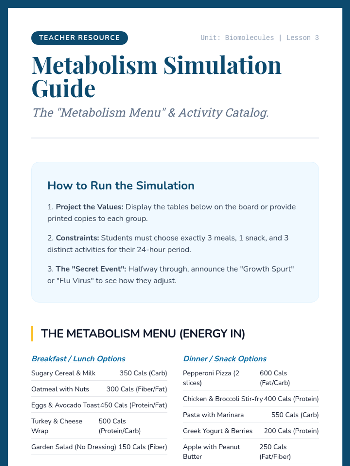 A 5-lesson sequence for 7th-grade students exploring biomolecules through nutrition, digestion, and metabolism. Students learn to decode food labels, map chemical digestion, manage energy budgets, and design balanced meal plans.