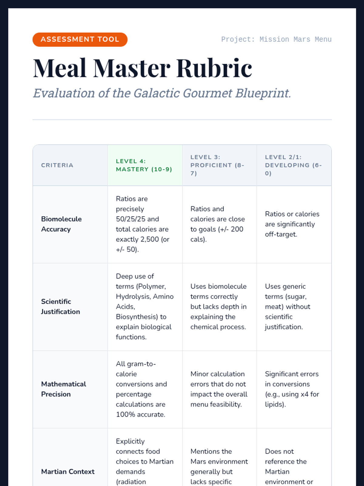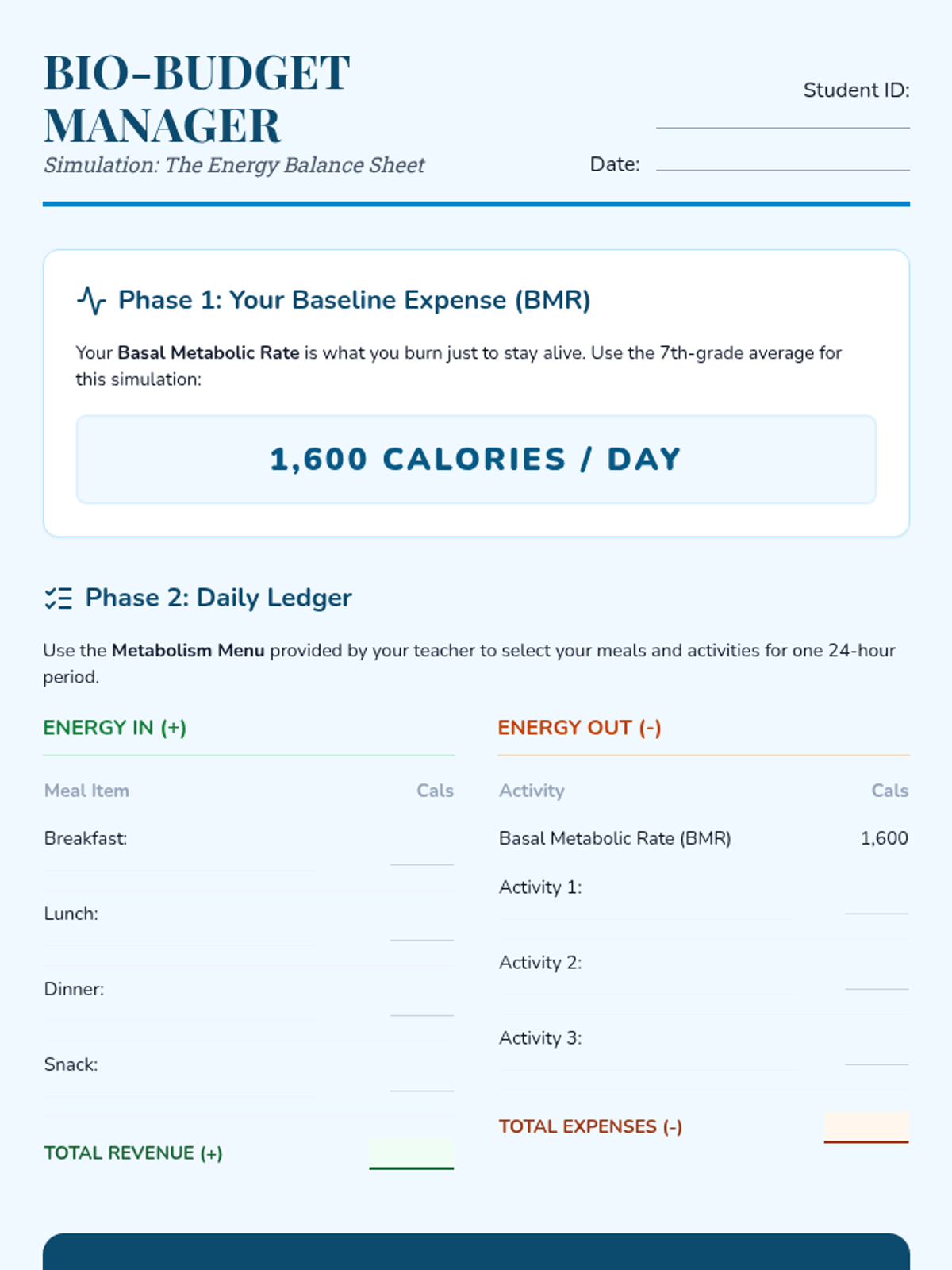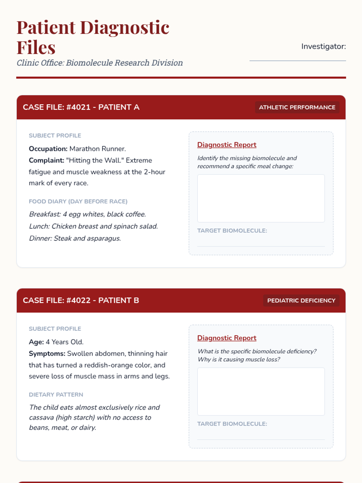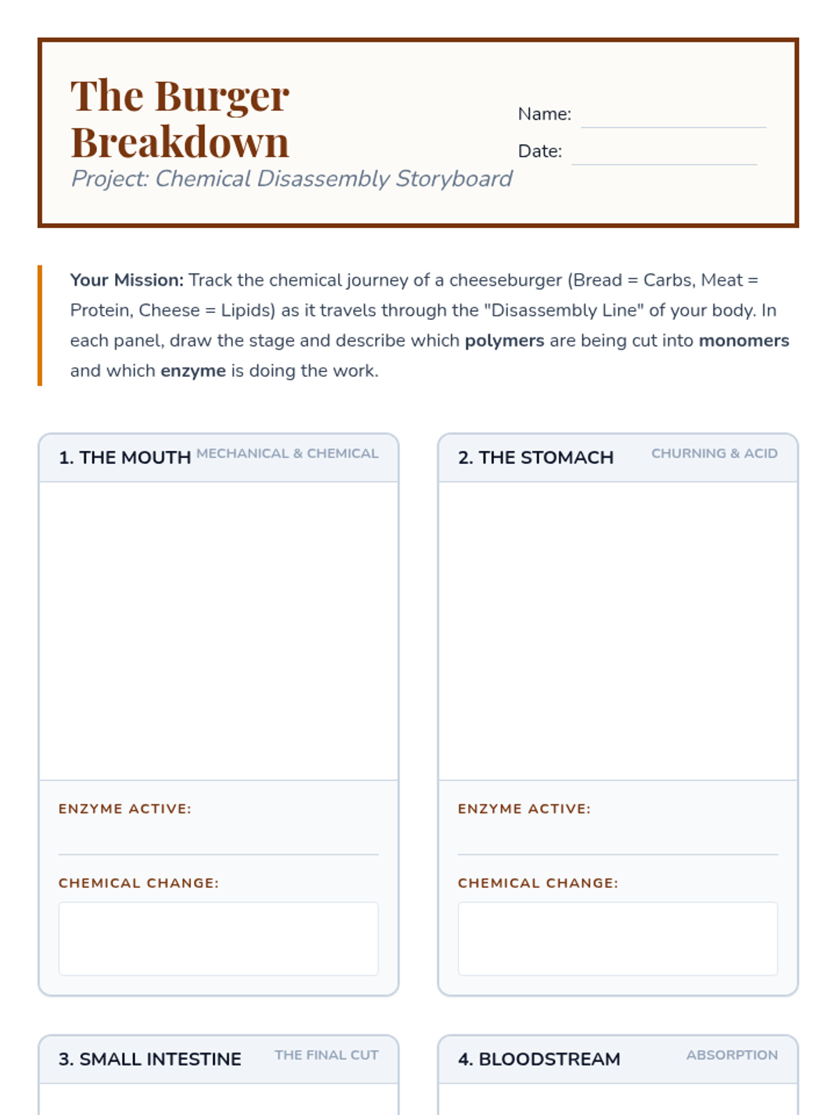 A 5-lesson sequence for 7th-grade students exploring biomolecules through nutrition, digestion, and metabolism. Students learn to decode food labels, map chemical digestion, manage energy budgets, and design balanced meal plans.