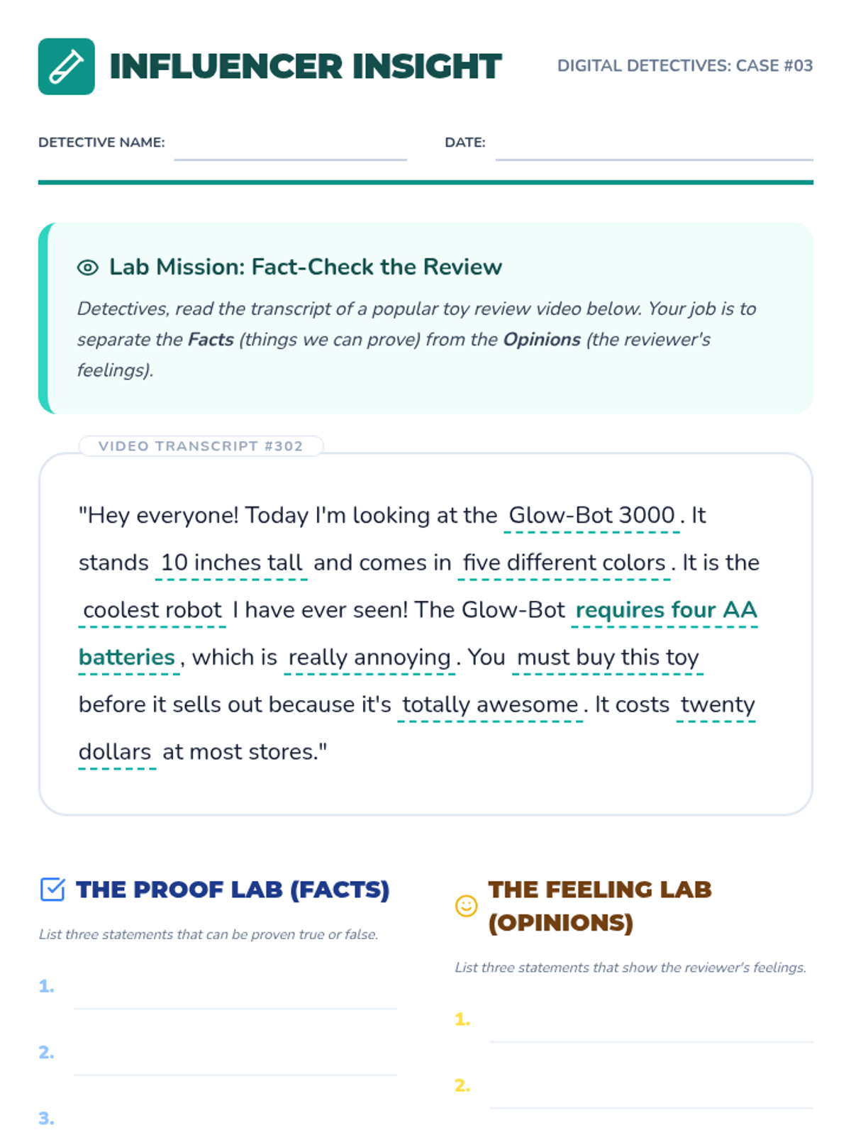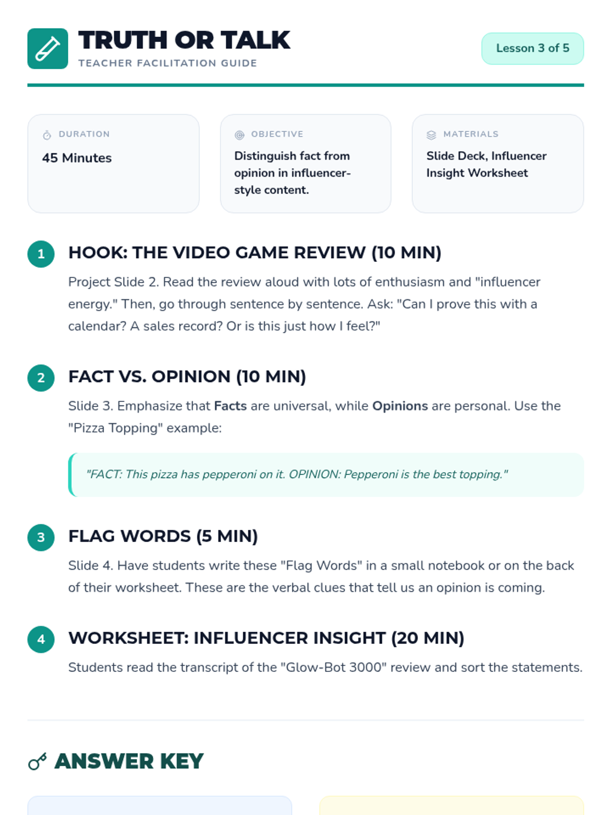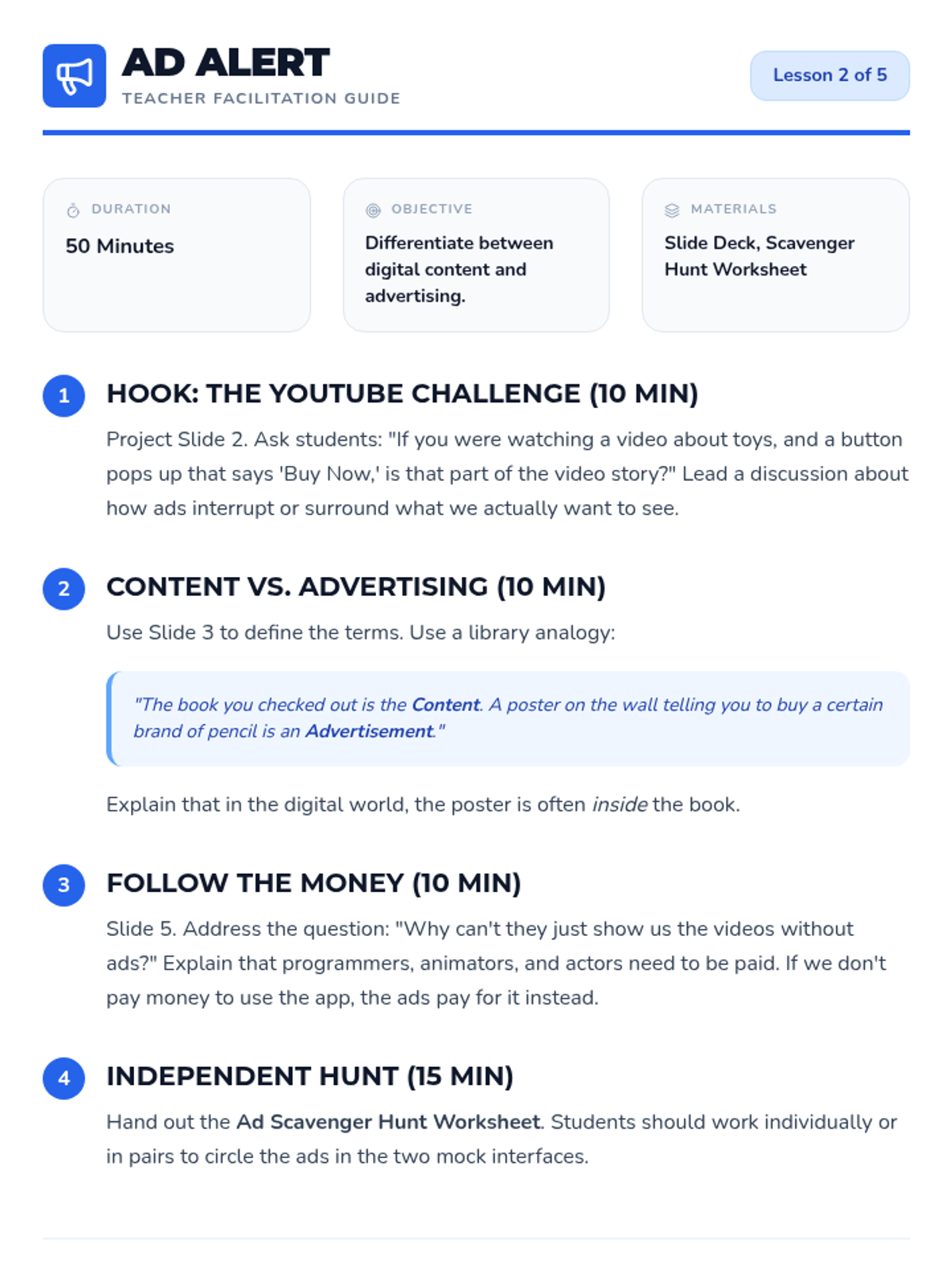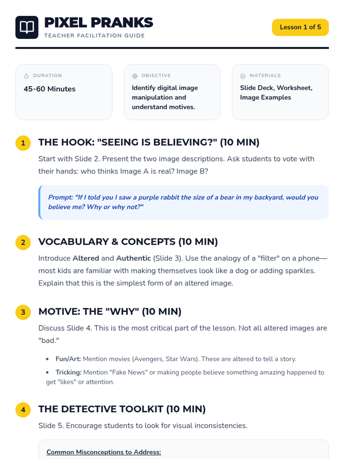 A comprehensive 3rd-grade sequence focused on digital literacy and media analysis. Students learn to navigate the online world by identifying altered images, recognizing advertising, distinguishing fact from opinion, verifying sources, and applying a three-question framework to evaluate content credibility.
