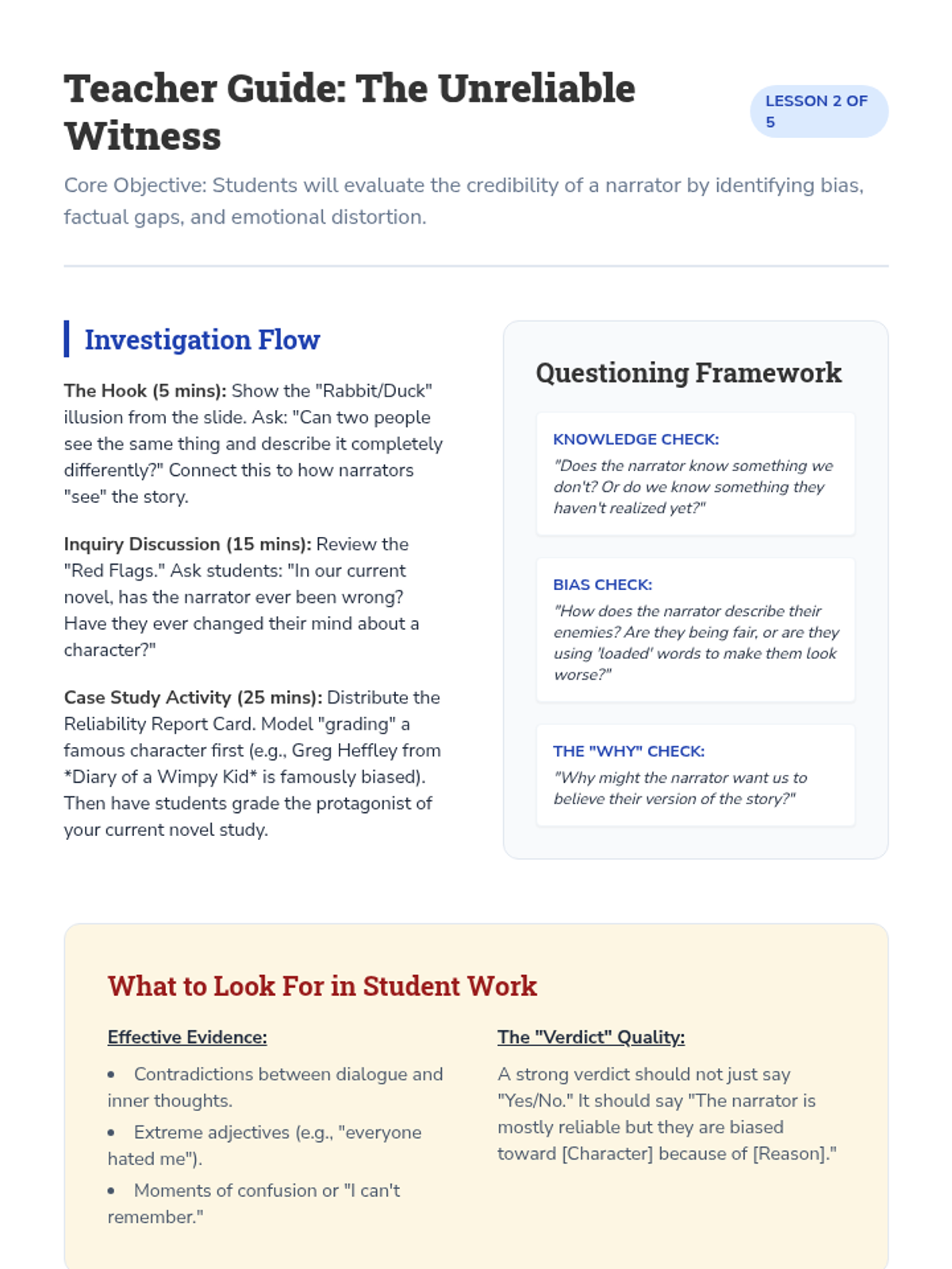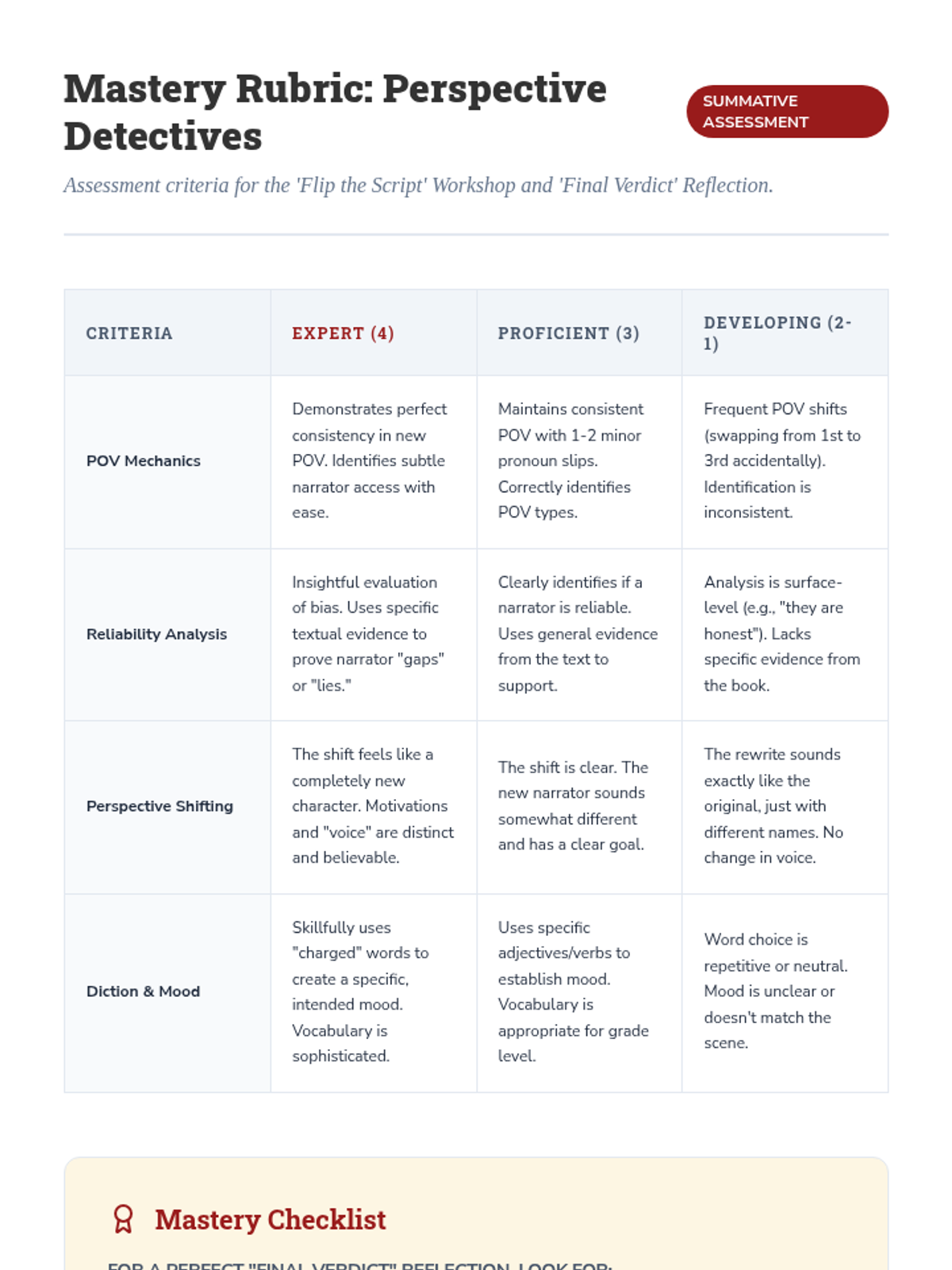 A comprehensive 7th-grade ELA sequence exploring the mechanics and impact of Point of View (POV). Students analyze how narrator perspective, reliability, and bias shape a story's truth, culminating in a creative perspective-shifting workshop and synthesis reflection.