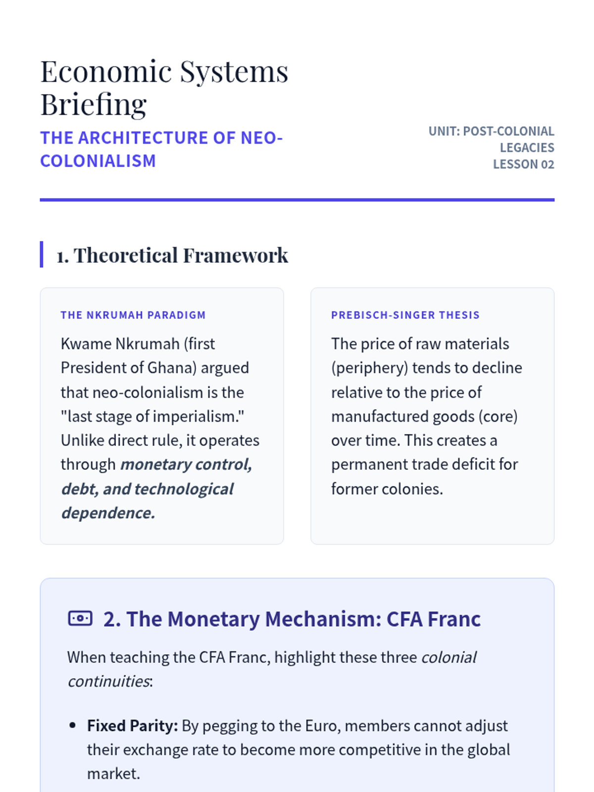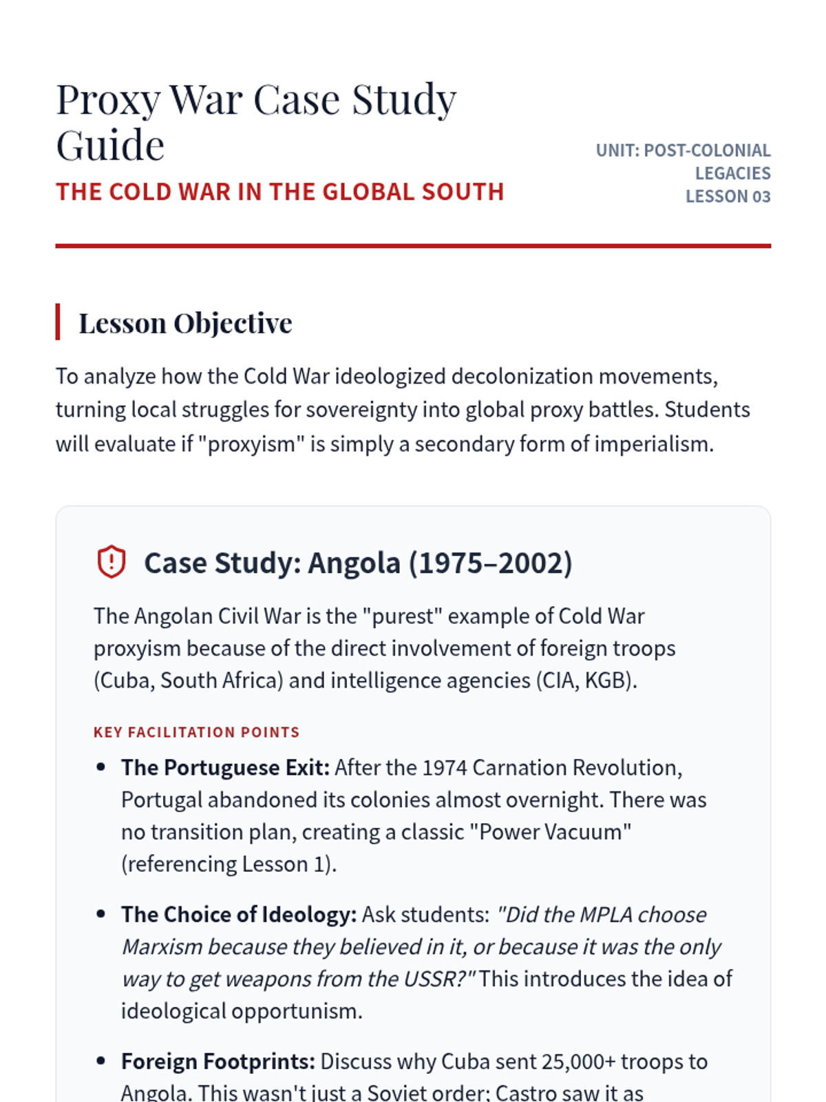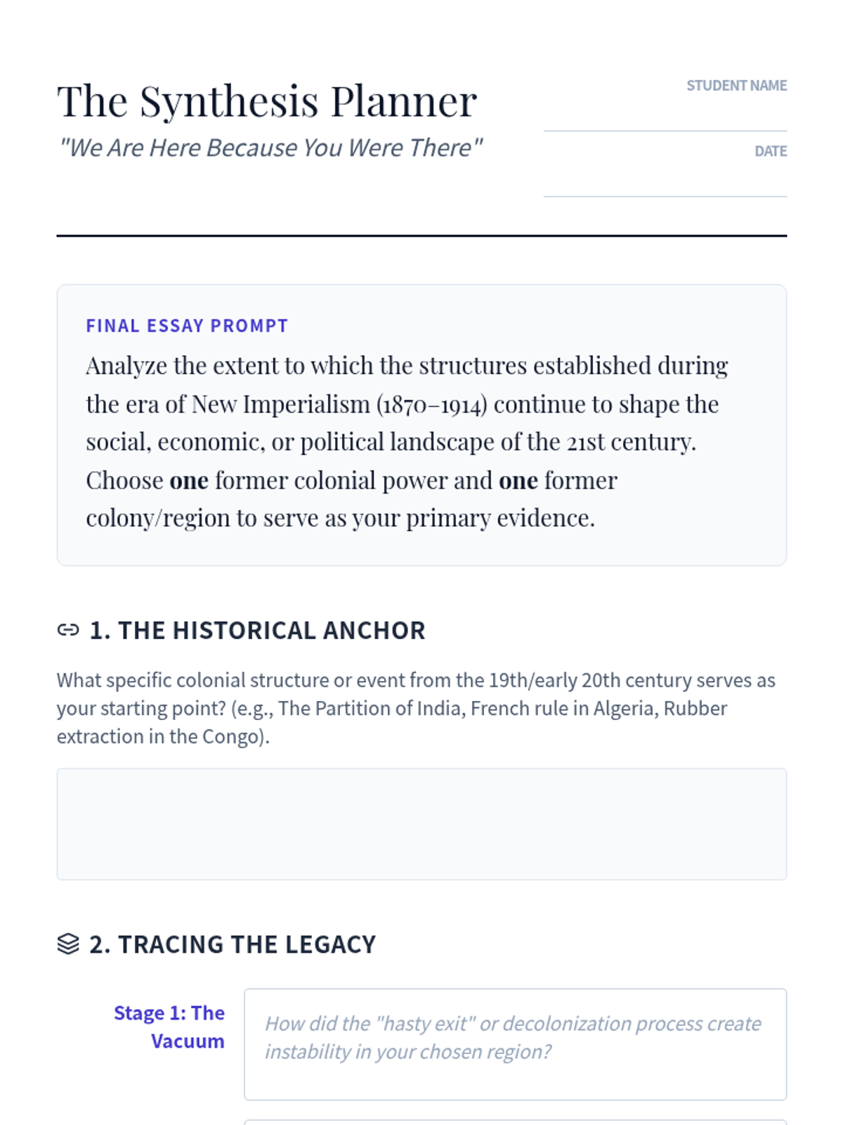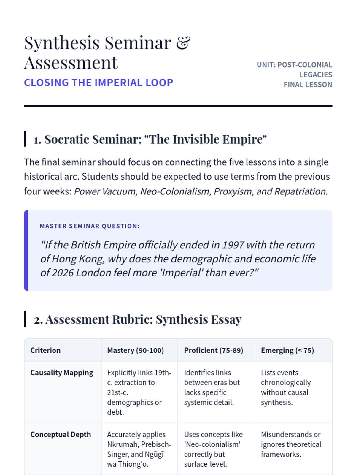 This sequence examines the historical transition from imperialism to the modern era, analyzing decolonization, neo-colonial structures, Cold War proxy conflicts, and the contemporary debates over memory and migration. Students will evaluate how colonial structures persist in global economics and geopolitics today.