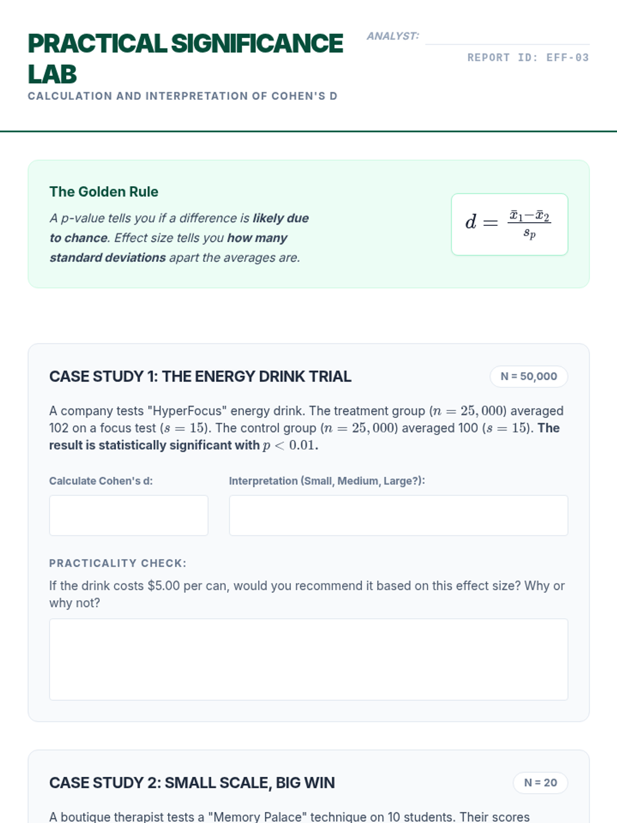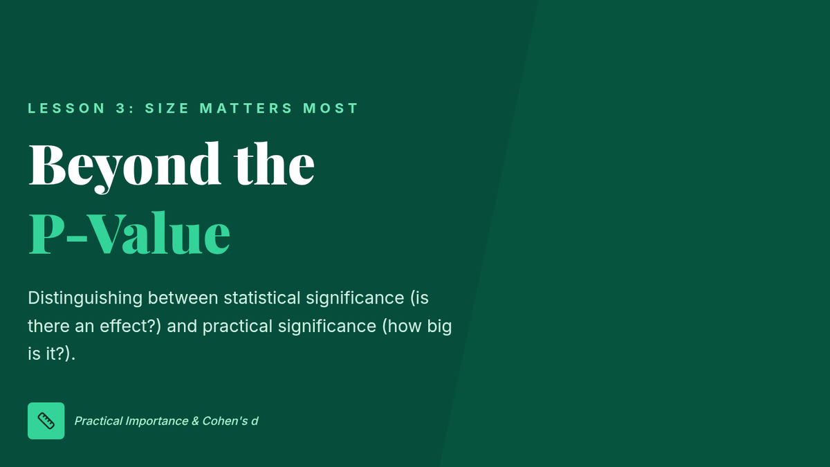 An advanced exploration of statistical power, error types, and effect sizes in the context of comparing two populations, teaching students to look beyond p-values to evaluate the practical importance and reliability of scientific findings.