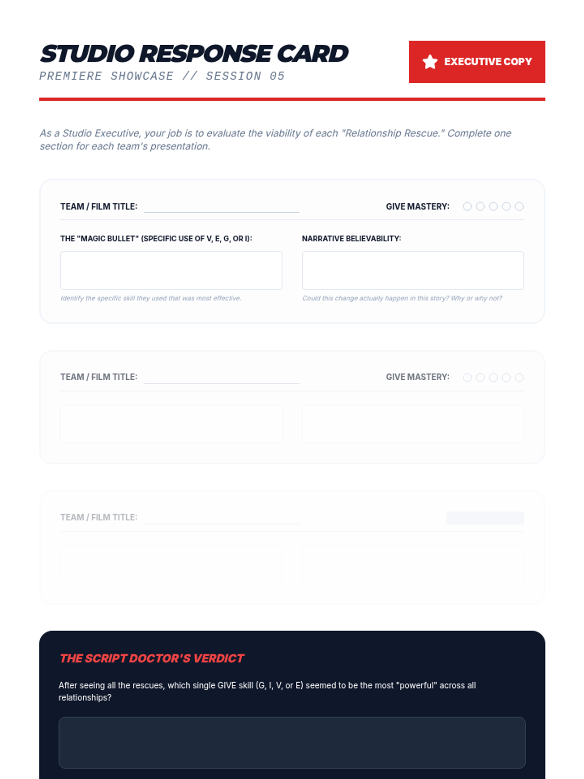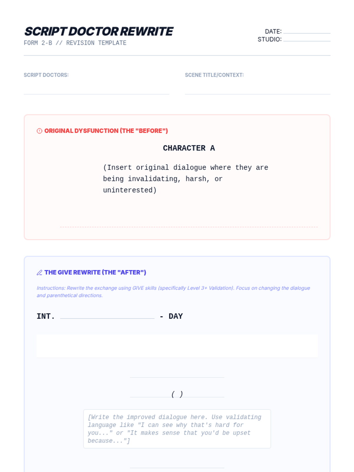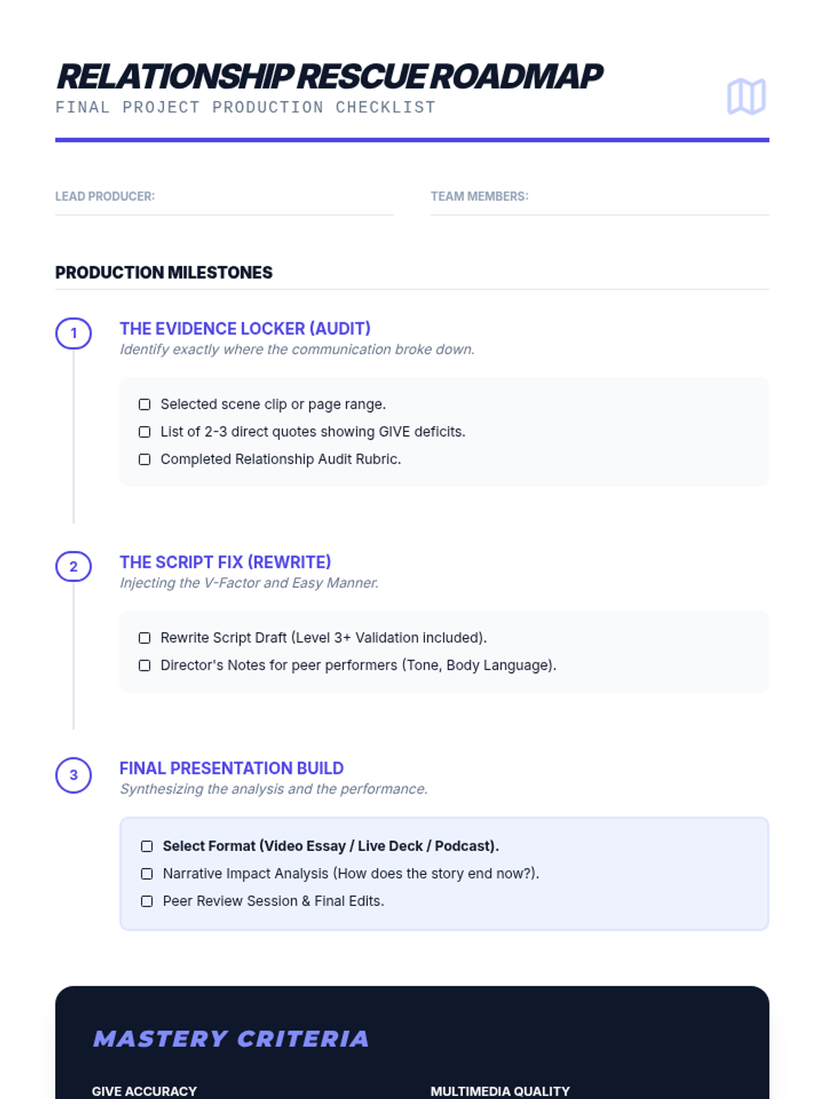 Students act as 'Relationship Script Doctors' to analyze and rewrite fictional interpersonal interactions using GIVE skills (Gentle, Interested, Validate, Easy manner). By auditing and fixing dysfunctional relationships in literature and film, students master communication variables that influence relationship outcomes.