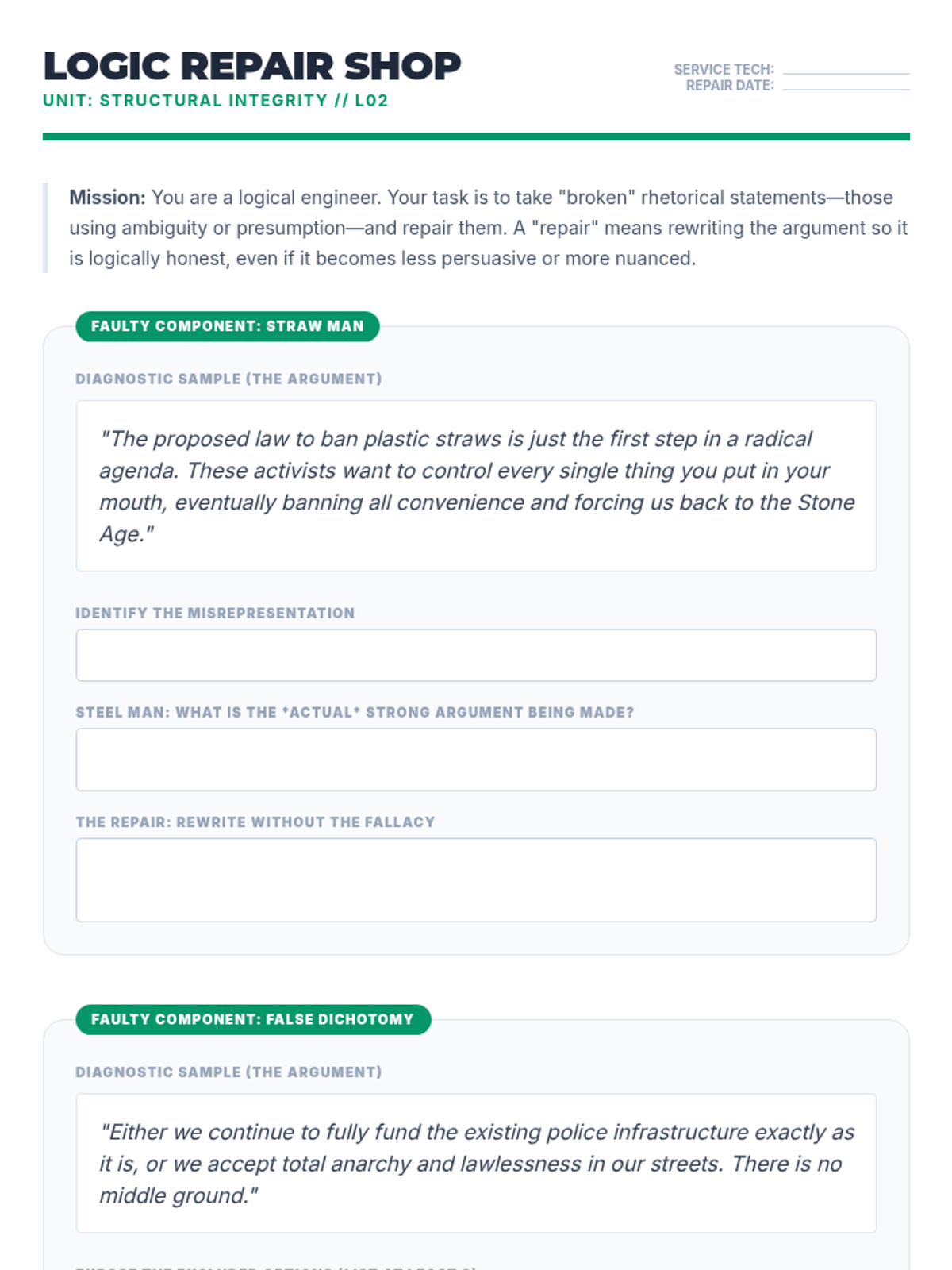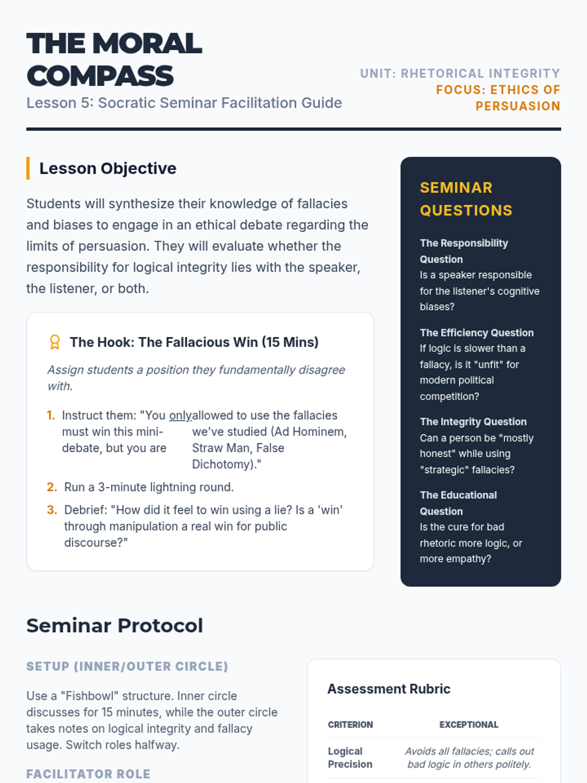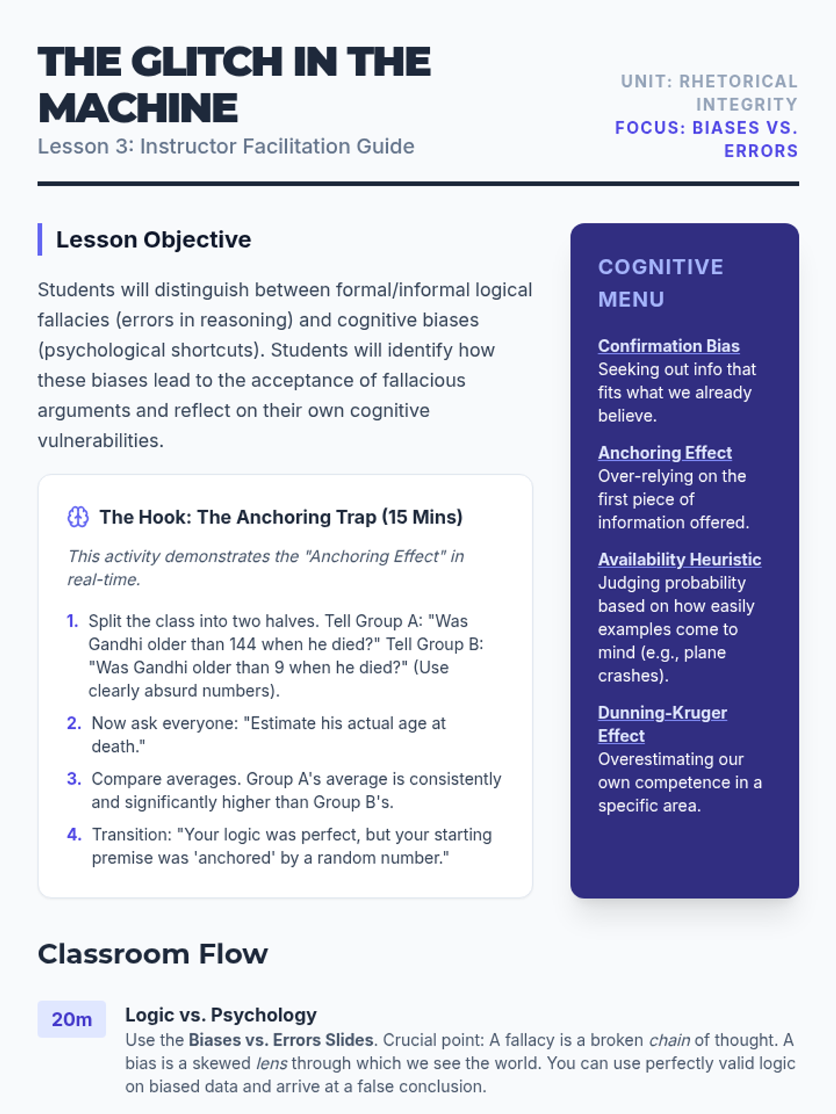 A comprehensive unit for undergraduate students on identifying and deconstructing logical fallacies and cognitive biases in public discourse. Students develop the critical thinking skills necessary to evaluate the integrity of arguments in politics, media, and everyday life.
