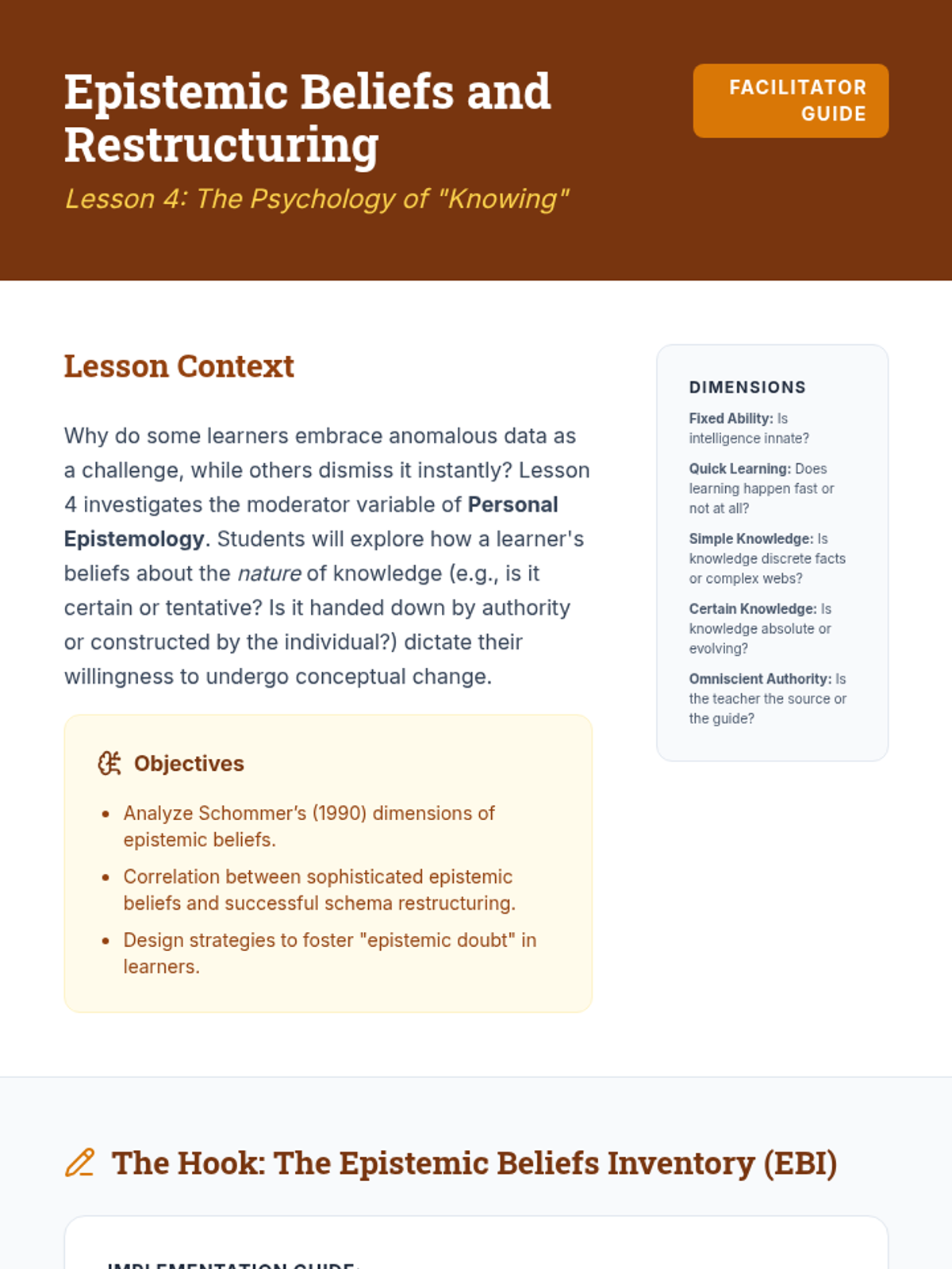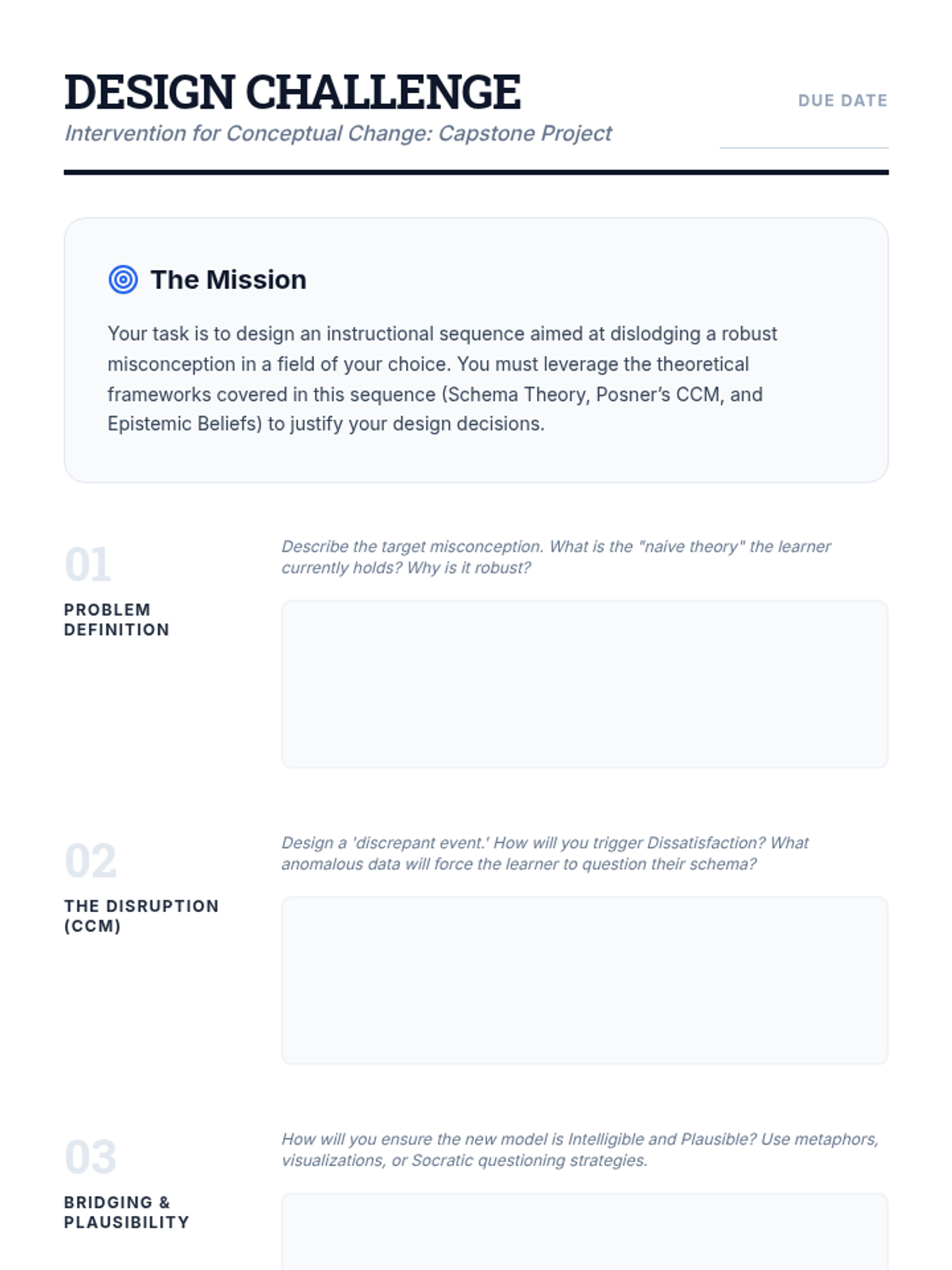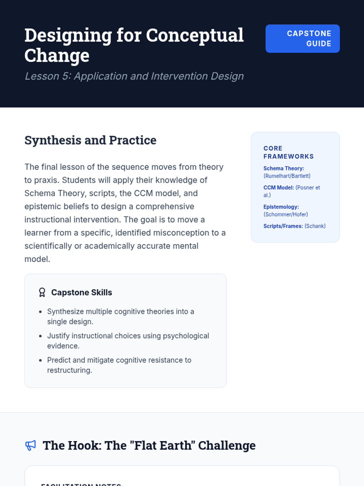 This graduate-level psychology sequence explores the cognitive architectures of learning, focusing on Schema Theory and the complex process of conceptual change. Students move from understanding how knowledge is organized to designing interventions that facilitate the restructuring of deeply held mental models.