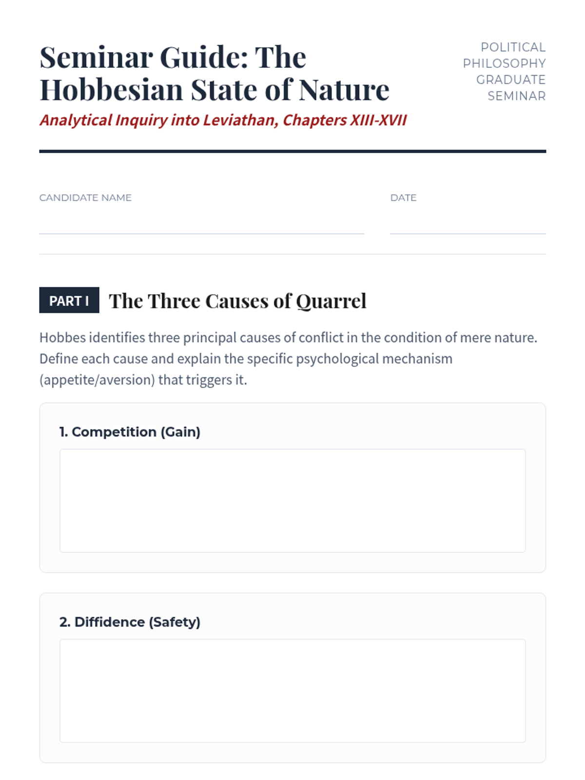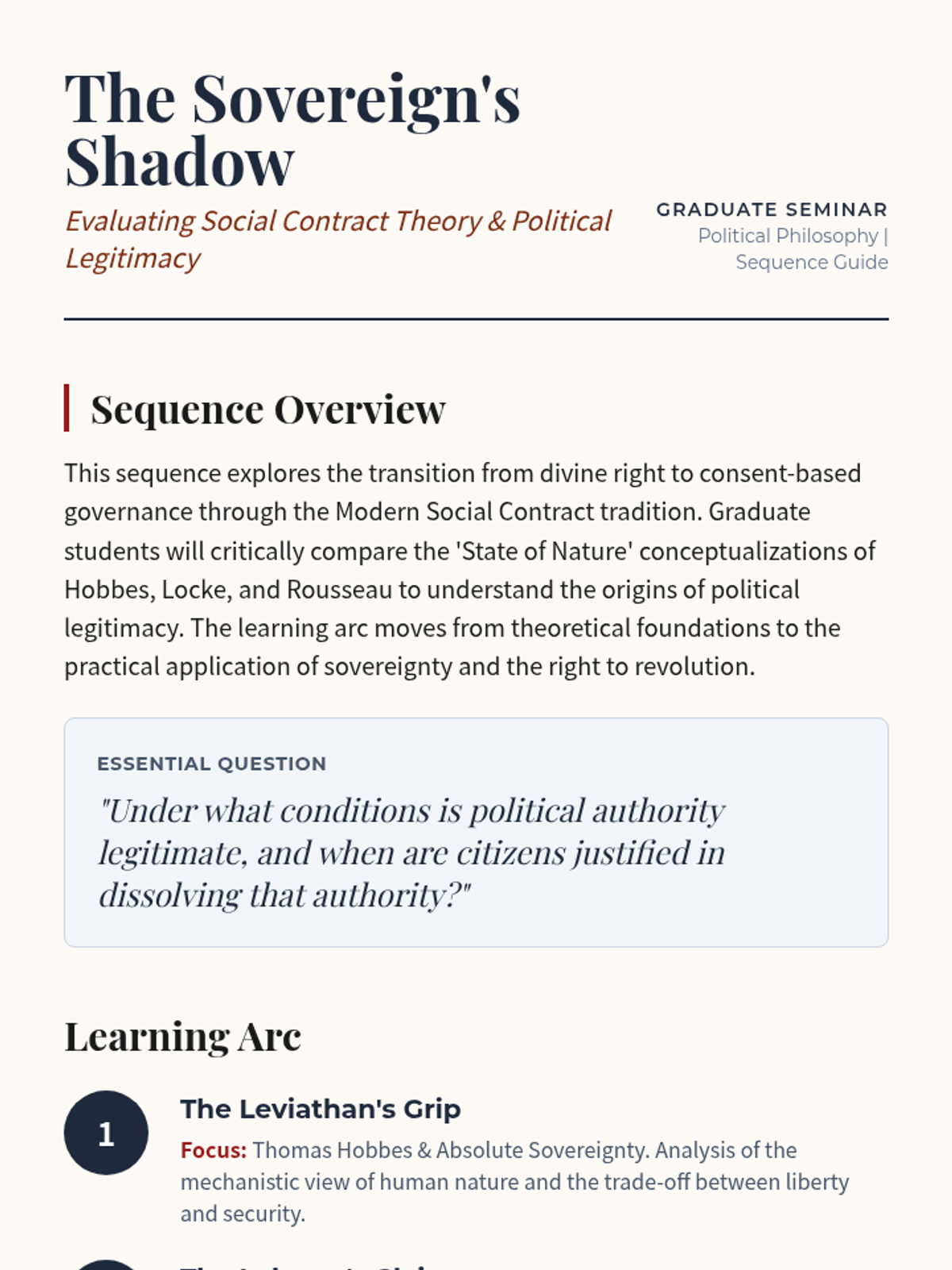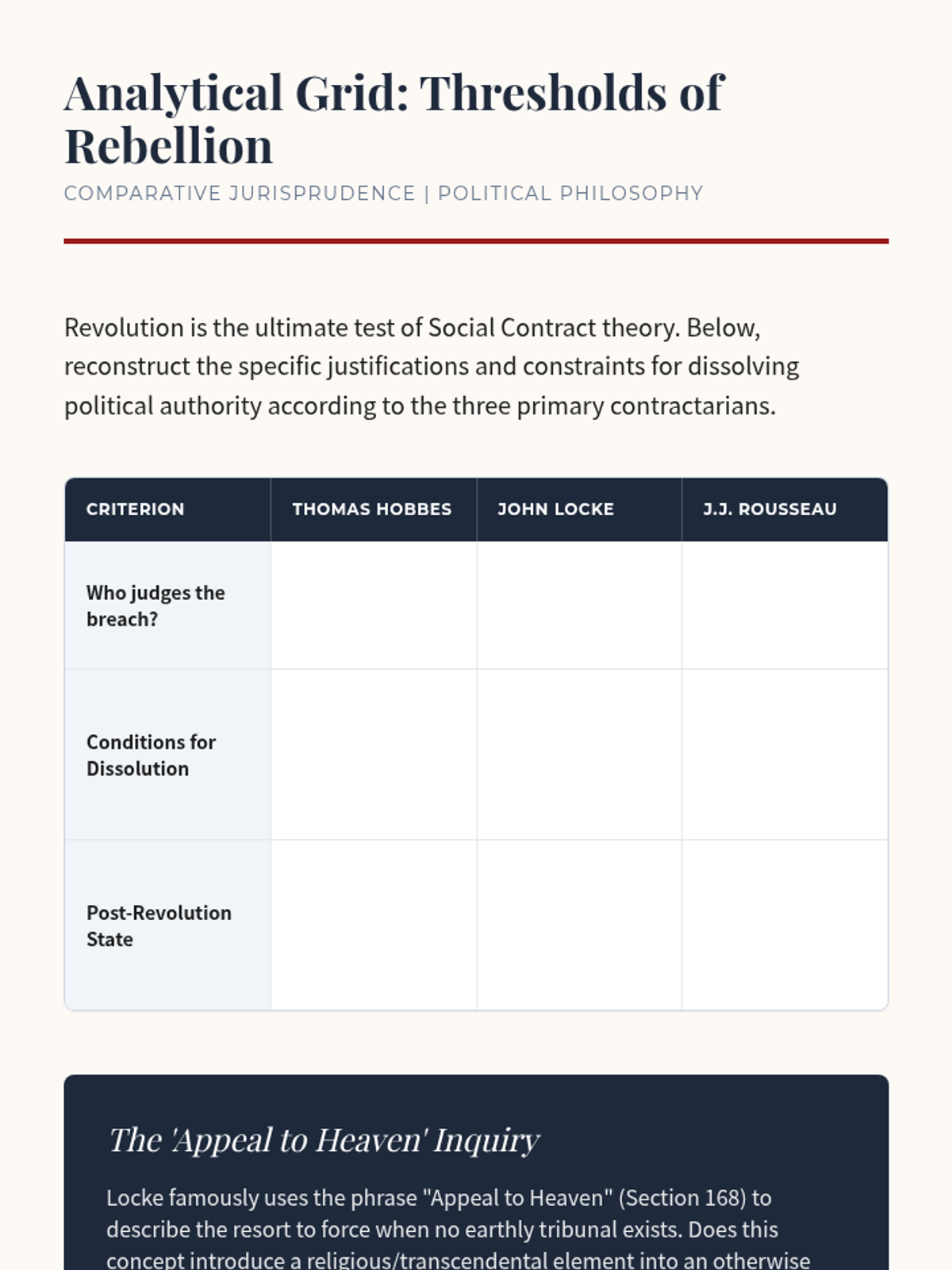 A graduate-level exploration of Social Contract Theory, focusing on the works of Hobbes, Locke, and Rousseau, and their implications for political legitimacy and the right to revolution.