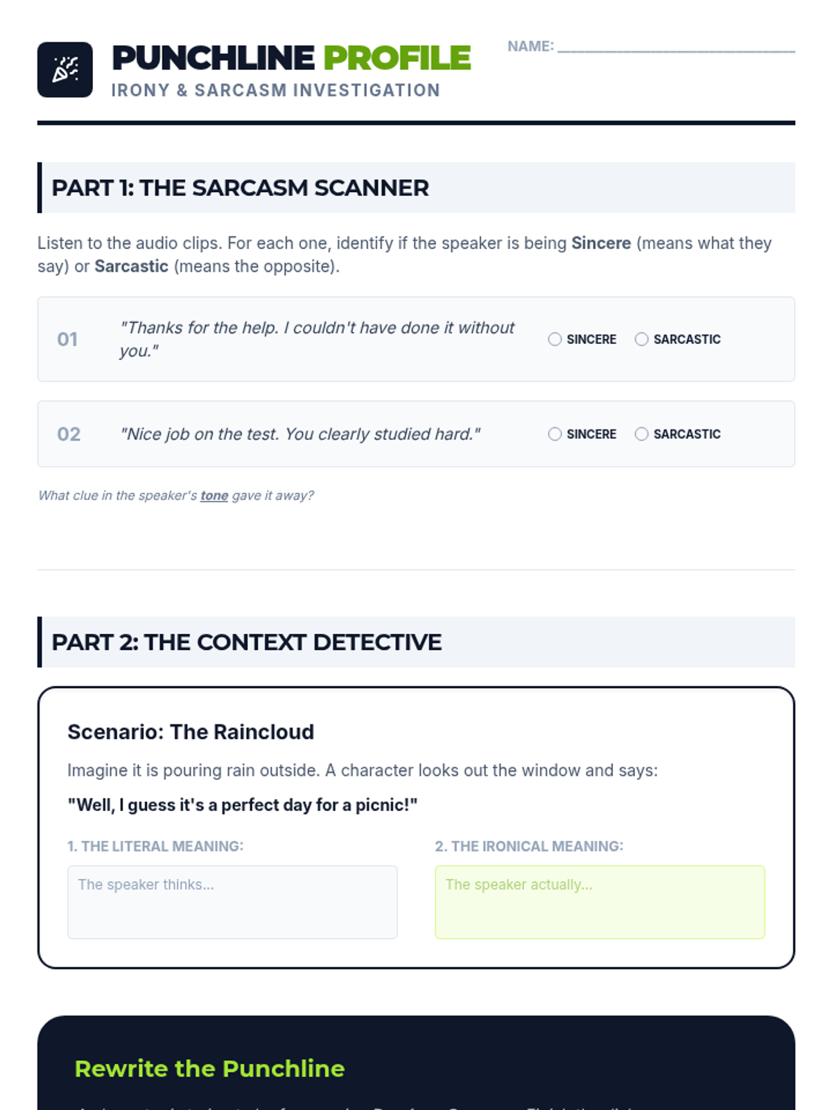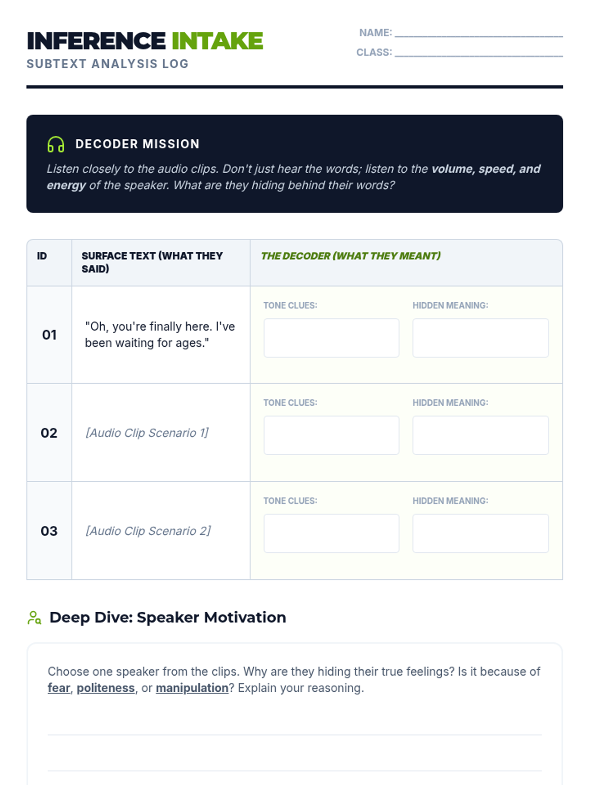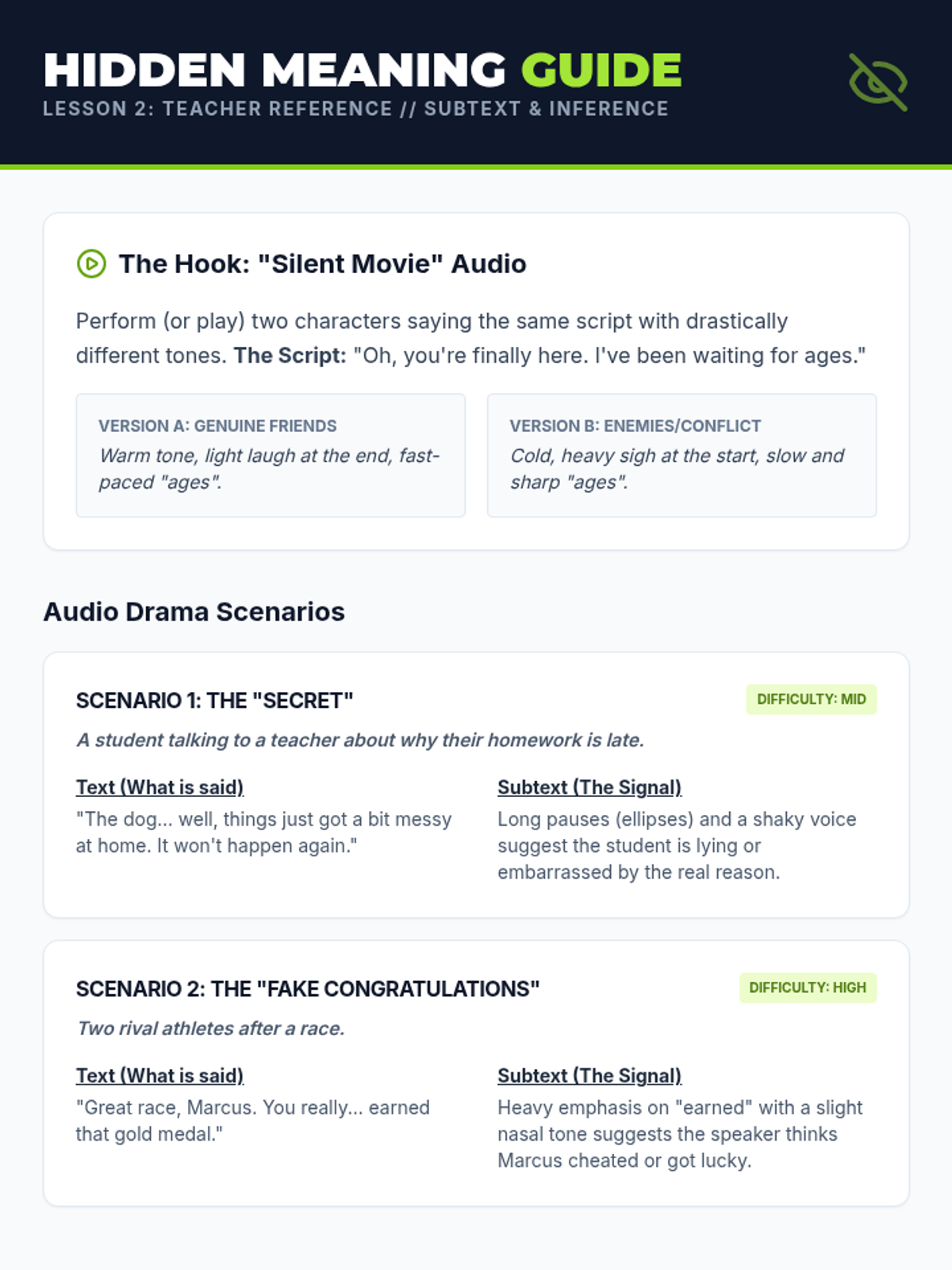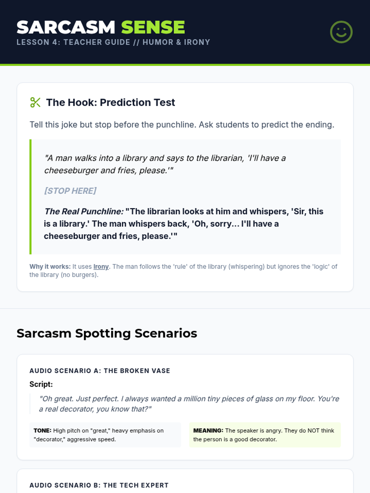 This sequence guides intermediate ESL students through the nuances of pragmatic meaning in English. Students will learn to decode indirect speech, sarcasm, hedging language, and emotional undertones in academic and social contexts to improve their listening comprehension and communicative competence.