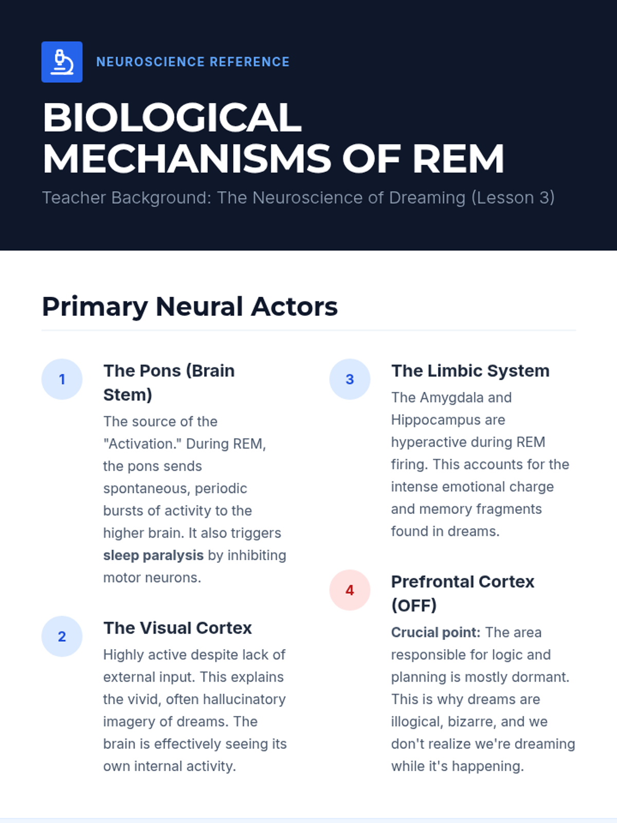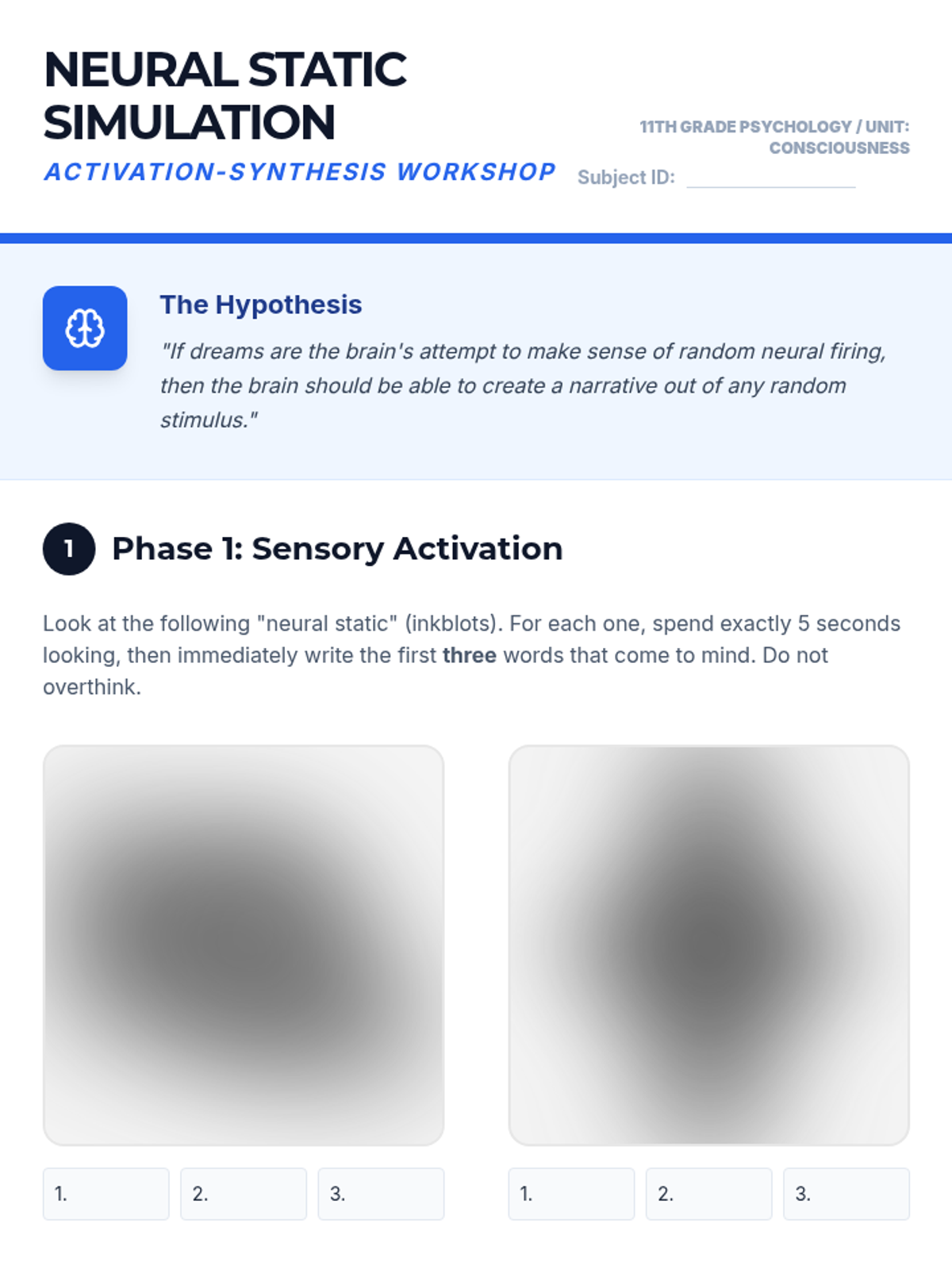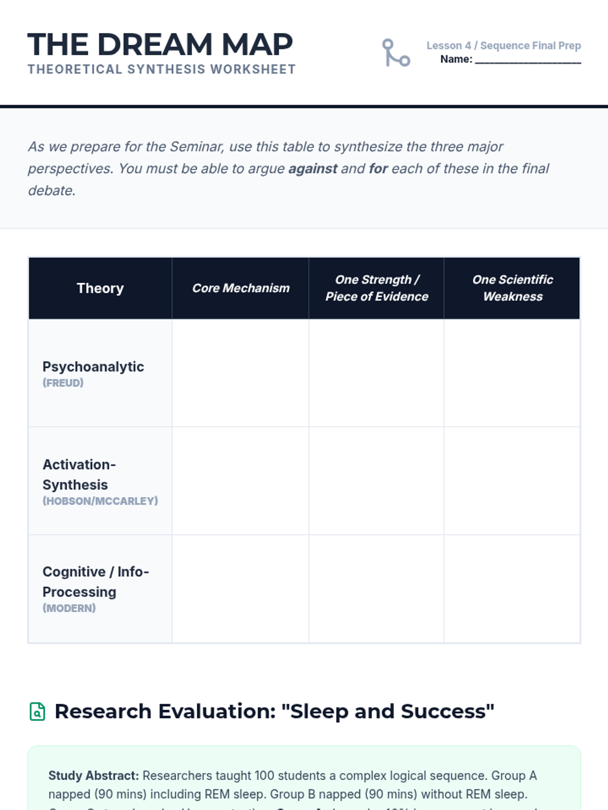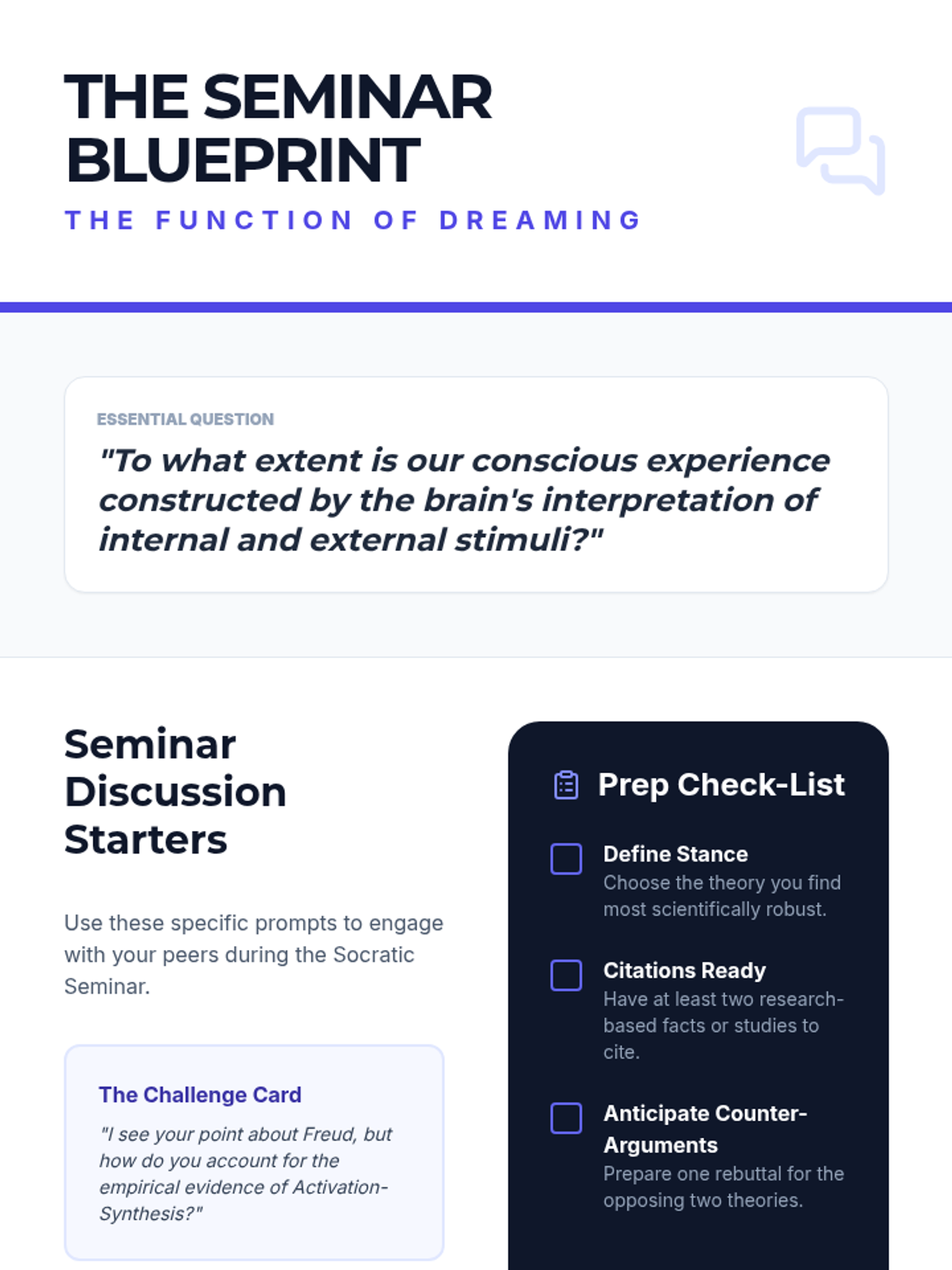 A comprehensive 11th-grade psychology unit exploring consciousness, attention, and the major theories of dreaming, from Freudian psychoanalysis to modern neurobiological and cognitive models. Students move from defining conscious awareness to critiquing scientific evidence in a culminating seminar on the function of dreams.