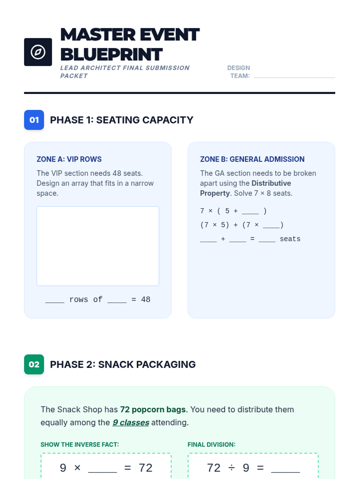 Students apply multiplication and division concepts to design a school event layout. They transition from concrete arrays and groups to abstract inverse operations and properties, culminating in a comprehensive design project.