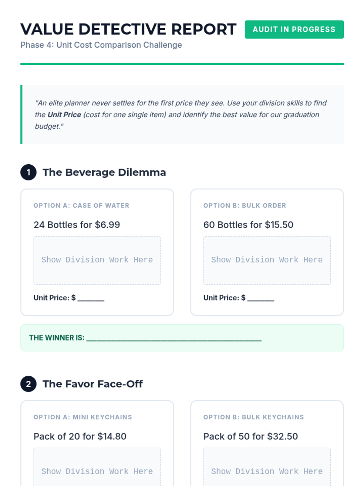 A project-based math sequence for 5th graders where they act as event planners. Students apply multi-digit multiplication, division, and decimal operations to plan and budget a large-scale event within strict constraints.