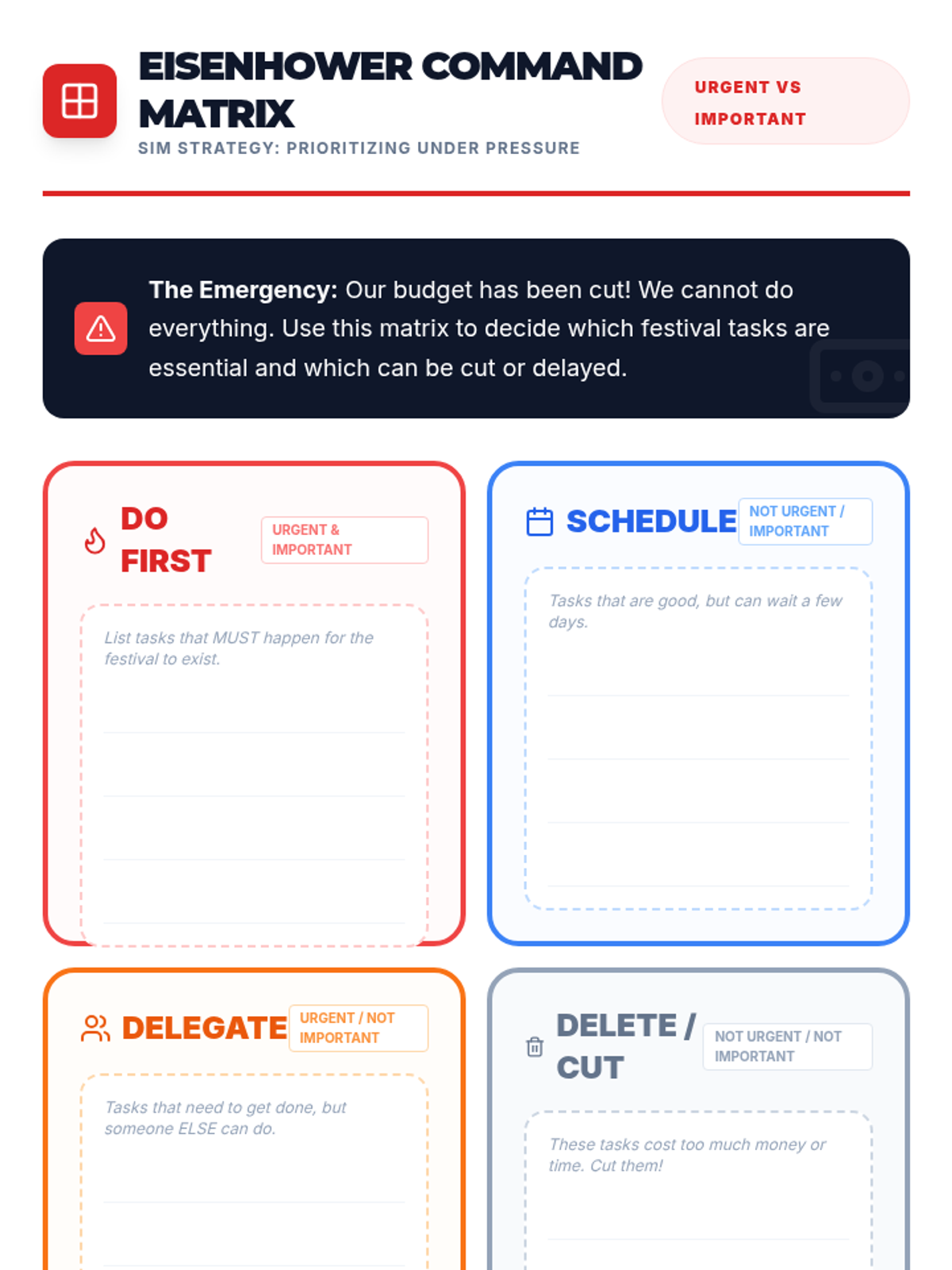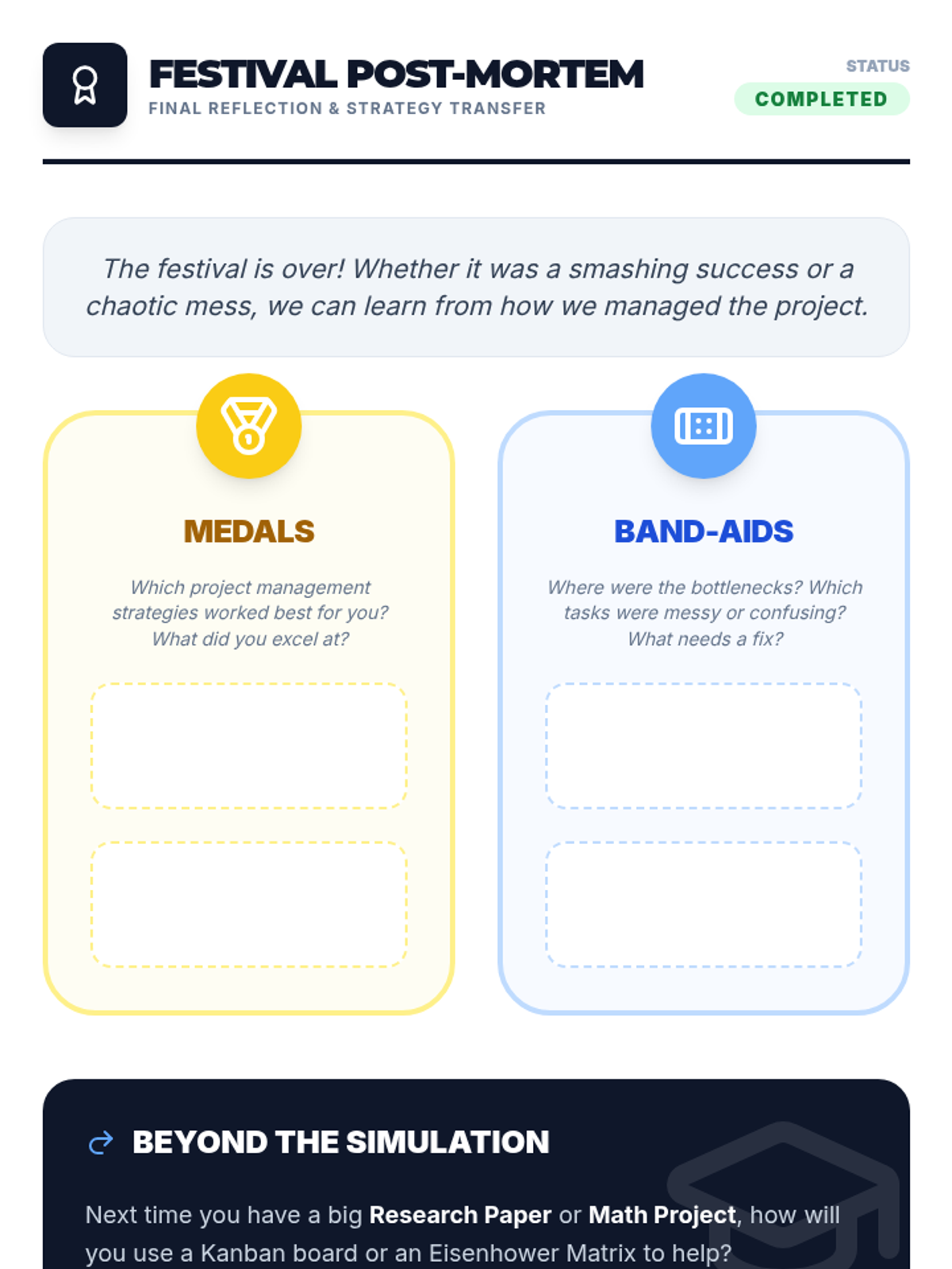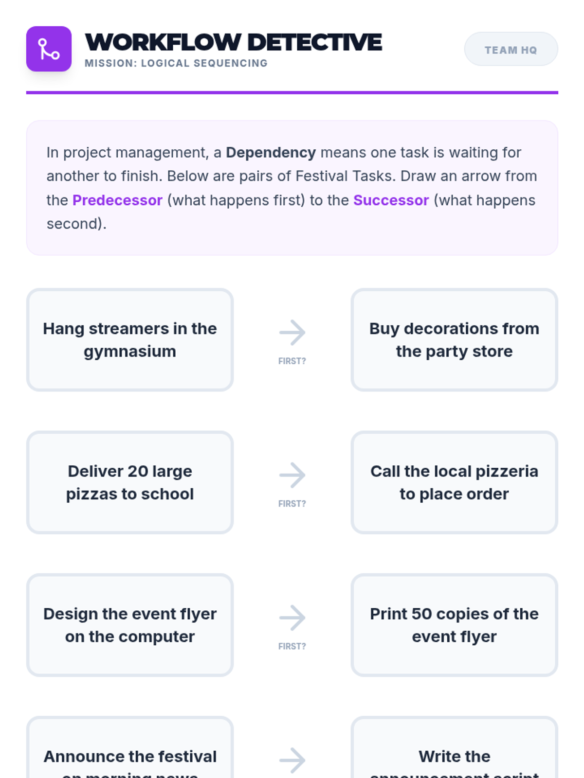 A simulation-based sequence where 6th-grade students act as Event Planners for a school festival to master multi-day project management, workflow visualization, and adaptability.