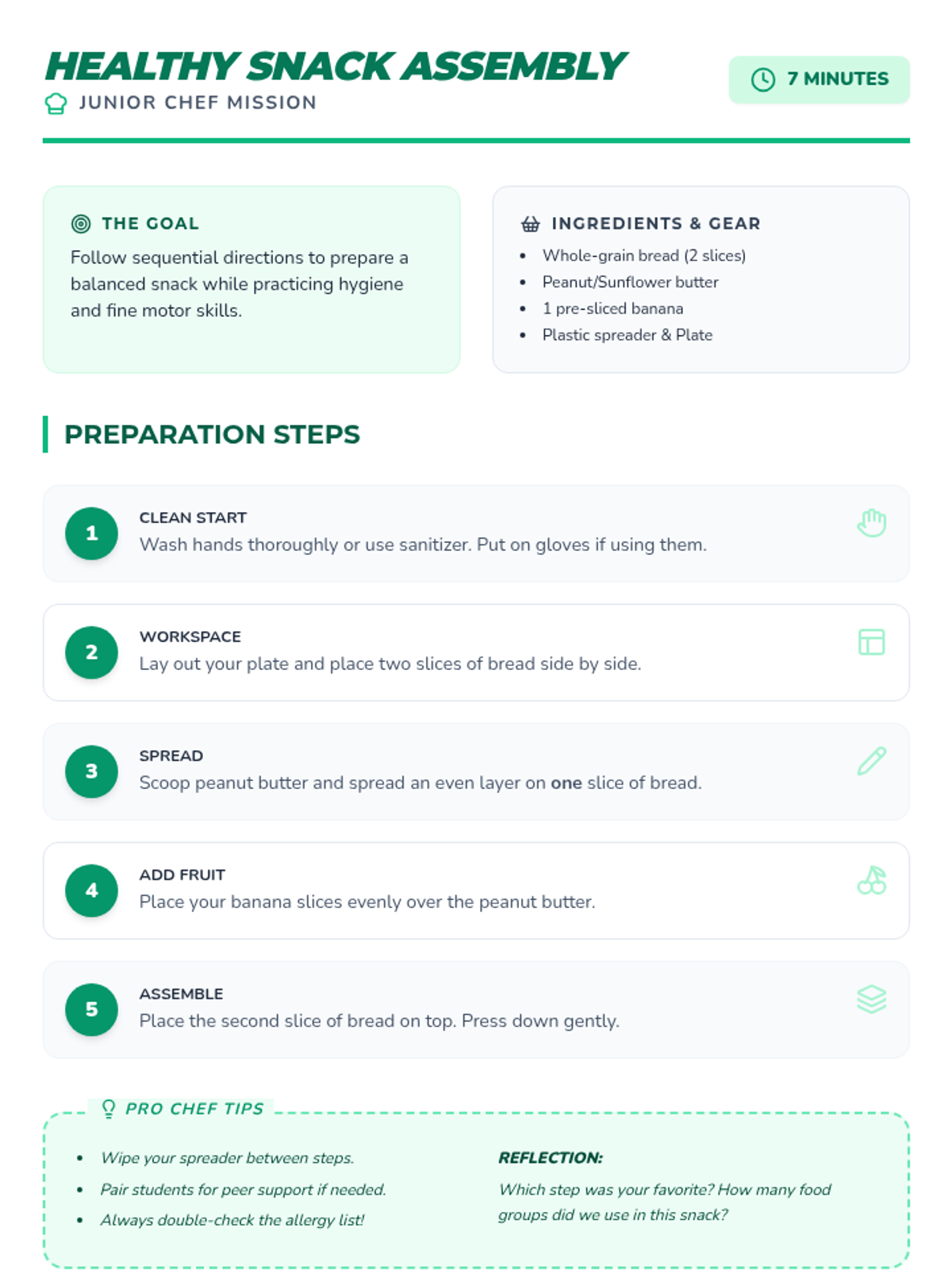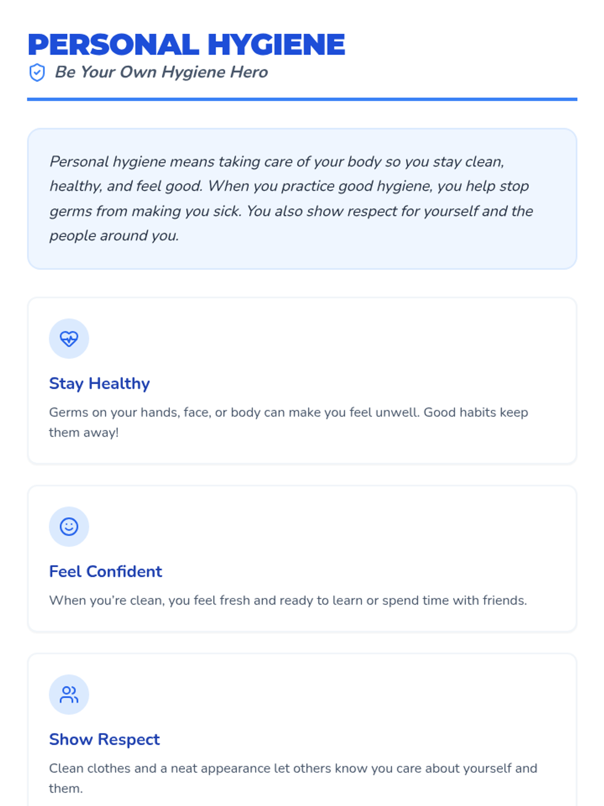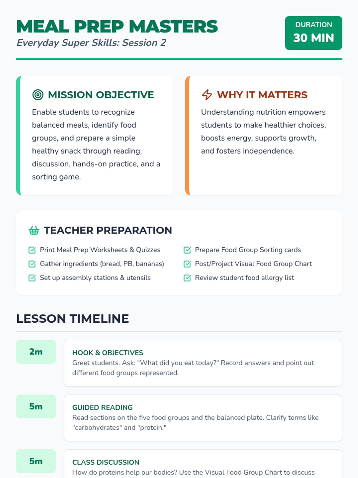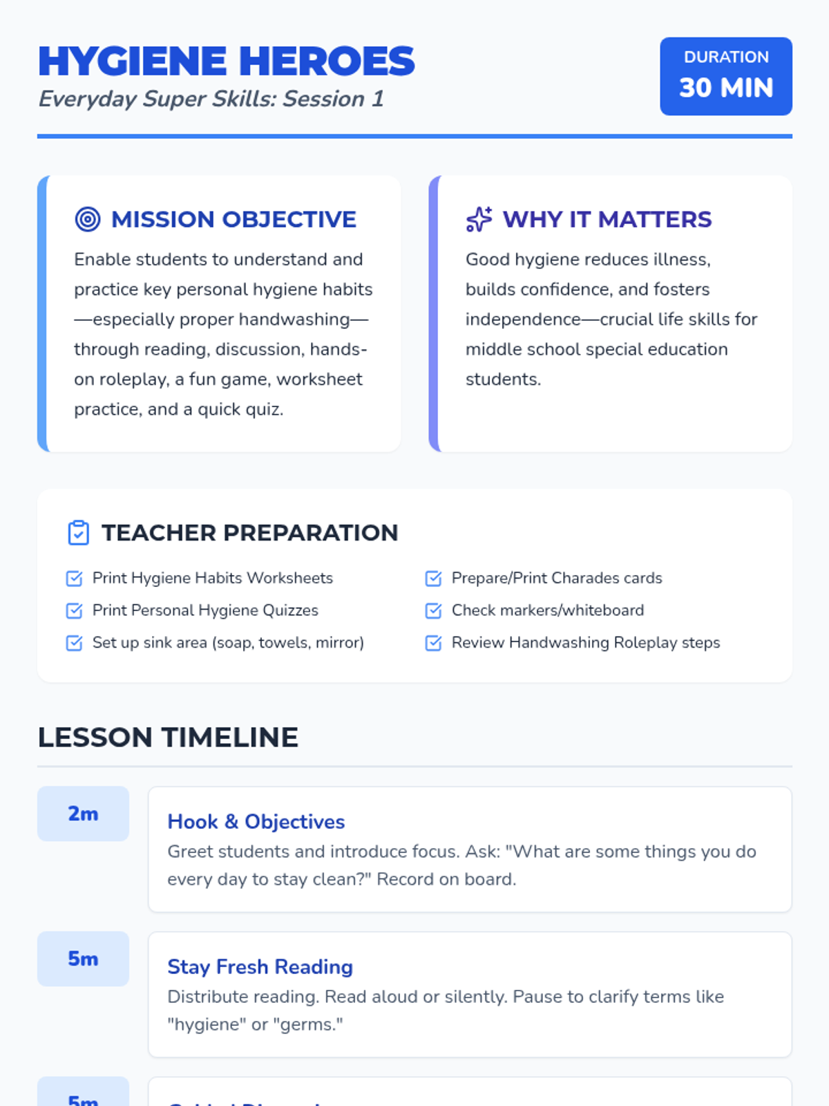 A two-session sequence designed for middle school special education students to develop essential life skills in personal hygiene and healthy meal preparation. Each session combines interactive reading, hands-on activities, and gamified learning to foster independence and confidence.