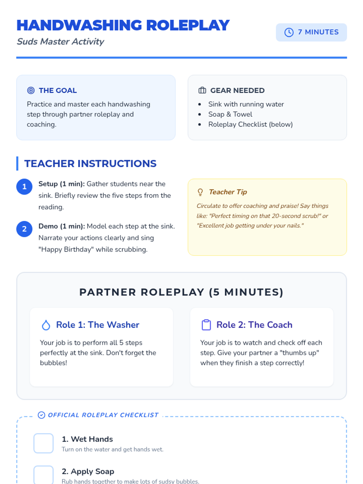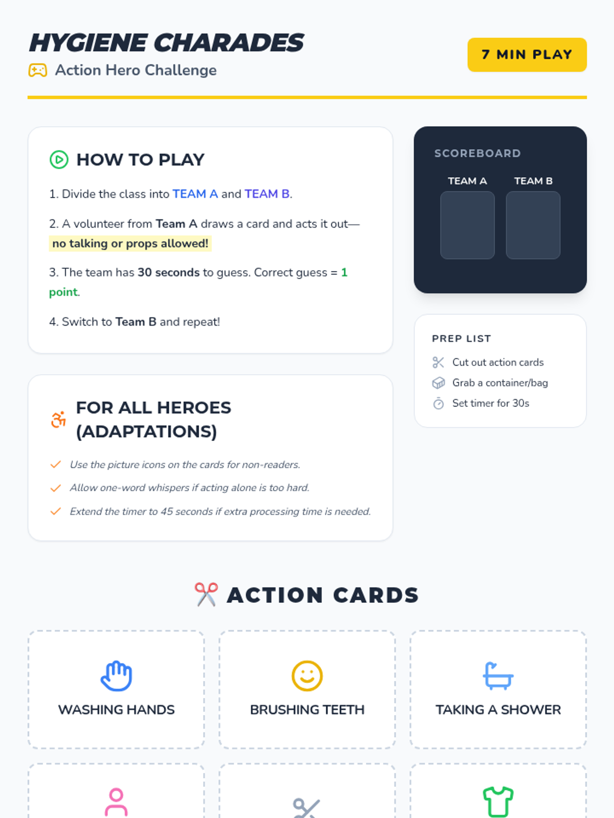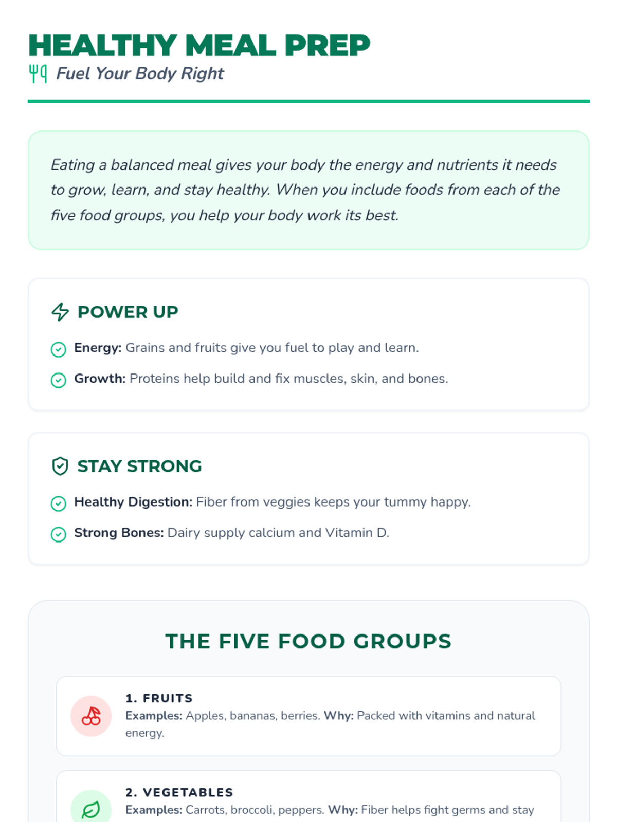 A two-session sequence designed for middle school special education students to develop essential life skills in personal hygiene and healthy meal preparation. Each session combines interactive reading, hands-on activities, and gamified learning to foster independence and confidence.