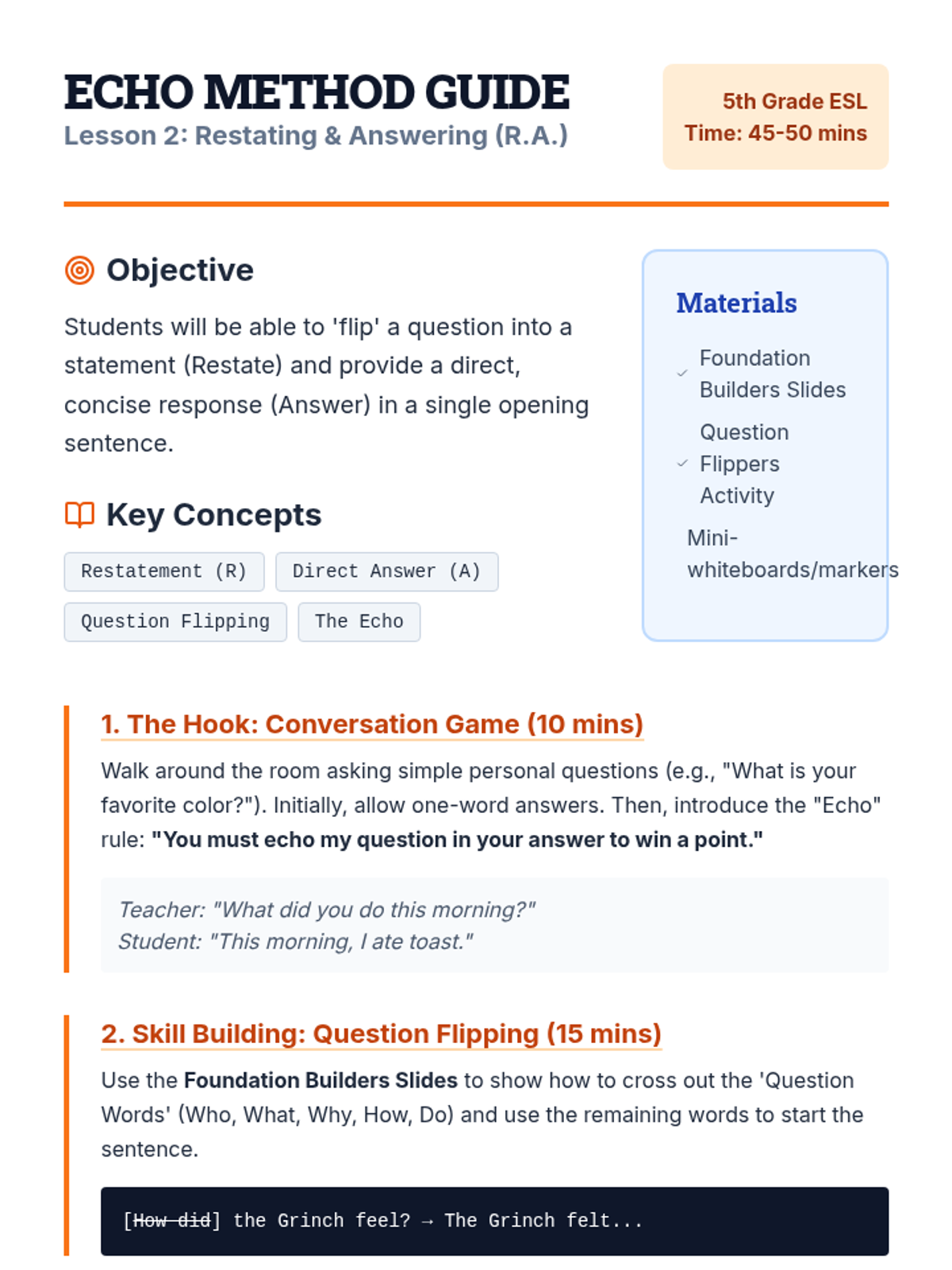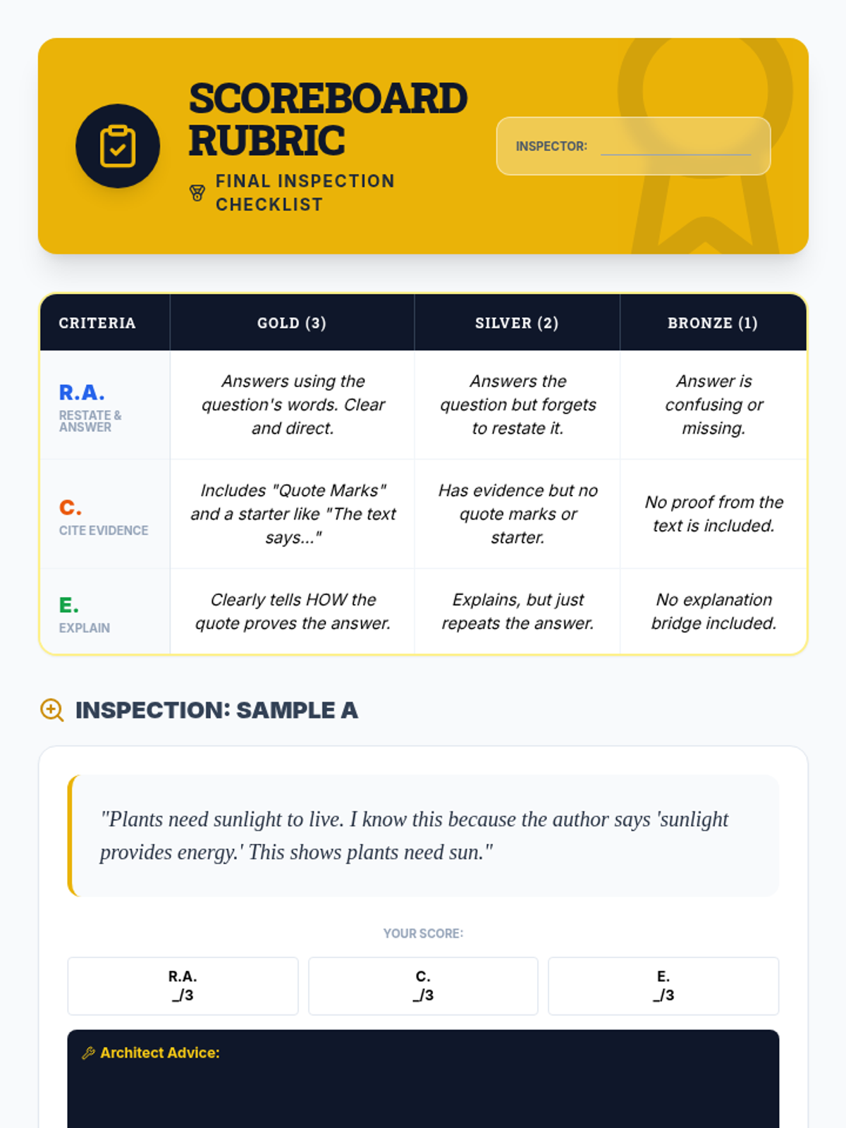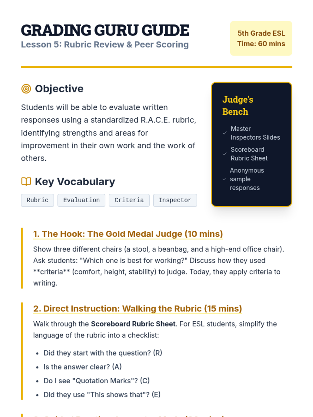 A 5-lesson sequence for 5th-grade ESL students focused on the R.A.C.E. strategy for constructing high-scoring, evidence-based written responses on academic assessments. Students progress from decoding prompt verbs to mastering restatement, evidence citation, and explanation through a 'blueprint and construction' theme.