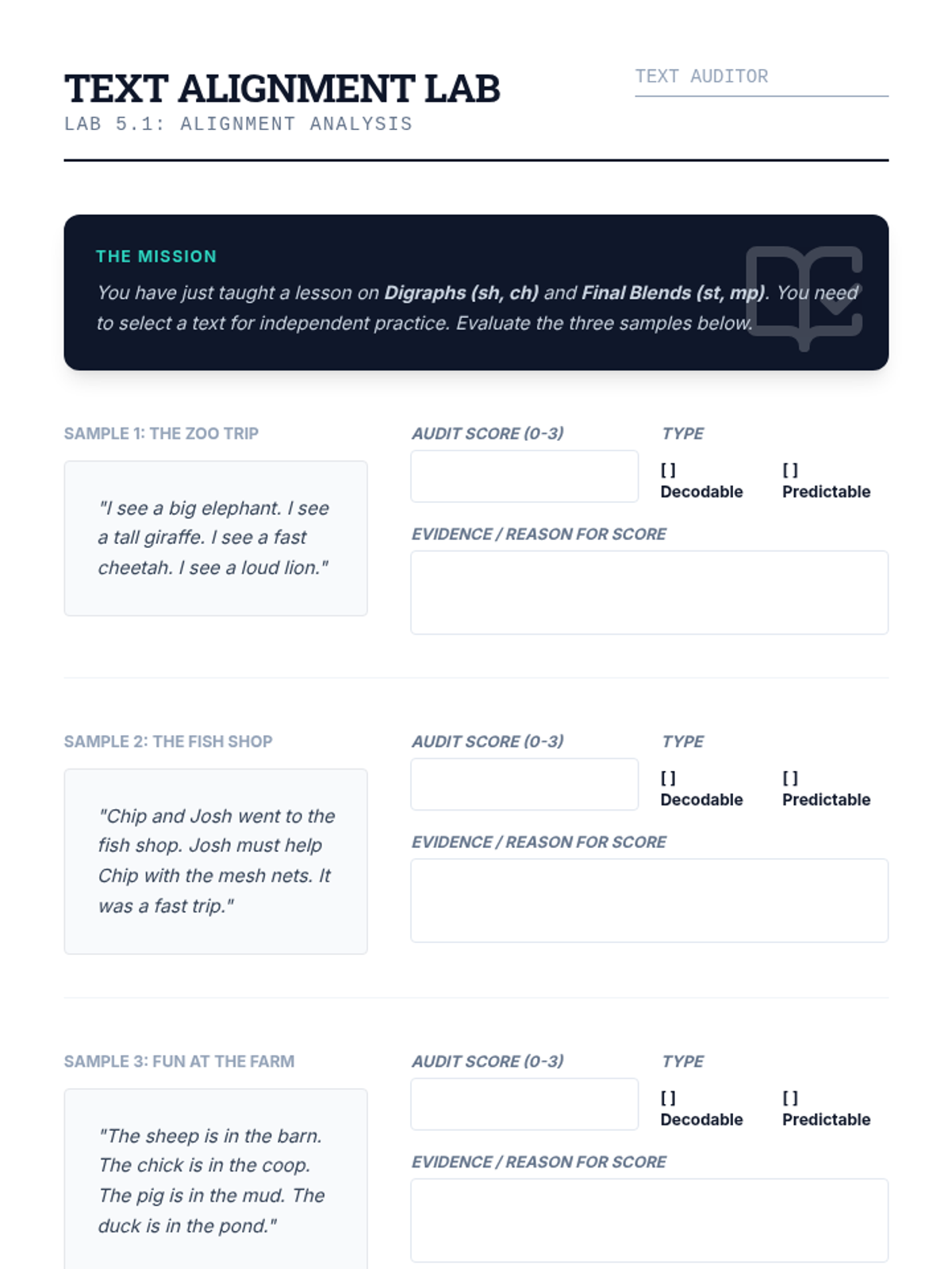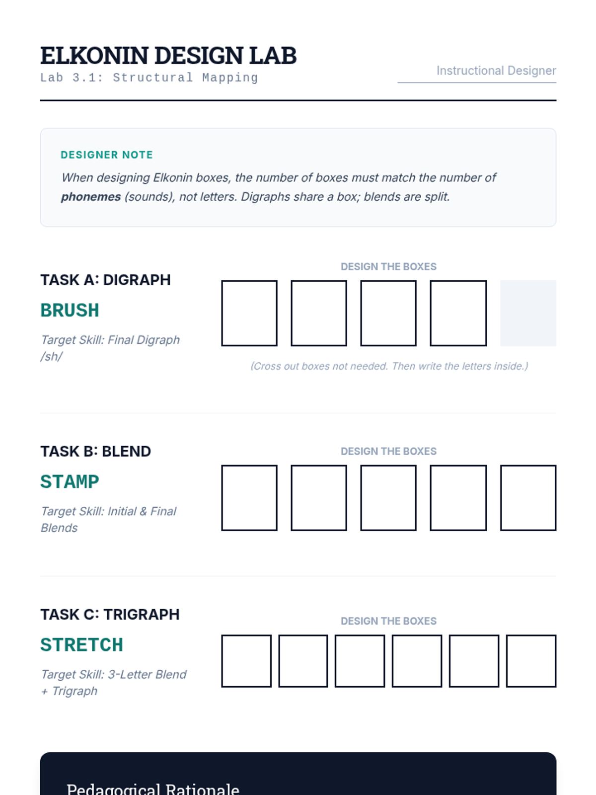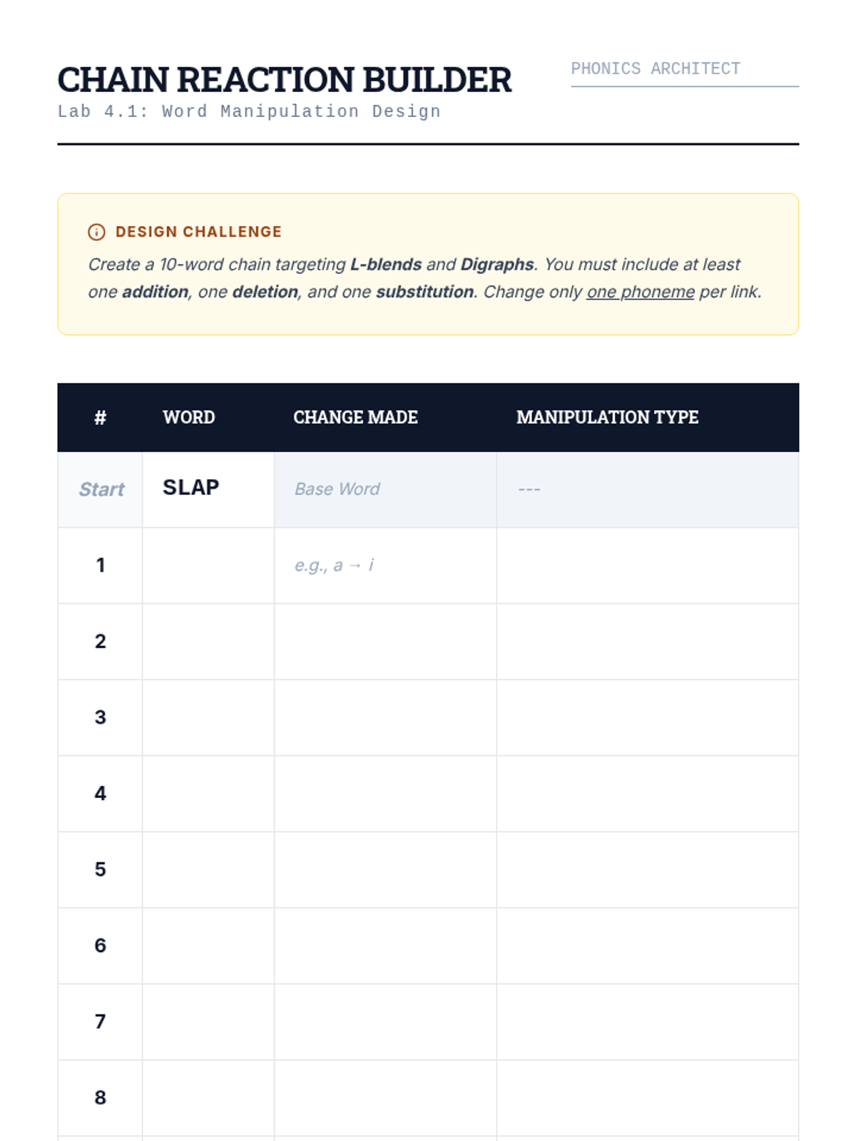 A pedagogical sequence for future educators focusing on evidence-based instructional design for phonics. Students move from curriculum sequencing to designing explicit instruction, orthographic mapping, word chaining, and text selection for blends and digraphs.