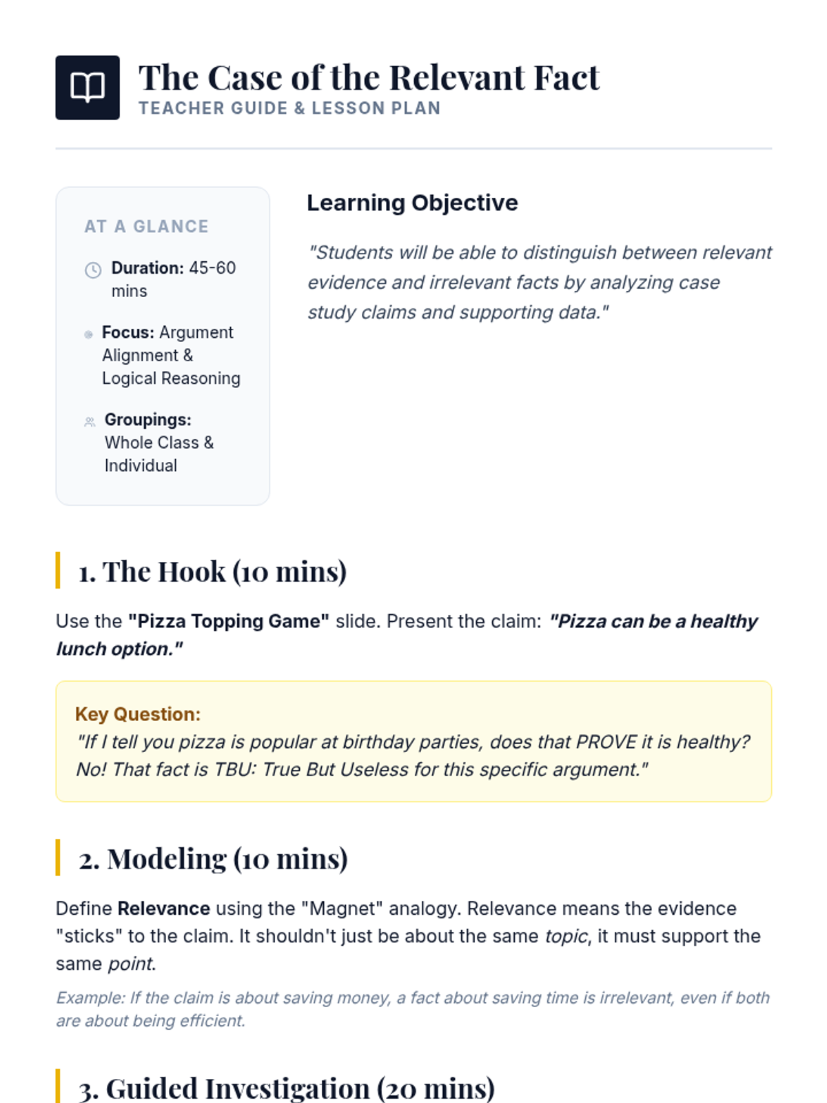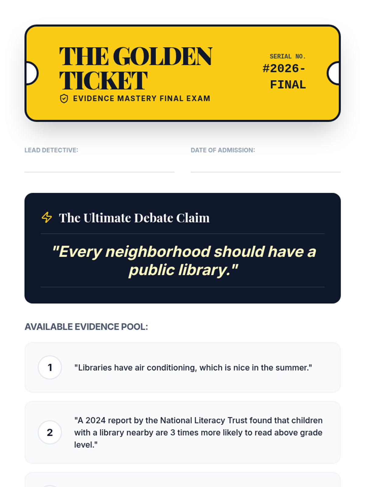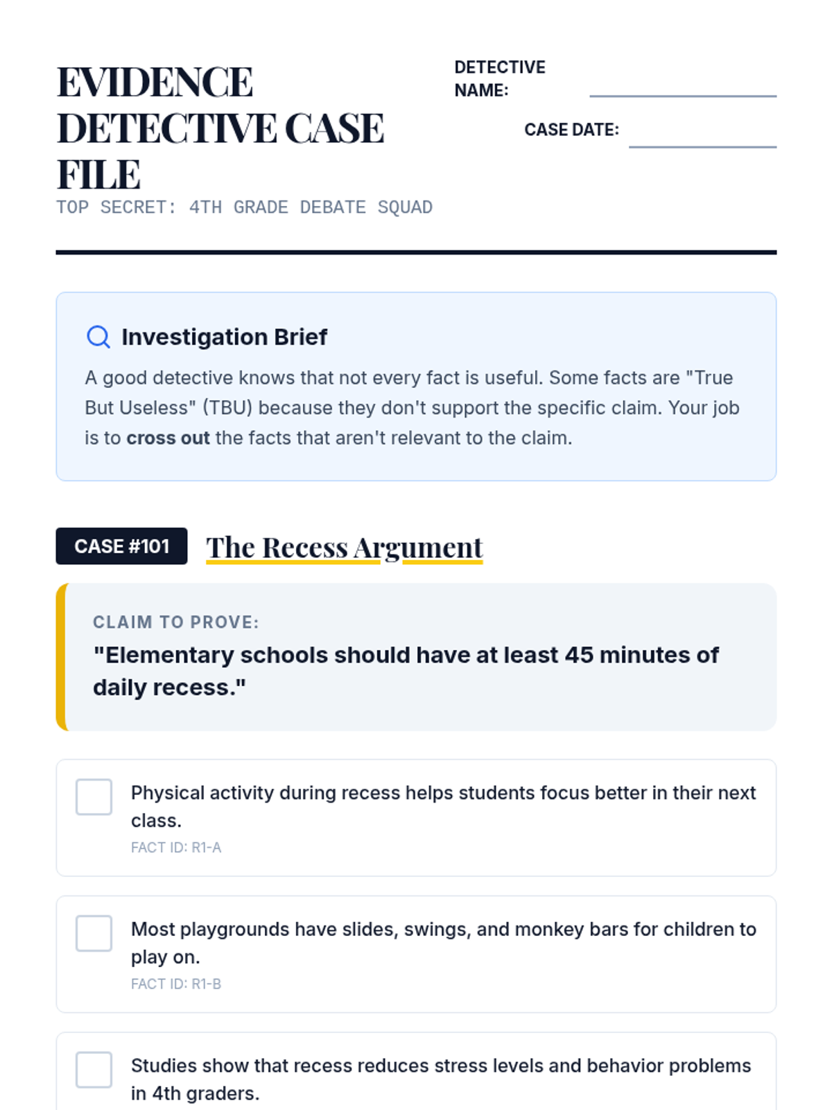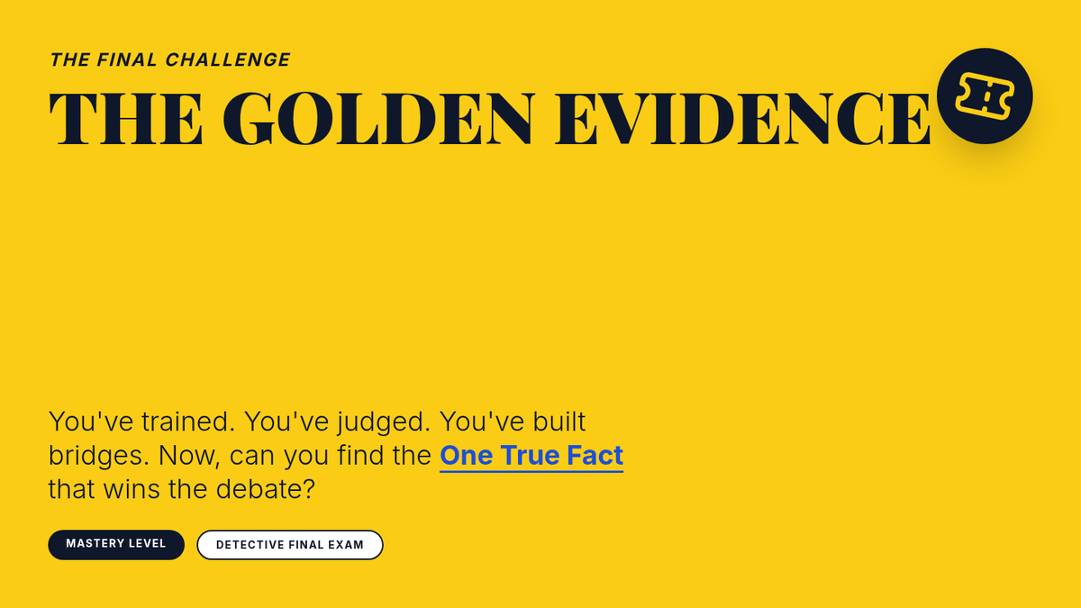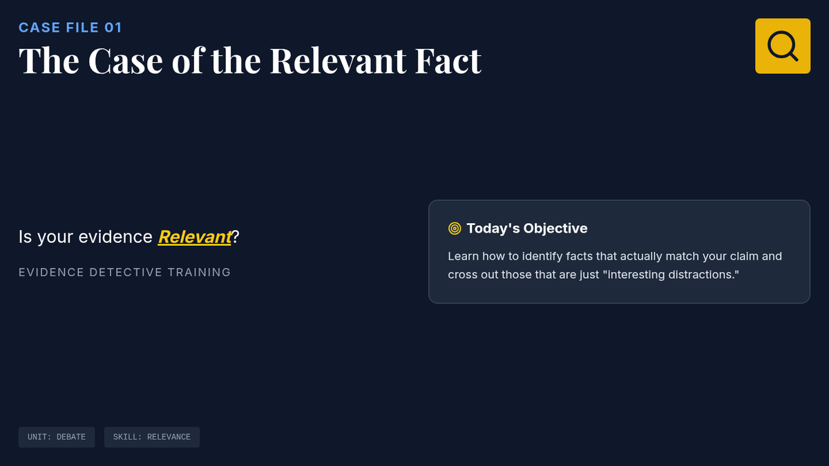 A detective-themed sequence where students become 'Evidence Detectives' to investigate, analyze, and rank the strength of research for debate. Through case studies and games, students learn to distinguish between relevant facts, anecdotes, and statistical data.