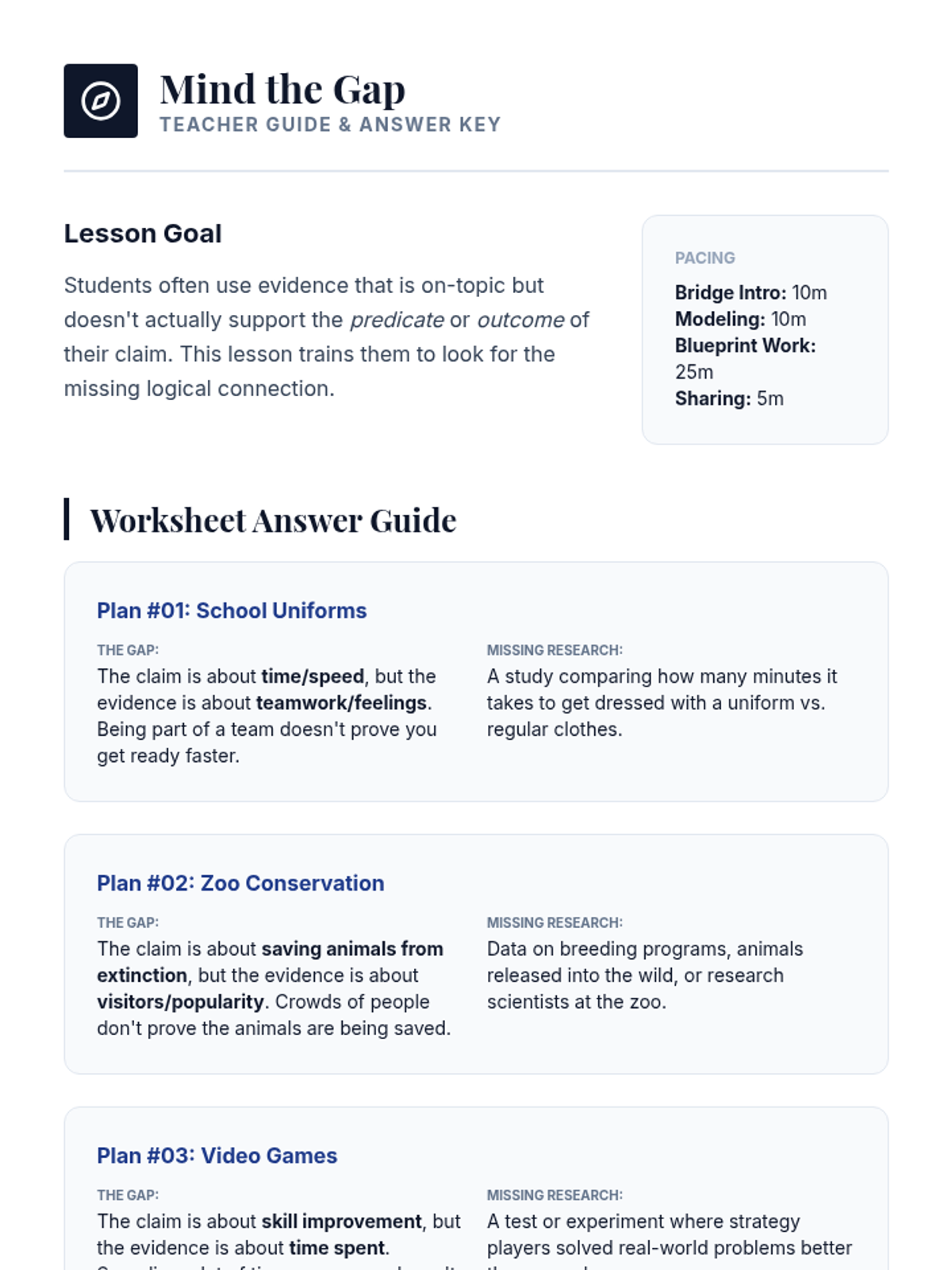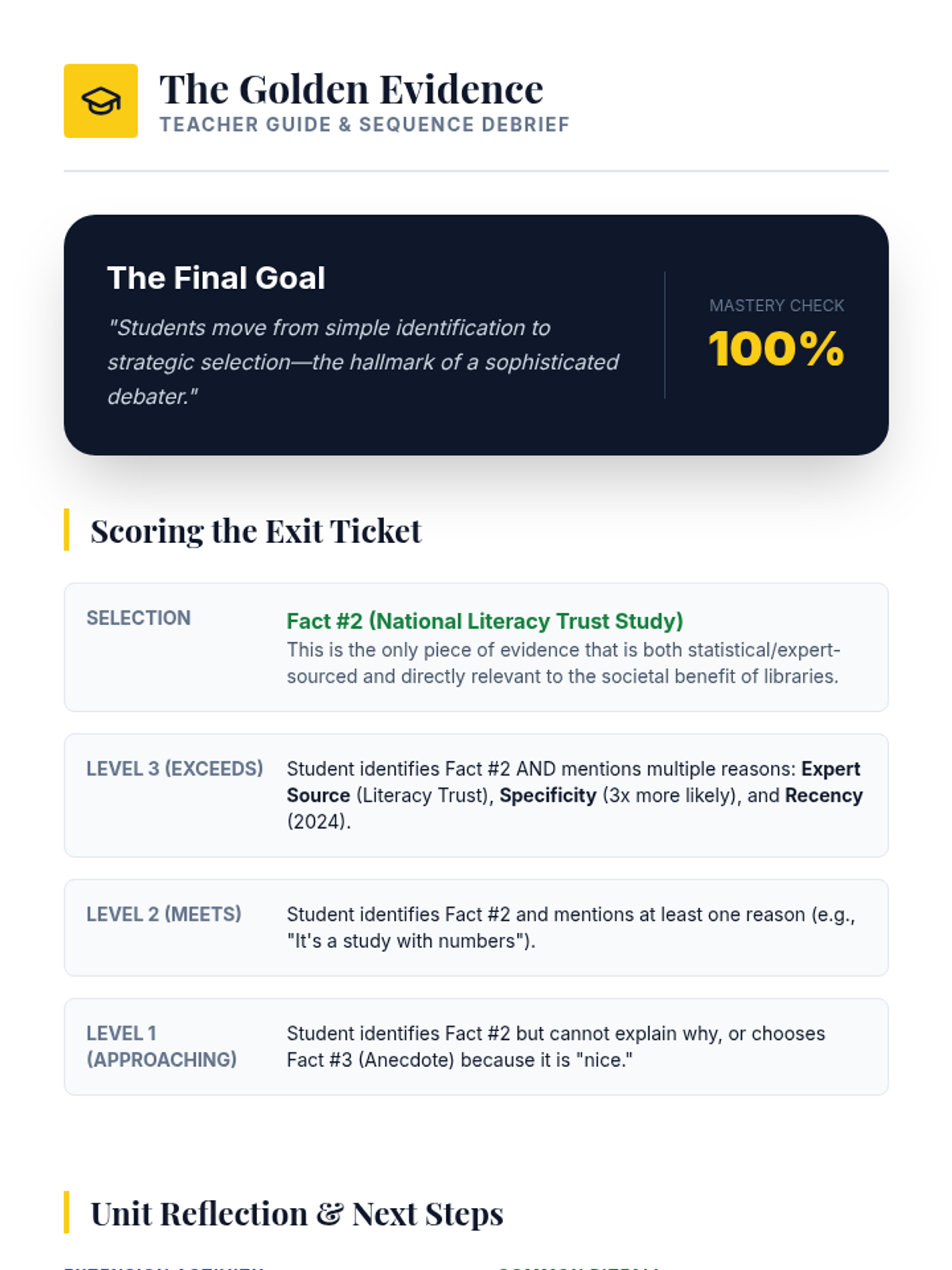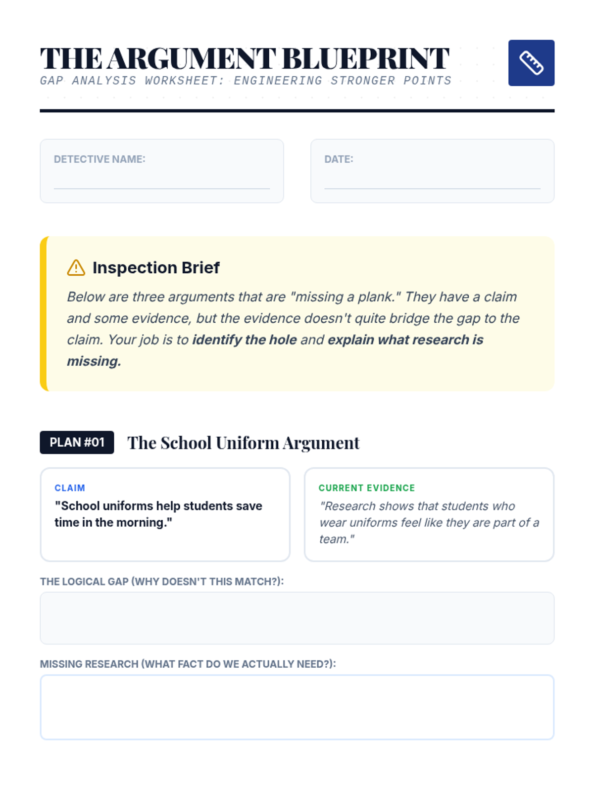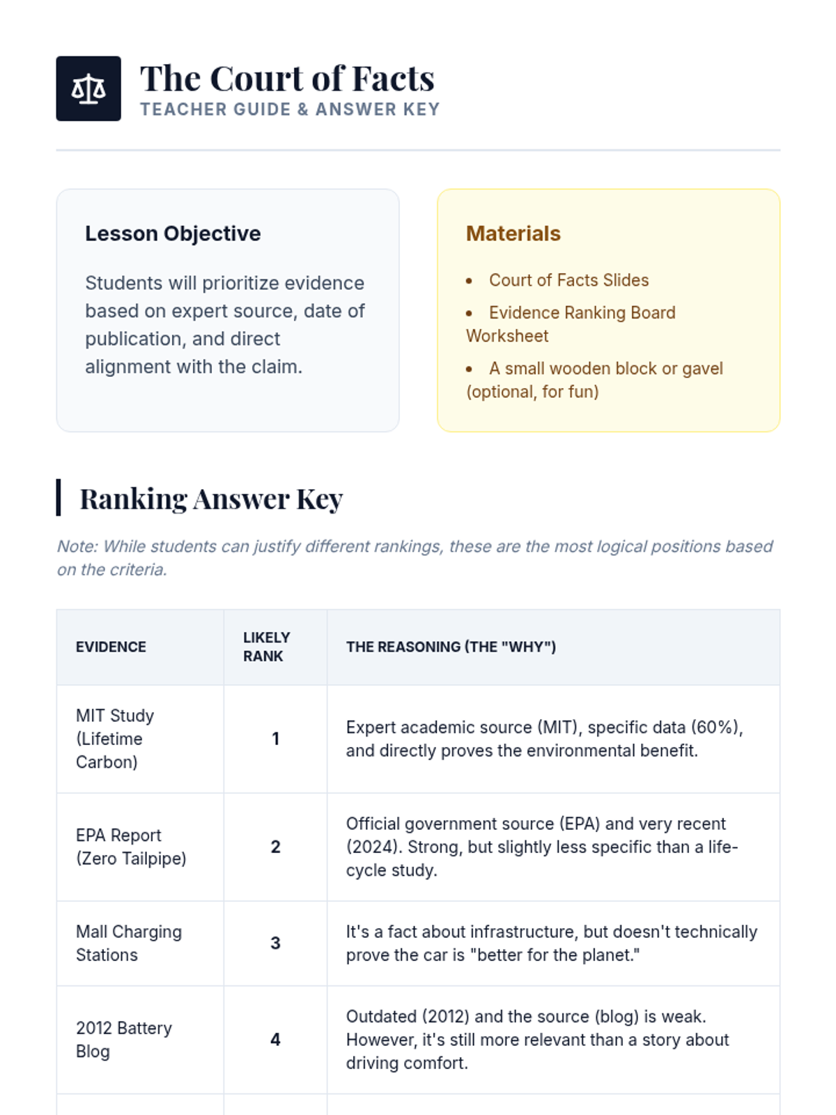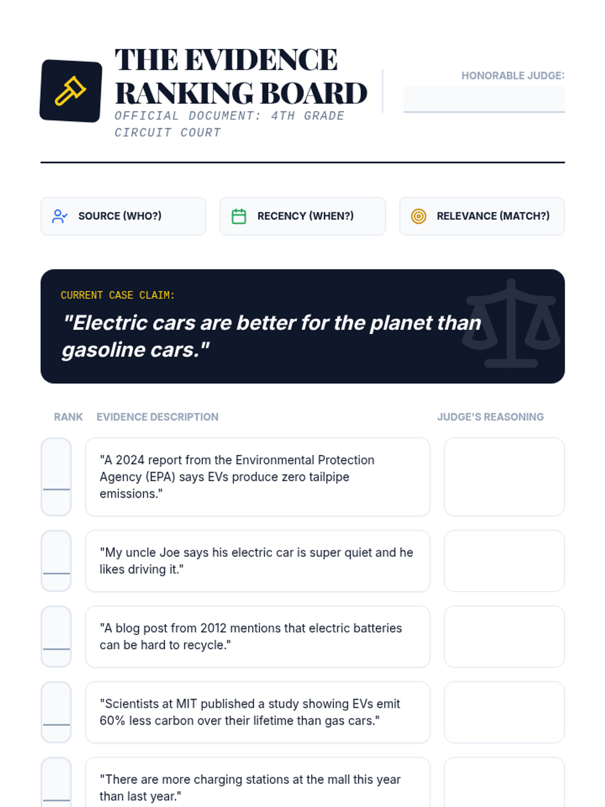 A detective-themed sequence where students become 'Evidence Detectives' to investigate, analyze, and rank the strength of research for debate. Through case studies and games, students learn to distinguish between relevant facts, anecdotes, and statistical data.