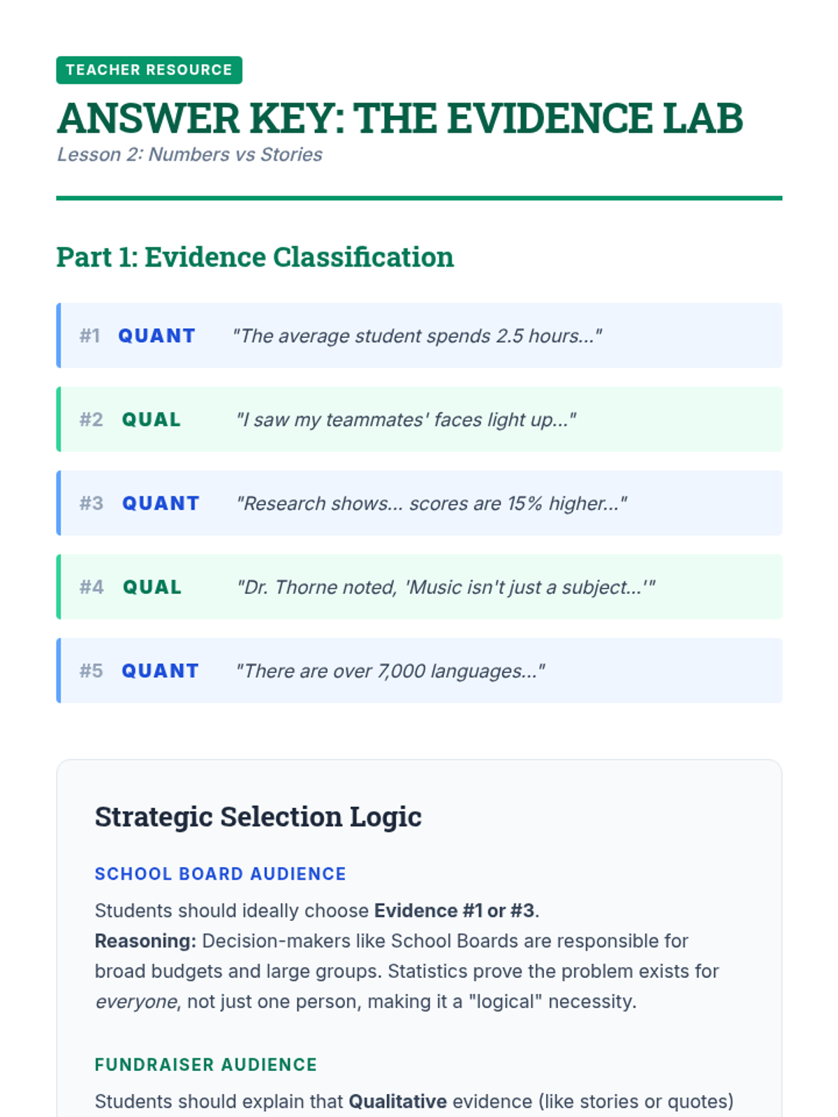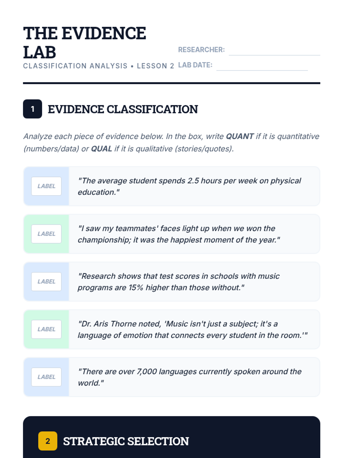 This sequence guides 6th-grade students through the process of identifying, categorizing, and evaluating evidence for debate. Students progress from distinguishing facts from opinions to masterfully ranking the quality of evidence based on authority, relevance, and recency.