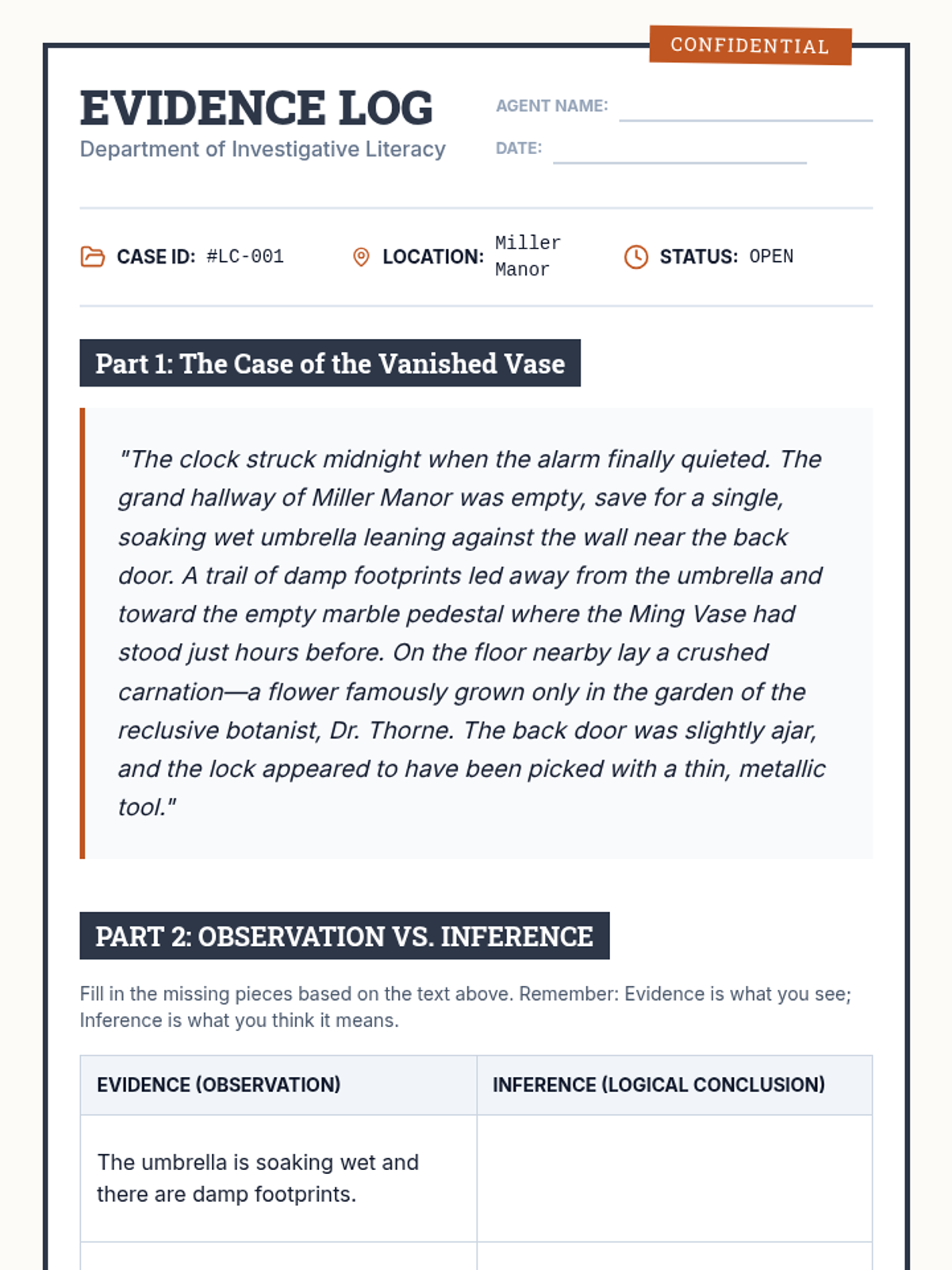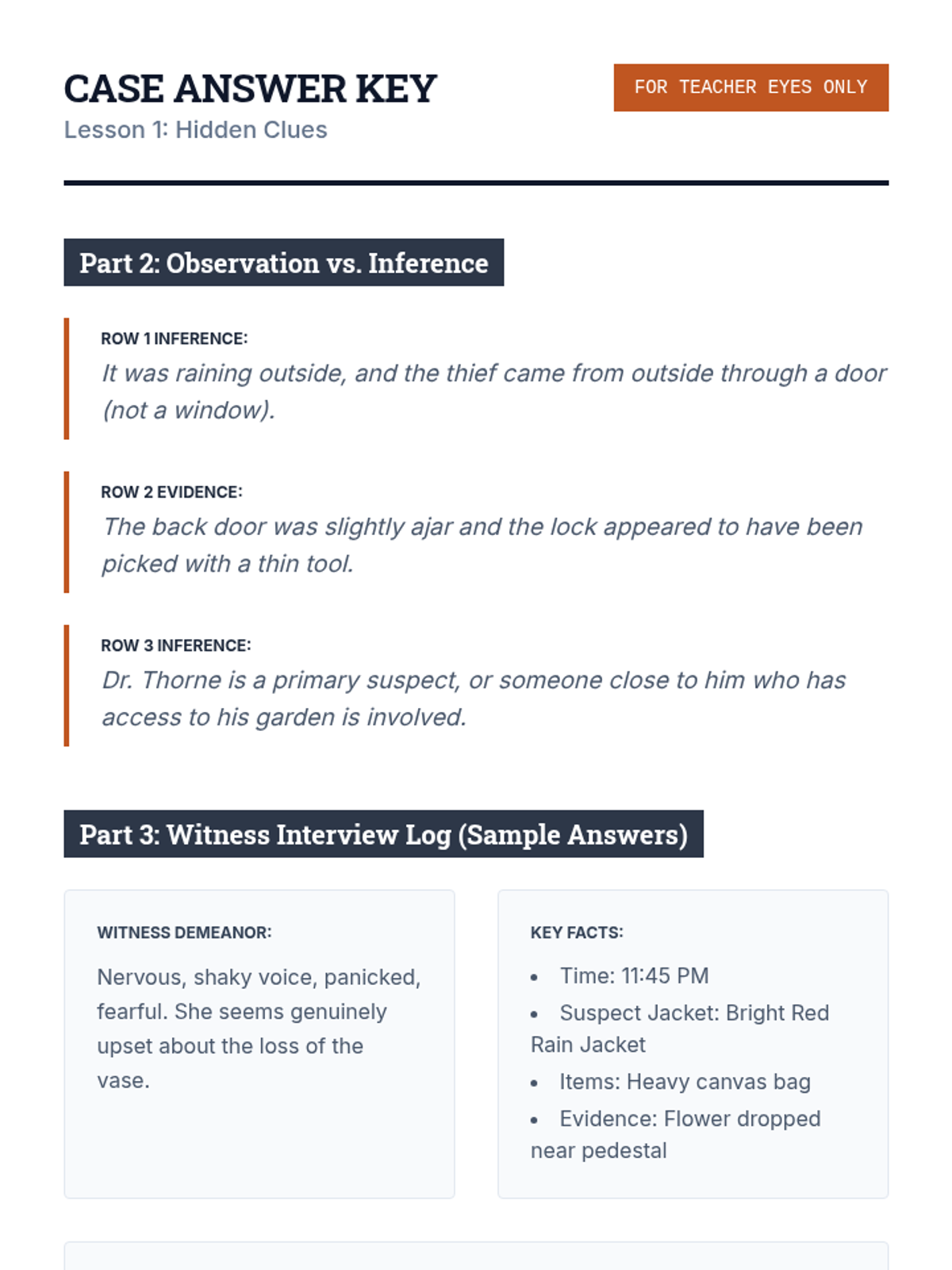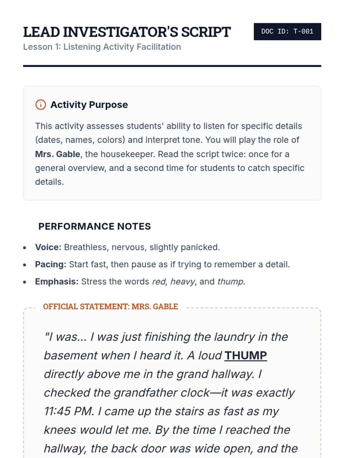 A comprehensive English Language Arts unit that uses a mystery-investigation theme to develop reading, writing, listening, and speaking skills. Students act as detectives to analyze evidence, interview witnesses, and present their final case.