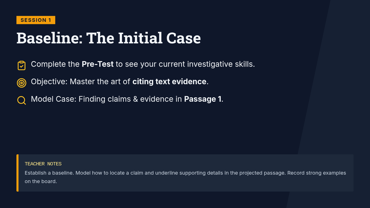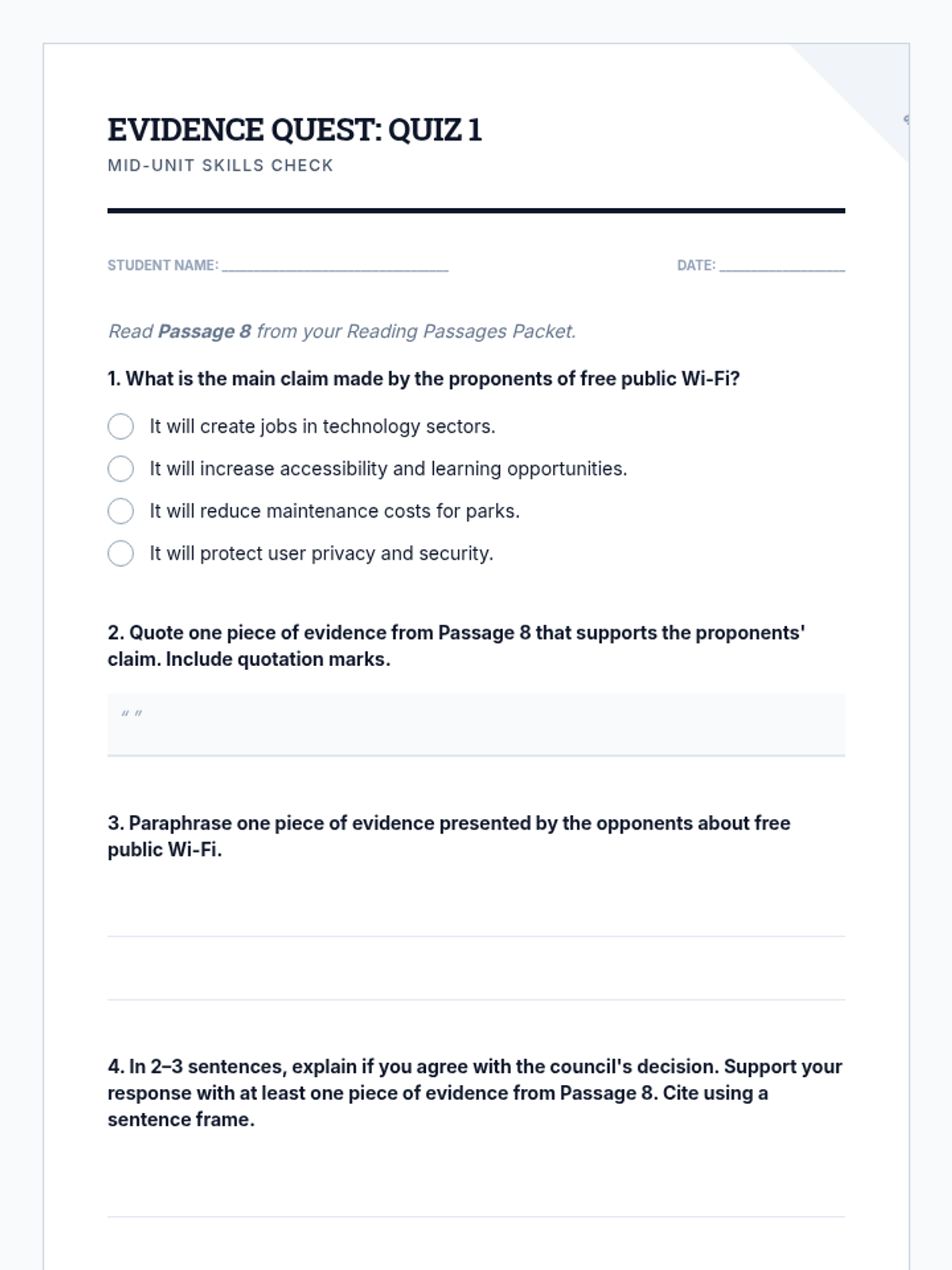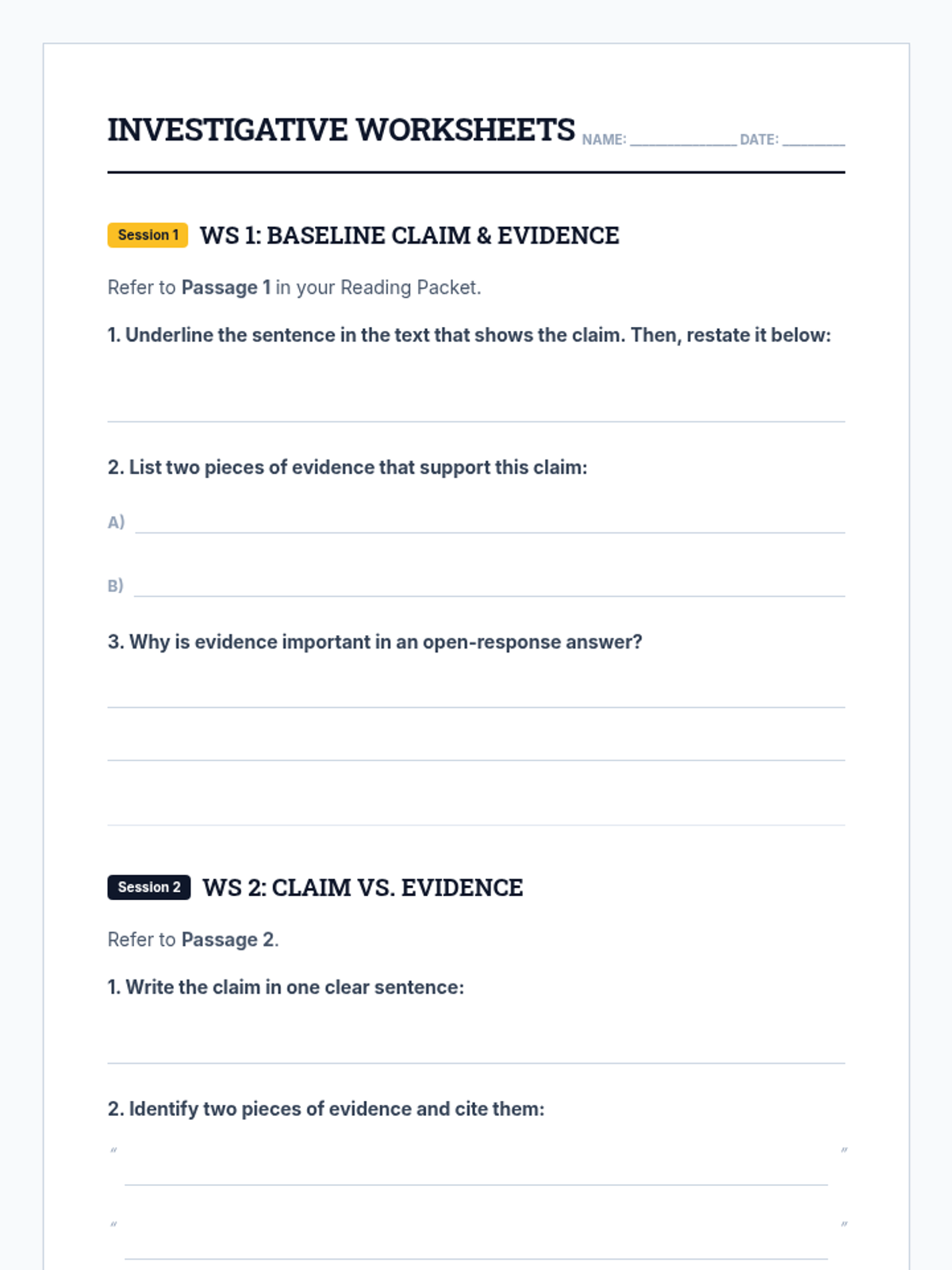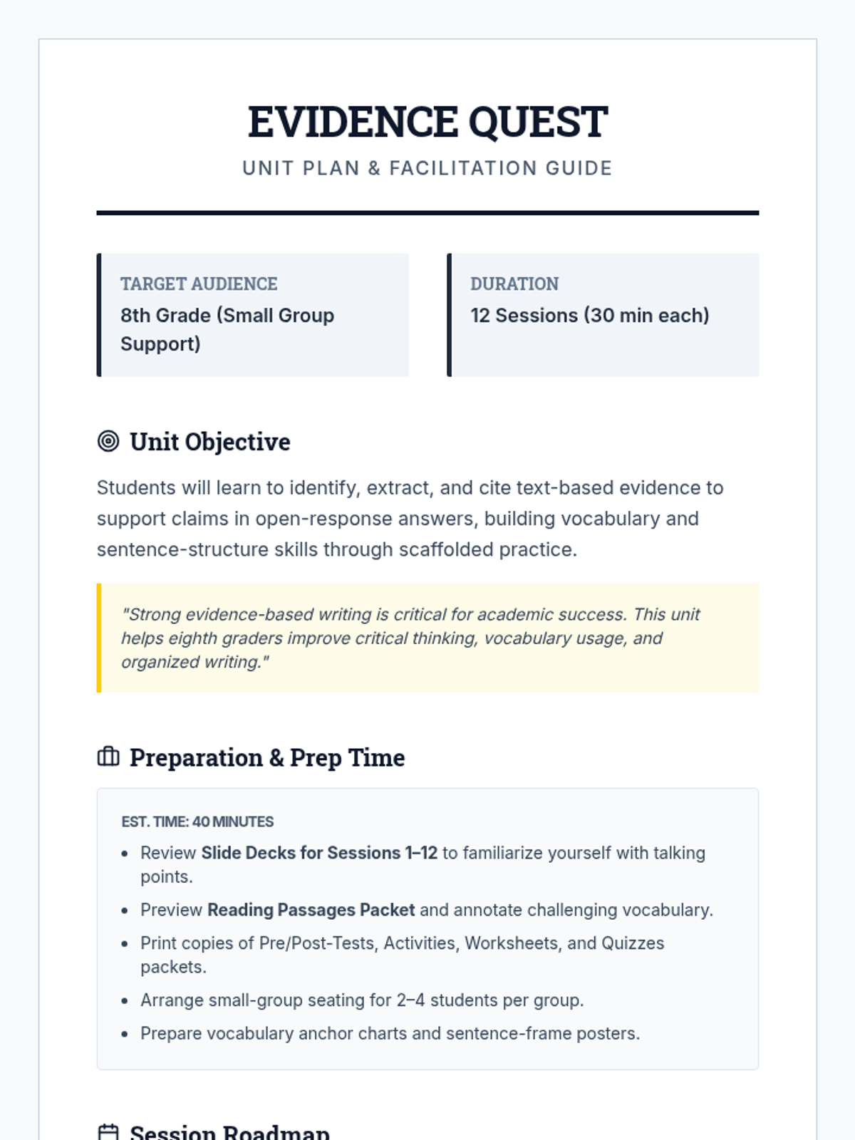 A 12-session unit for eighth graders focused on identifying, extracting, and citing text-based evidence to support claims in open-response writing.