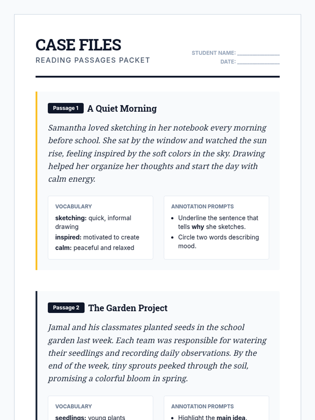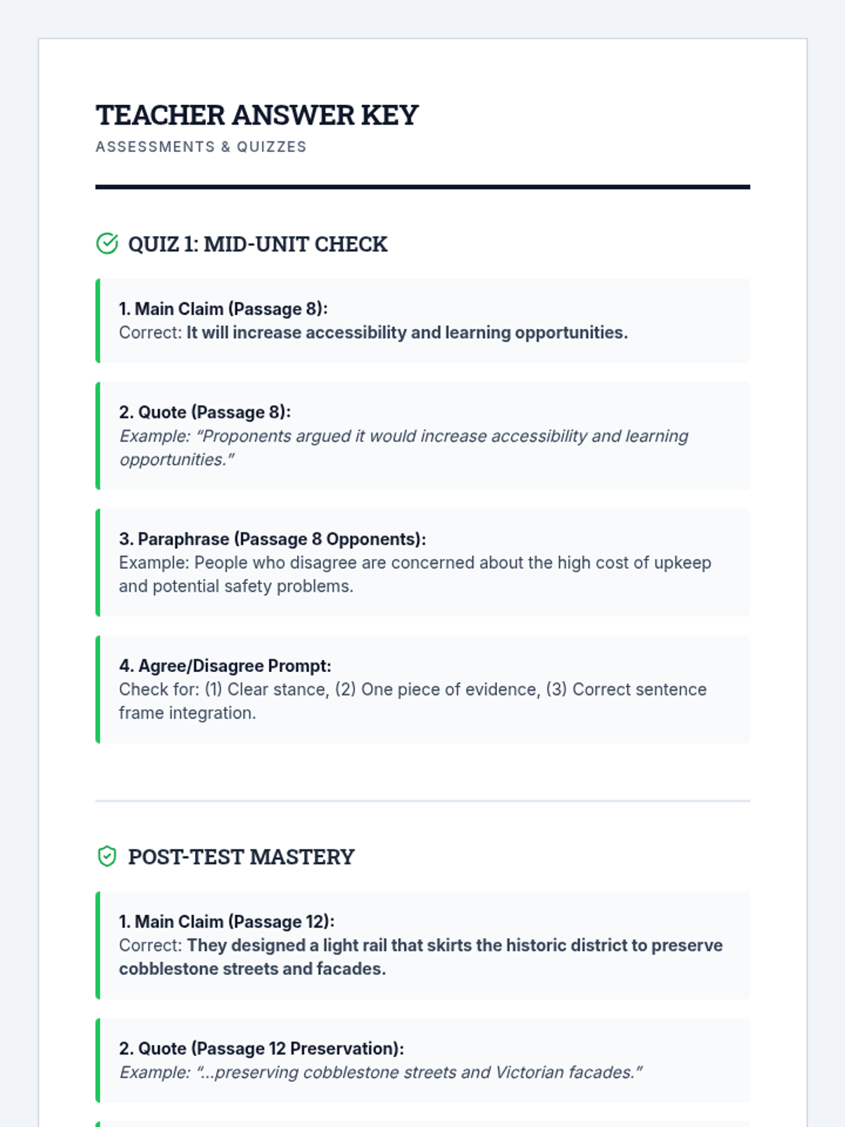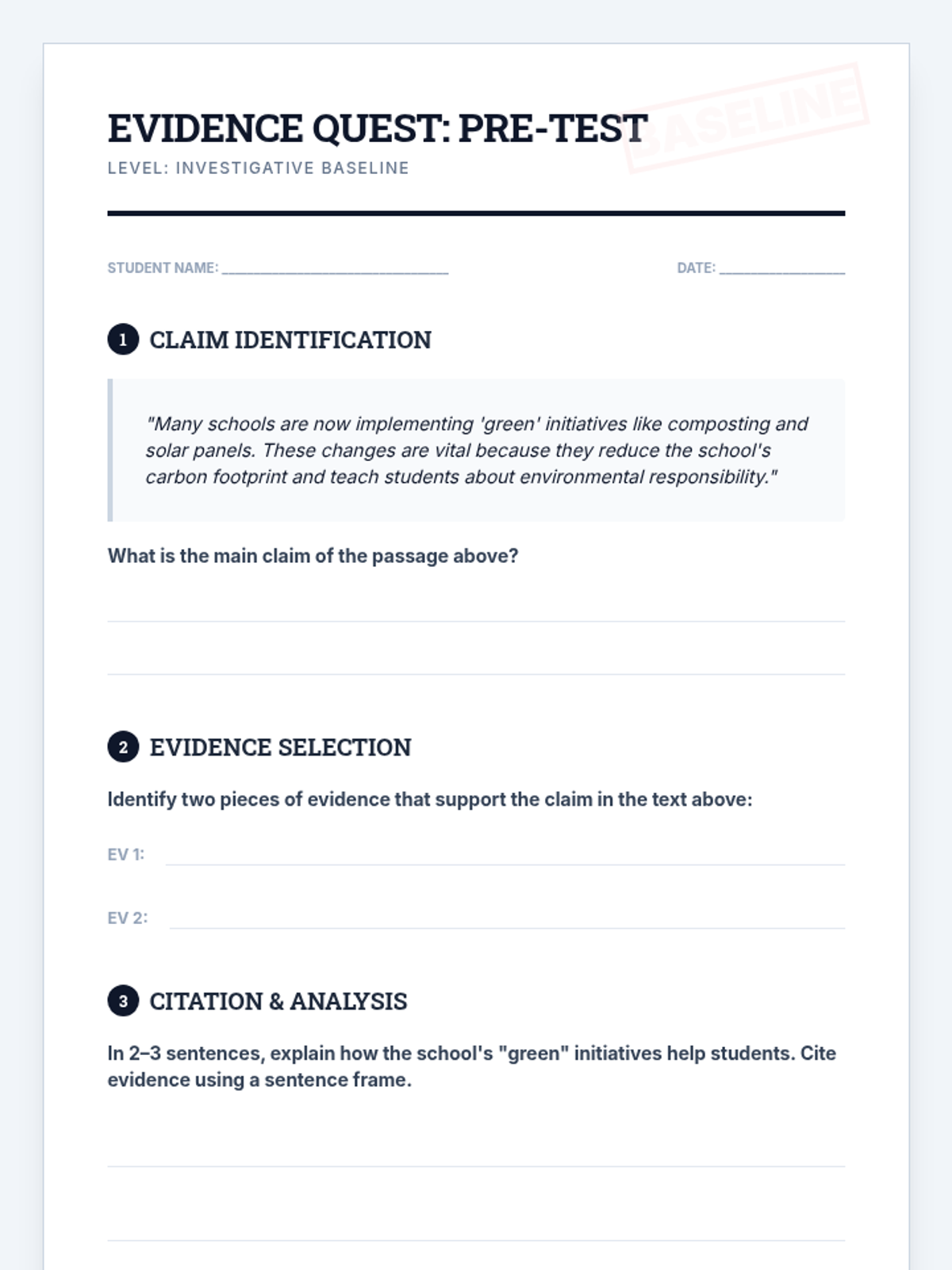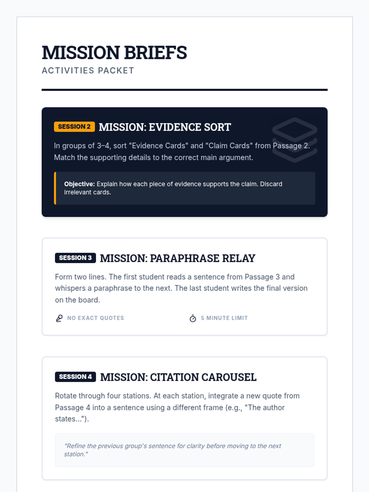 A 12-session unit for eighth graders focused on identifying, extracting, and citing text-based evidence to support claims in open-response writing.