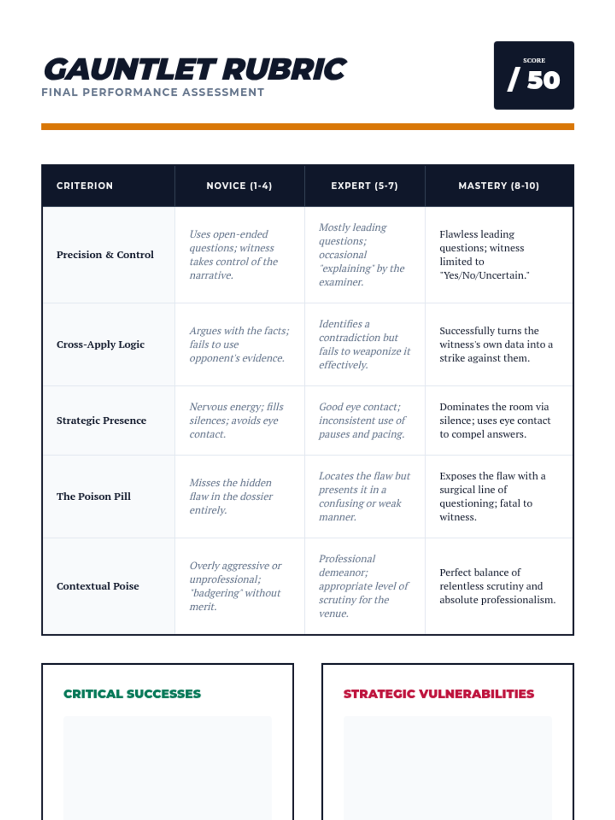 An advanced undergraduate sequence focusing on the art of cross-examination through evidentiary scrutiny, credibility impeachment, and psychological non-verbal strategies in legal and academic contexts.