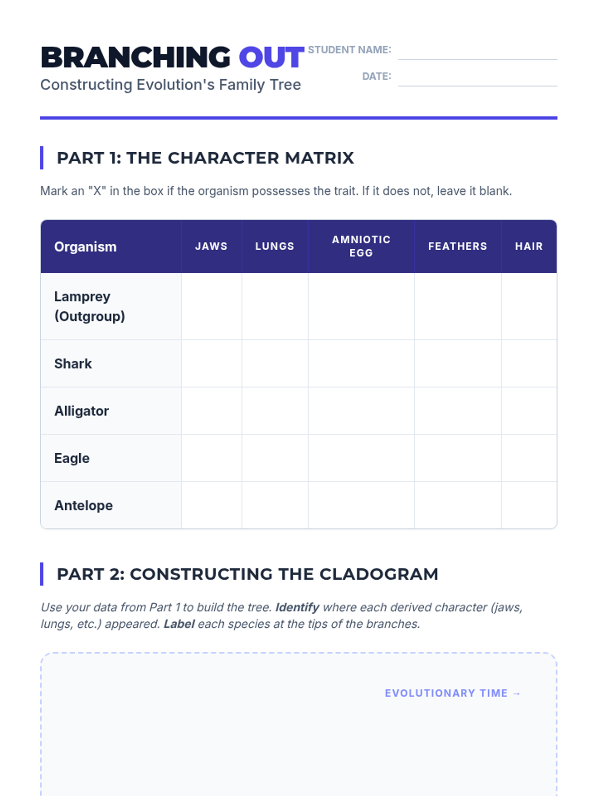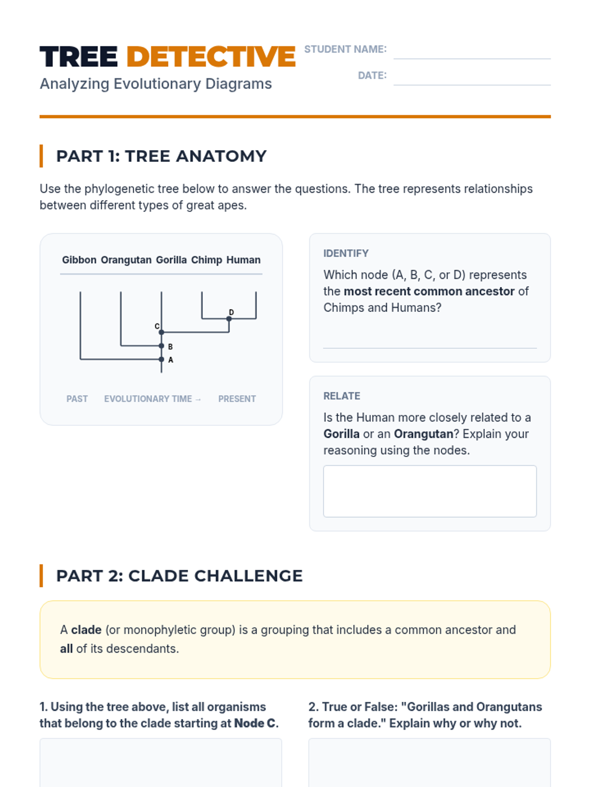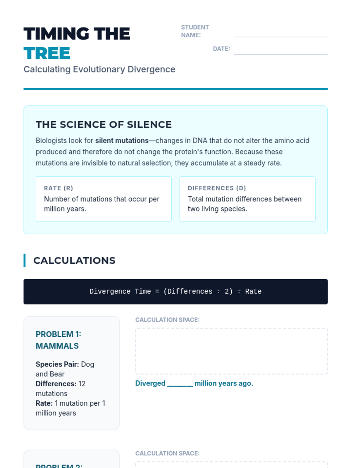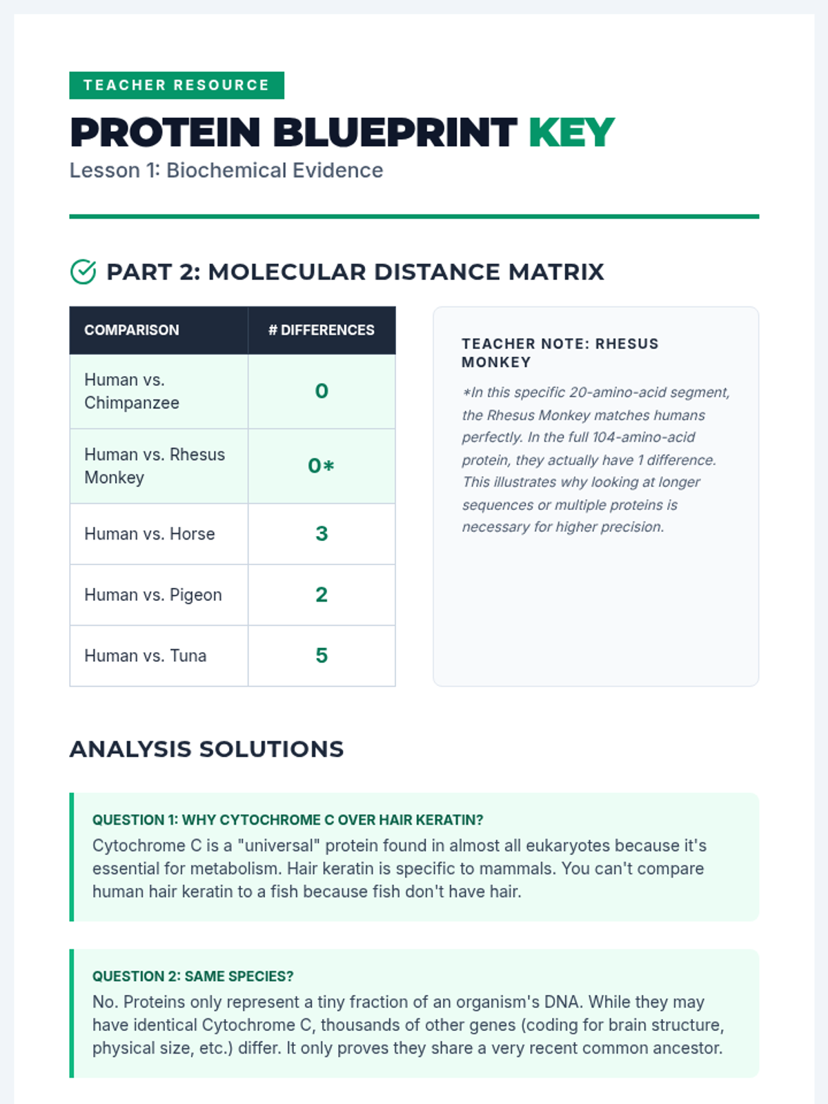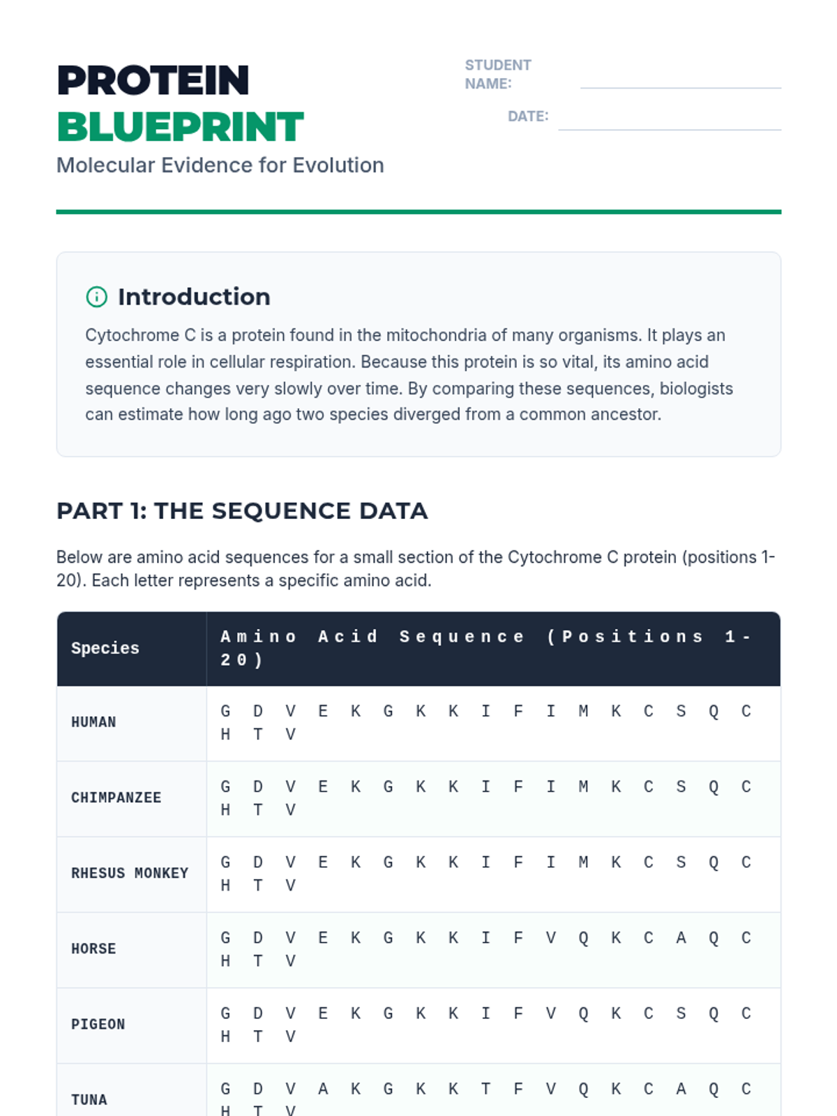 This sequence explores how molecular biology provides evidence for evolution, teaching students to construct and interpret phylogenetic trees using DNA and protein data. Students progress from basic sequence comparison to complex bioinformatics investigations.