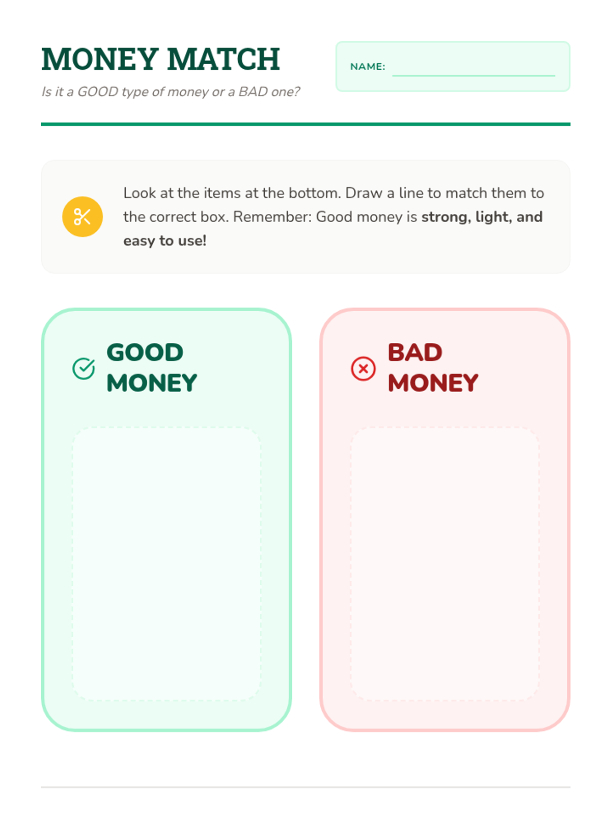 A 1st Grade financial literacy unit exploring the origins of money, the concept of value, why prices change (inflation), and the connection between work and purchasing power. Students move from understanding barter systems to planning their own purchases.