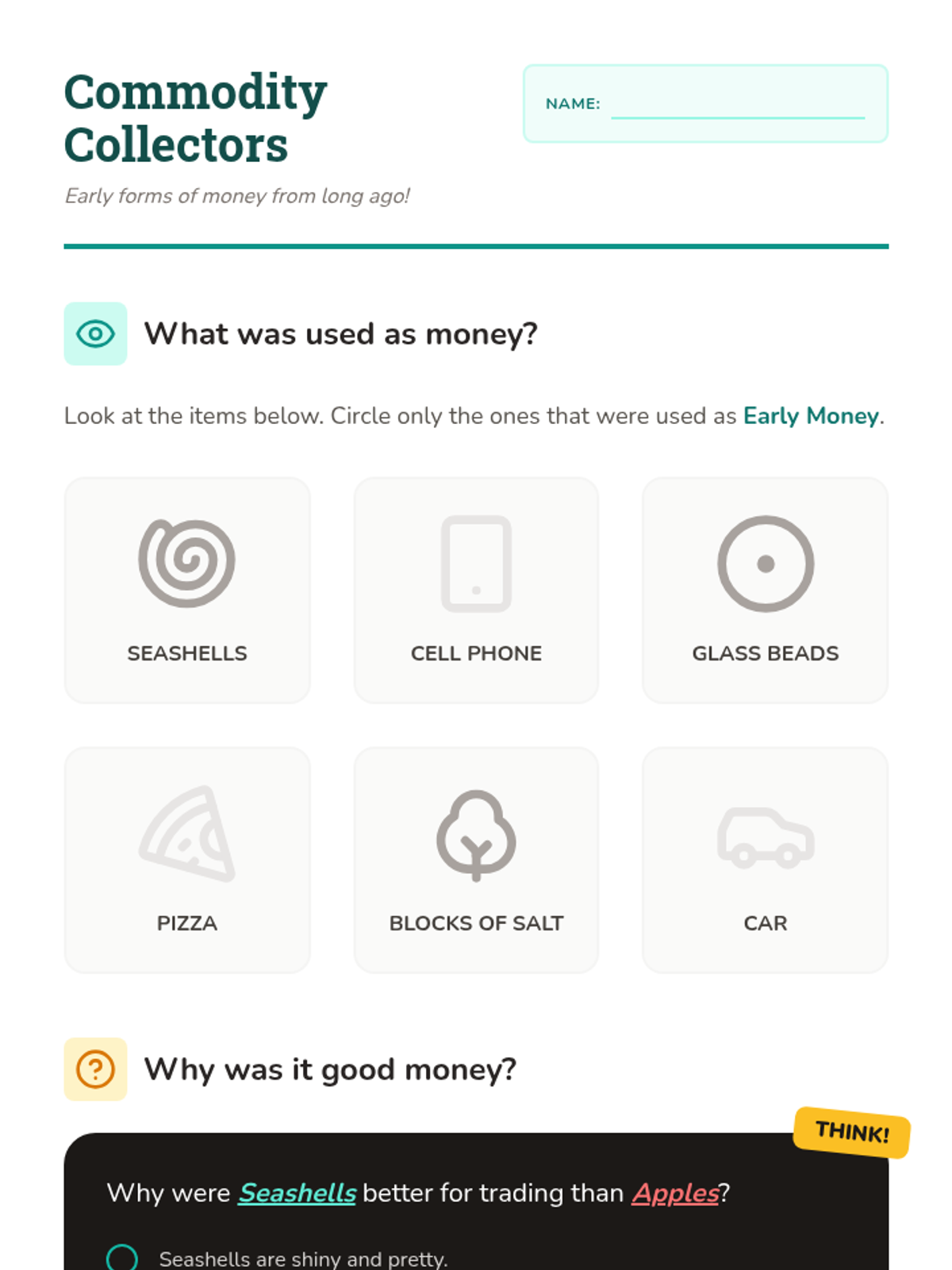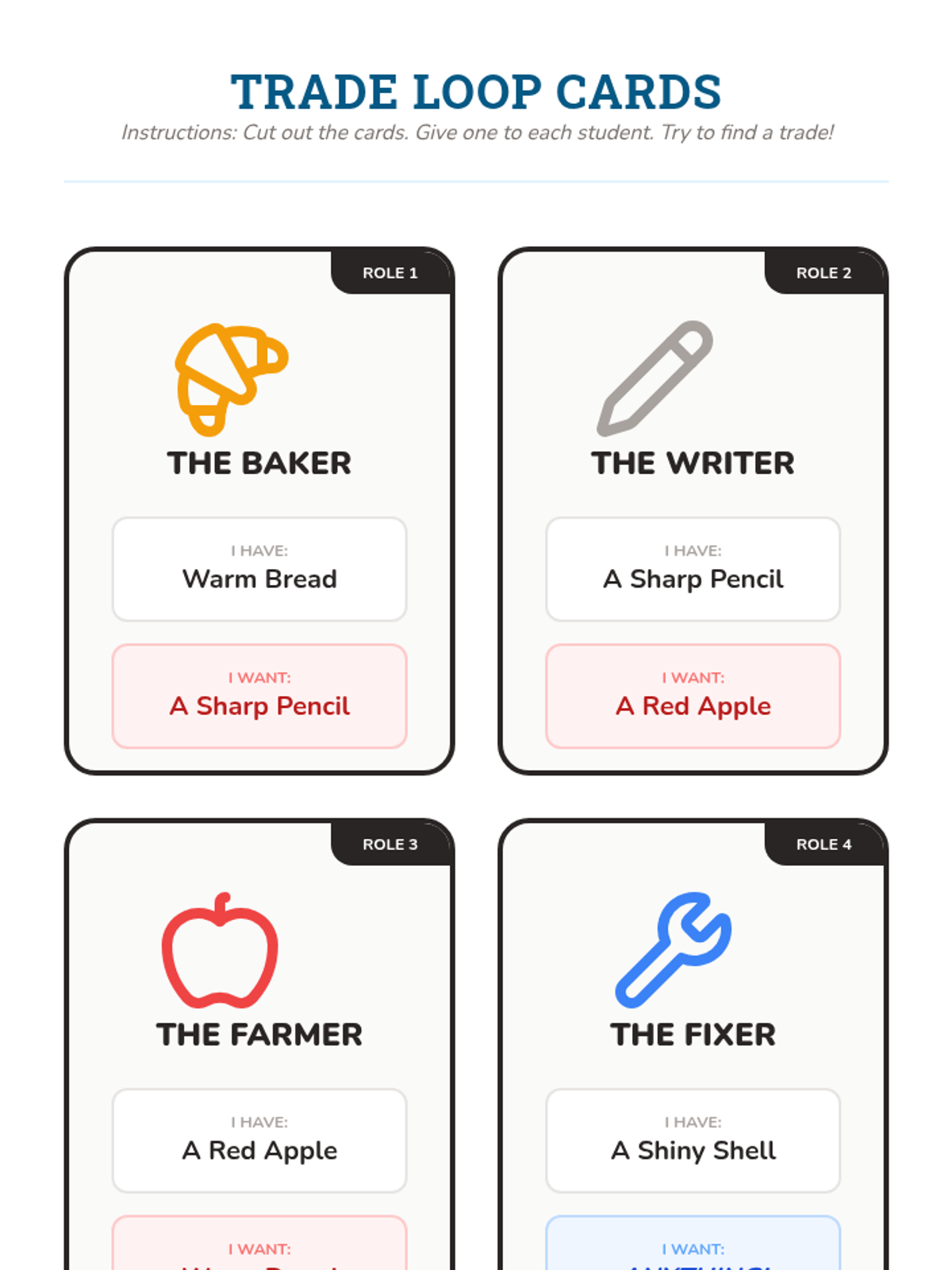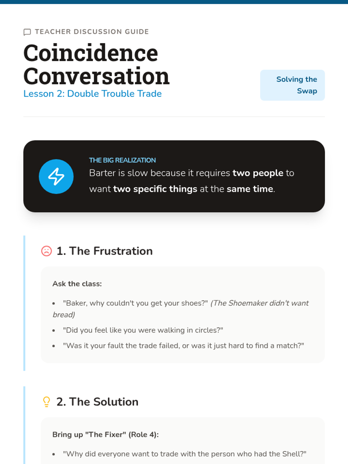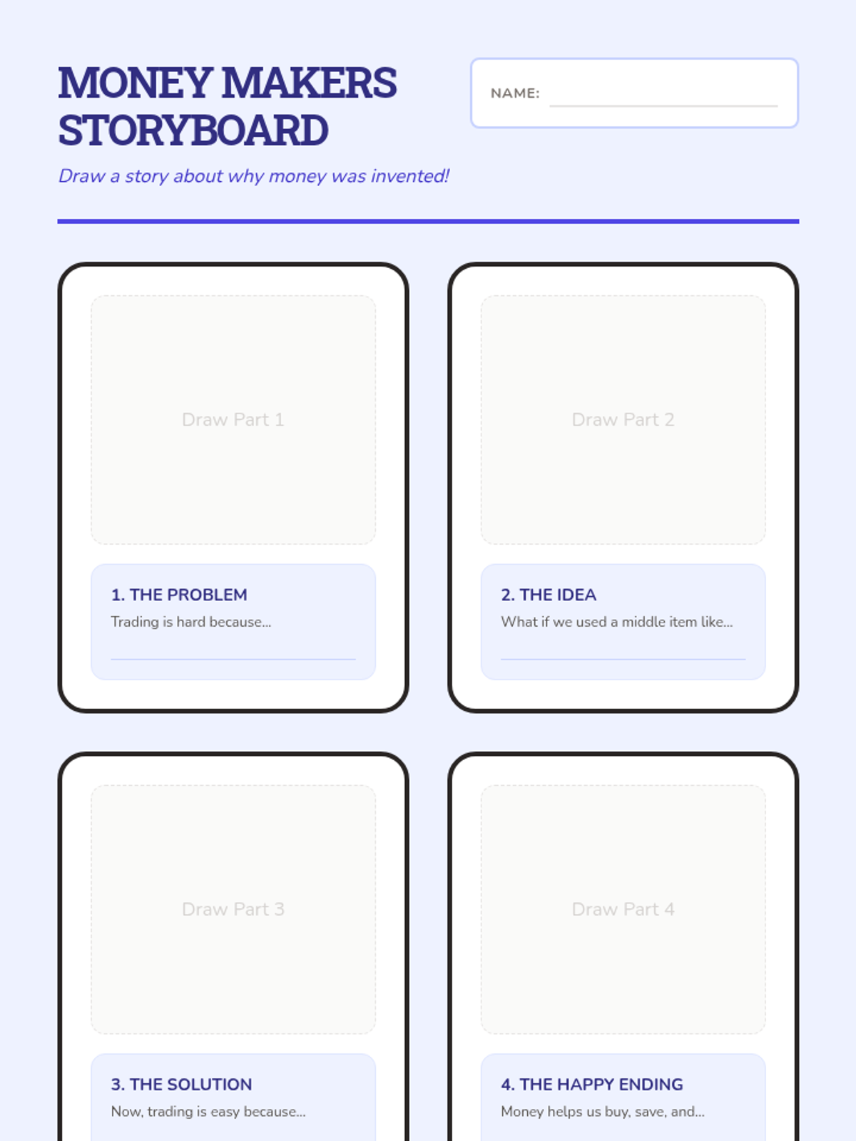 A 1st Grade sequence exploring the evolution of exchange, from the difficulties of bartering to the convenience of modern currency, helping students understand money as a problem-solving tool.